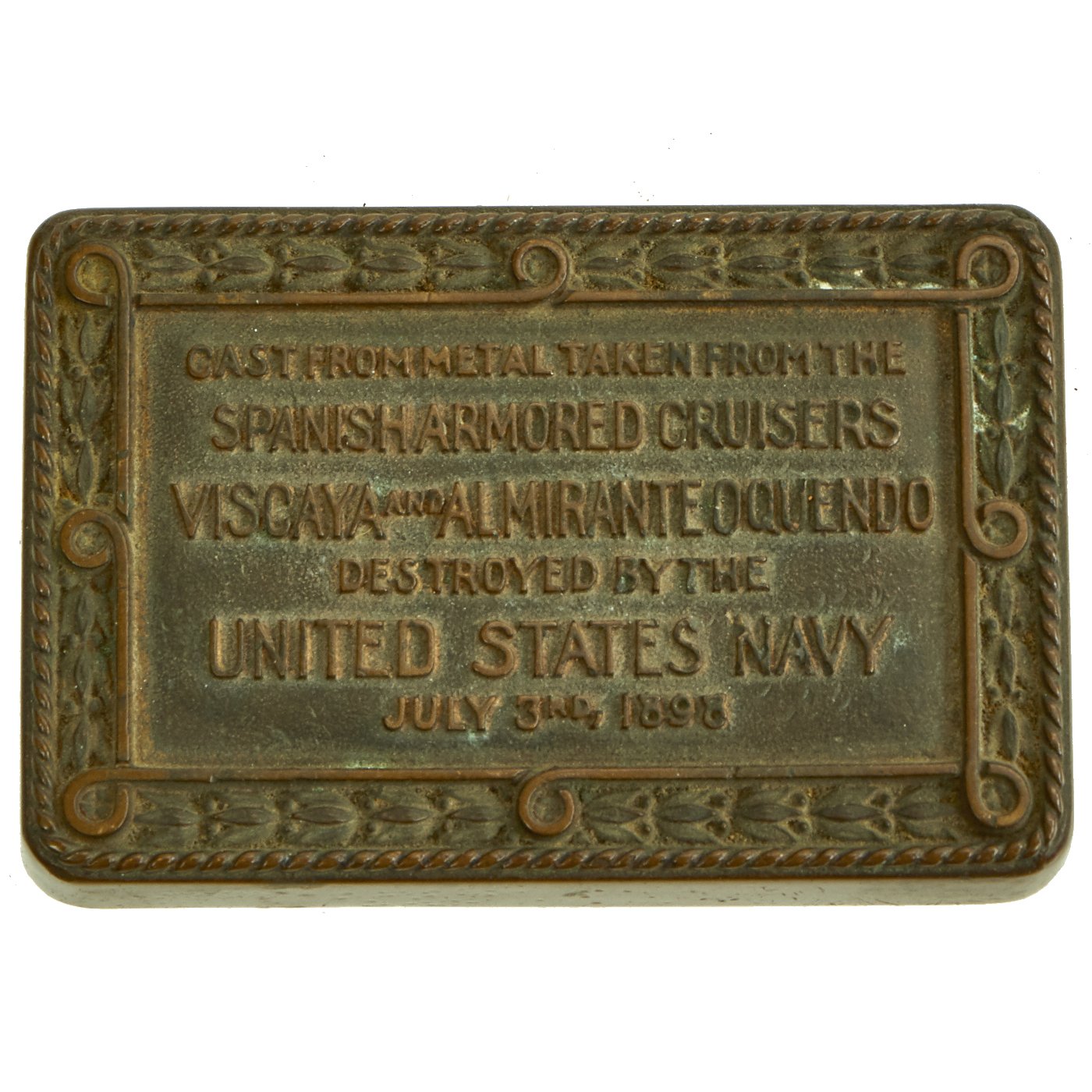 Original Item: Only One Available. This is a fantastic "made from" relic from the Spanish American War of 1898 . This is a very rare and ornate brass paperweight which states that it is: "CAST FROM METAL TAKEN FROM THE SPANISH ARMORED CRUISERS VISCAYA AND ALMIRANTE OQUENDO DESTROYED BY THE UNITED STATES NAVY JULY 3RD, 1898".