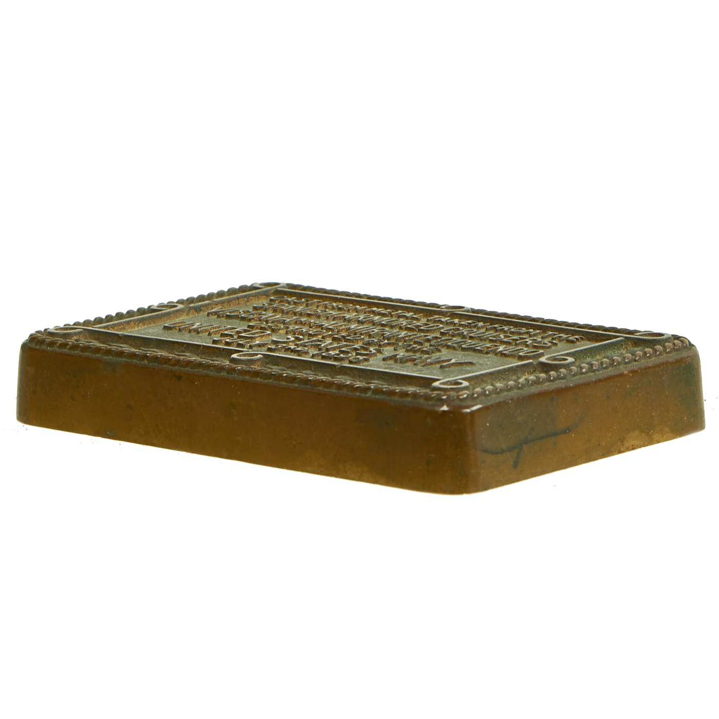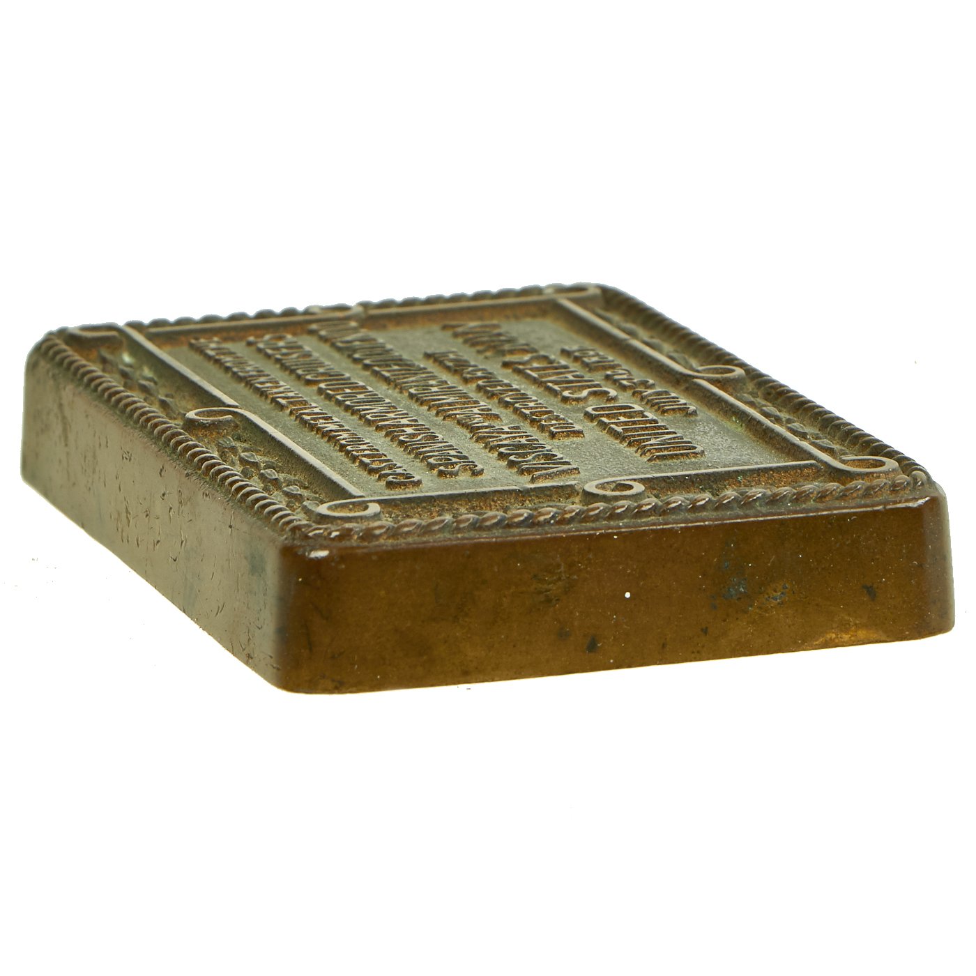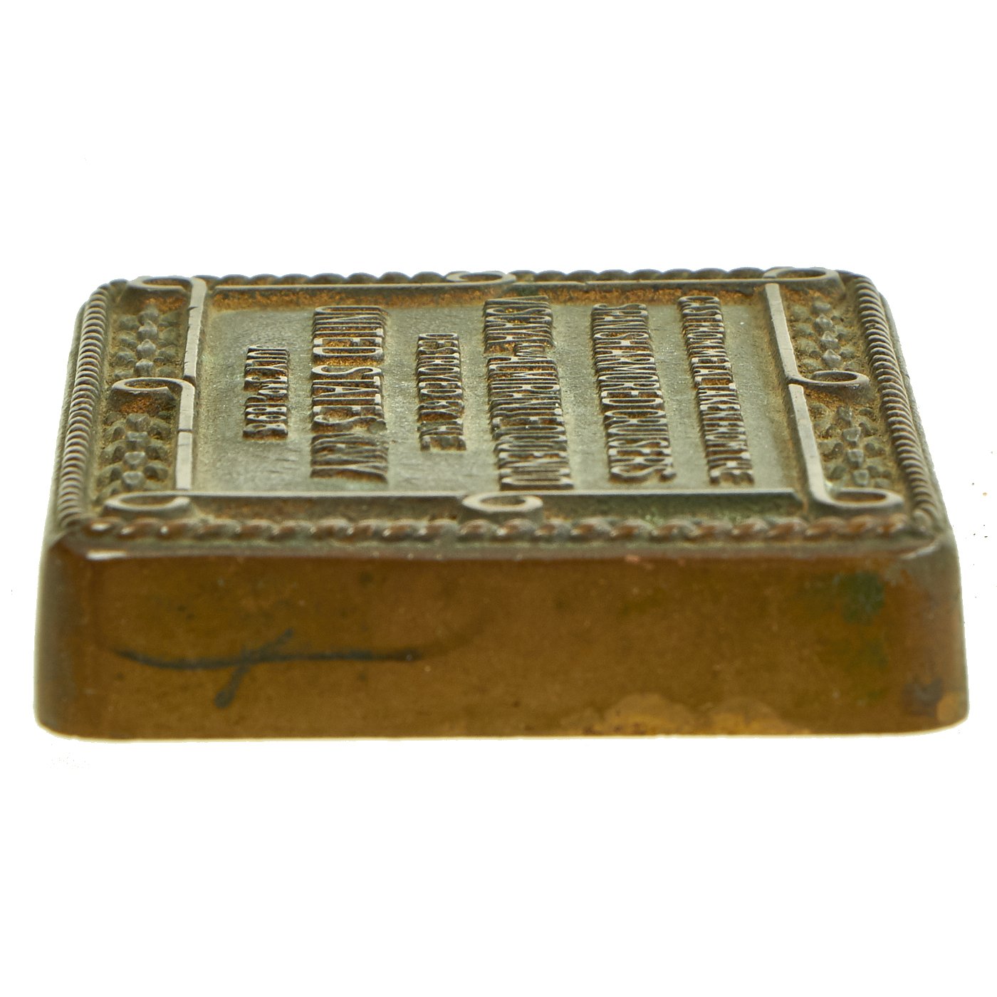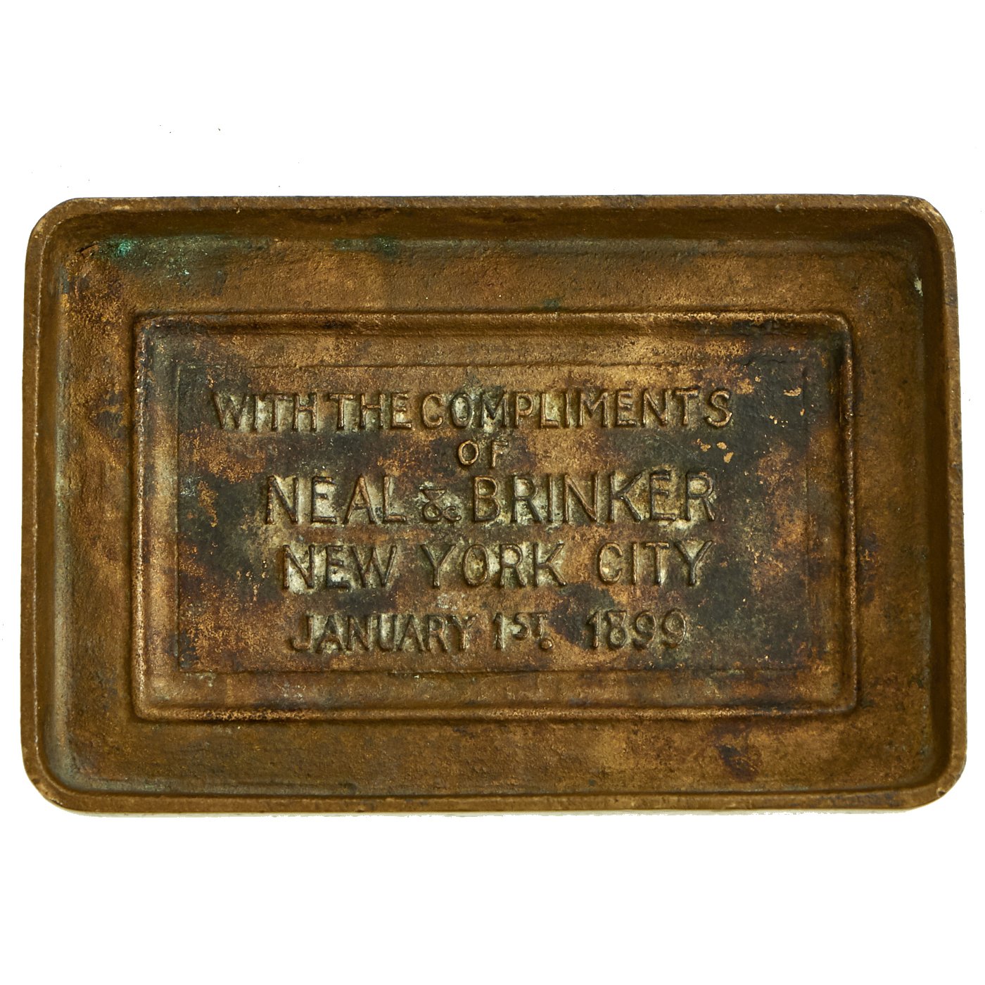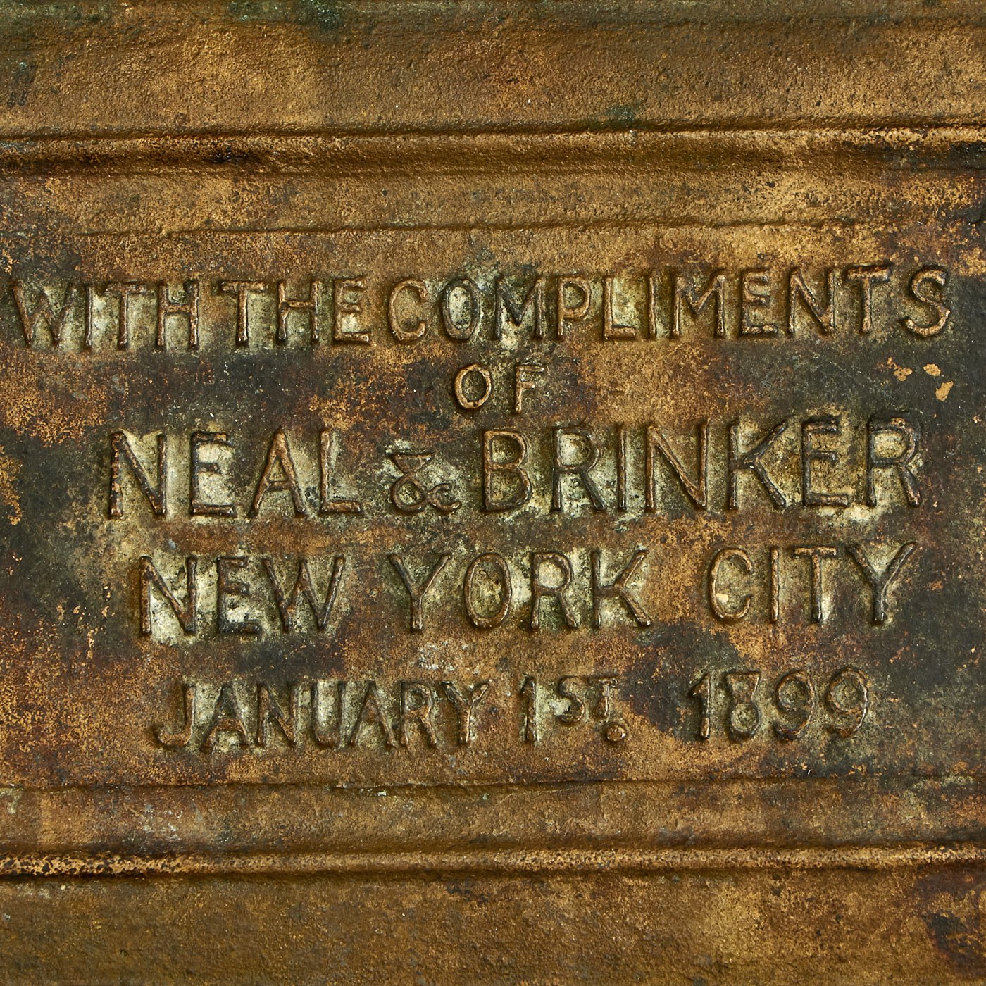 The reverse side states that it was a New Years' gift - "WITH THE COMPLIMENTS OF NEAL & BRINKER, JANUARY 1ST, 1899". This ornate paperweight measures app. 4" x 2-1/2" x 5/8". It is in excellent condition with a very nice patina.