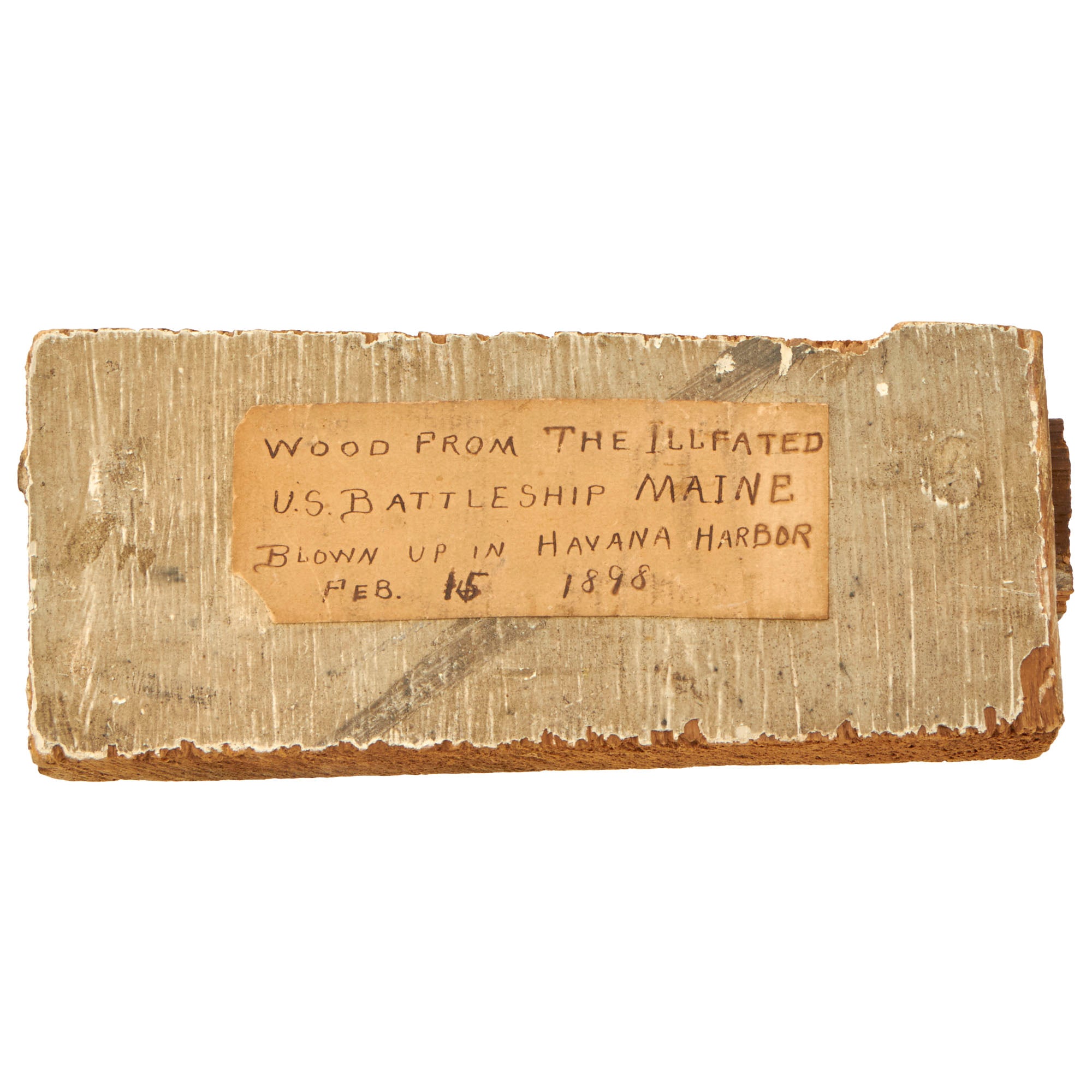 Attached to the piece is an old paper period handwritten tag reads: WOOD FROM THE ILL FATED U.S. BATTLESHIP MAINE BLOWN UP IN HAVANA HARBOR FEB. 15 1898