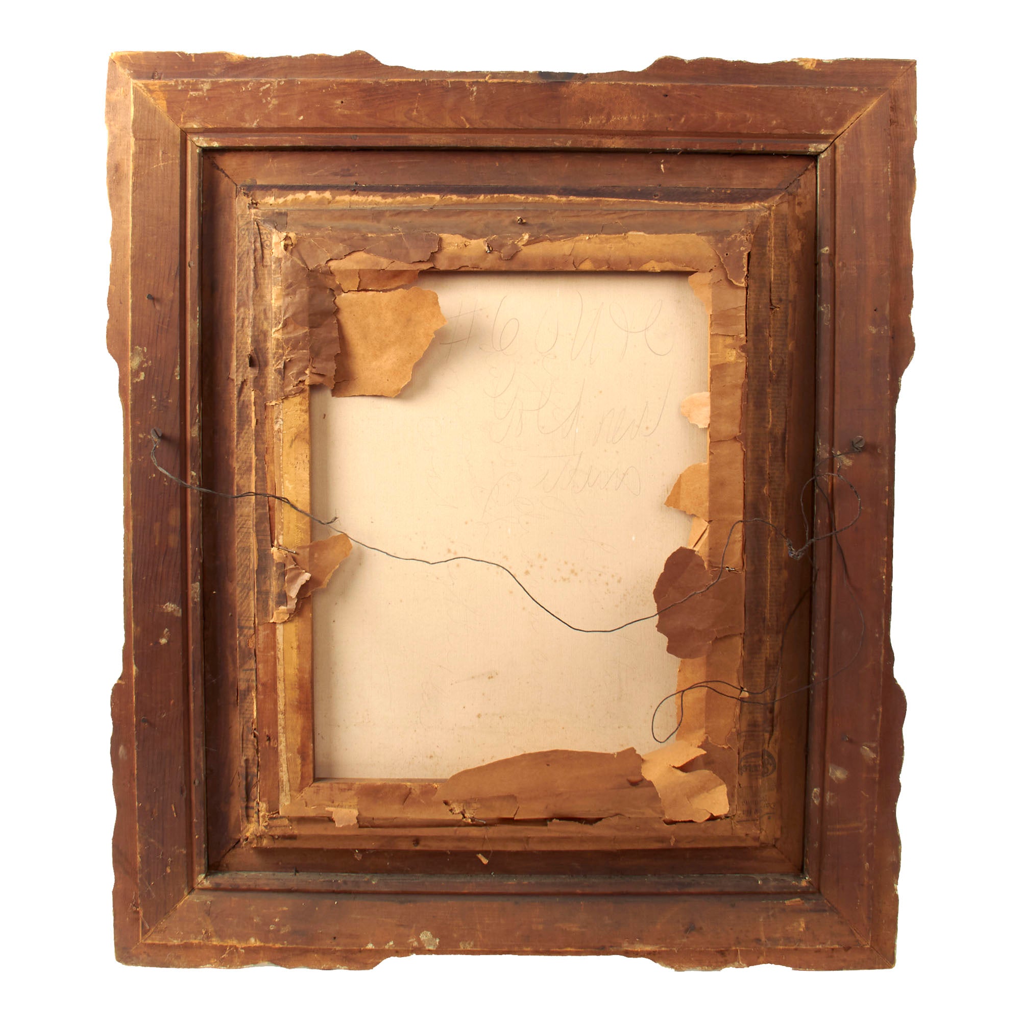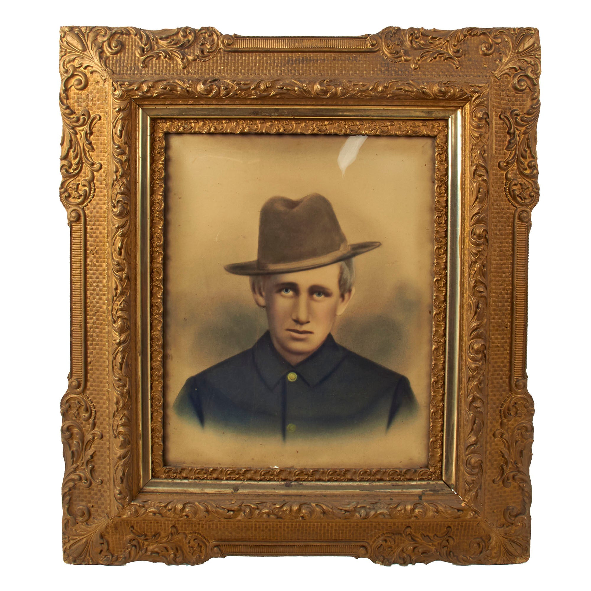 - Original Item: One-of-a-kind. This is a framed image of a young soldier dressed in a Pattern 1885 Five Button Fatigue Jacket and wearing a Pattern 1883 Campaign hat. The gilt painted frame measures approximately 28" x 32" and the image itself measures approximately 16" x 20". The image appears to be an early type of photograph (Albumen print?) that was painted over to add color and tone. Overall condition of the image is excellent, the frame is old with repairs and dame but will display nicely.