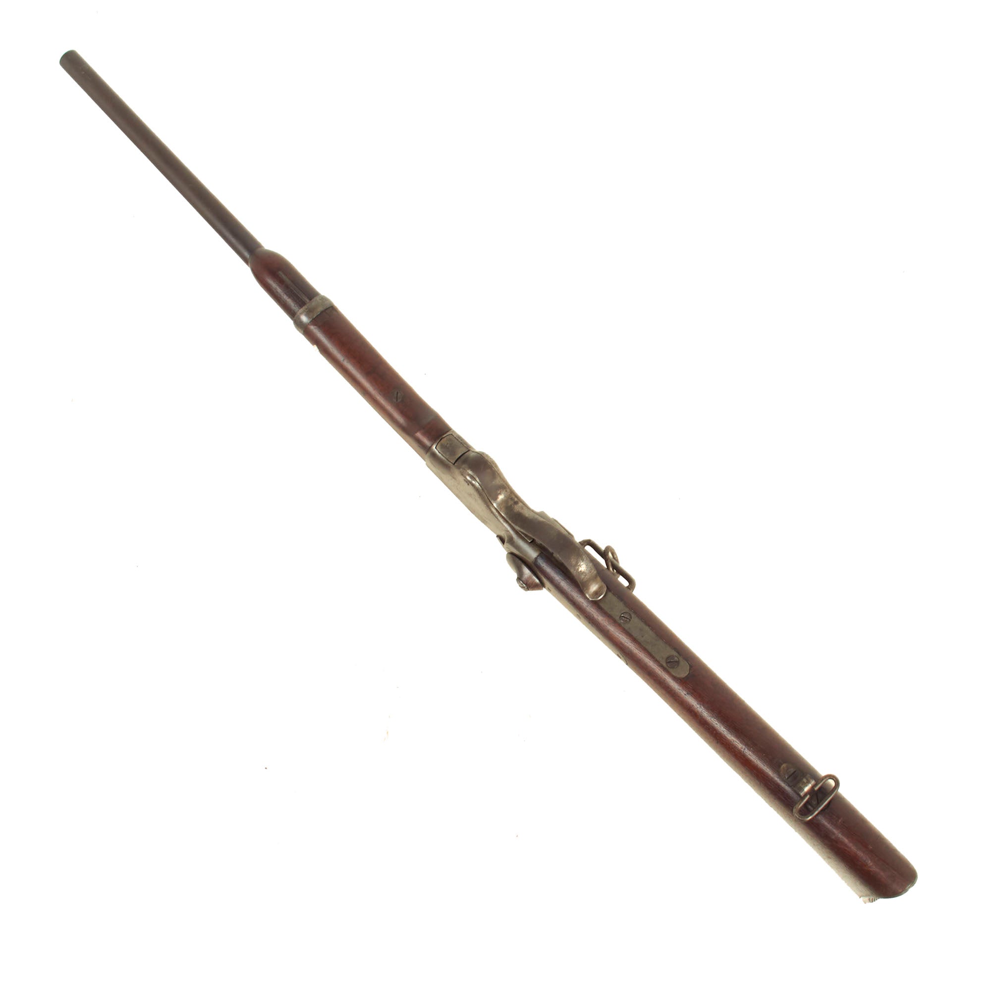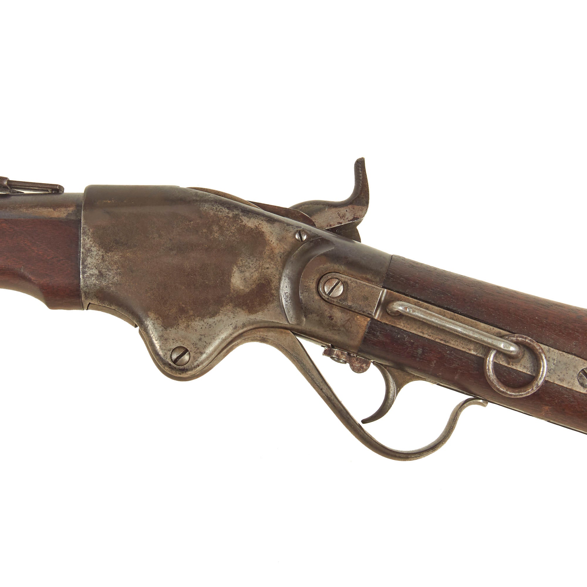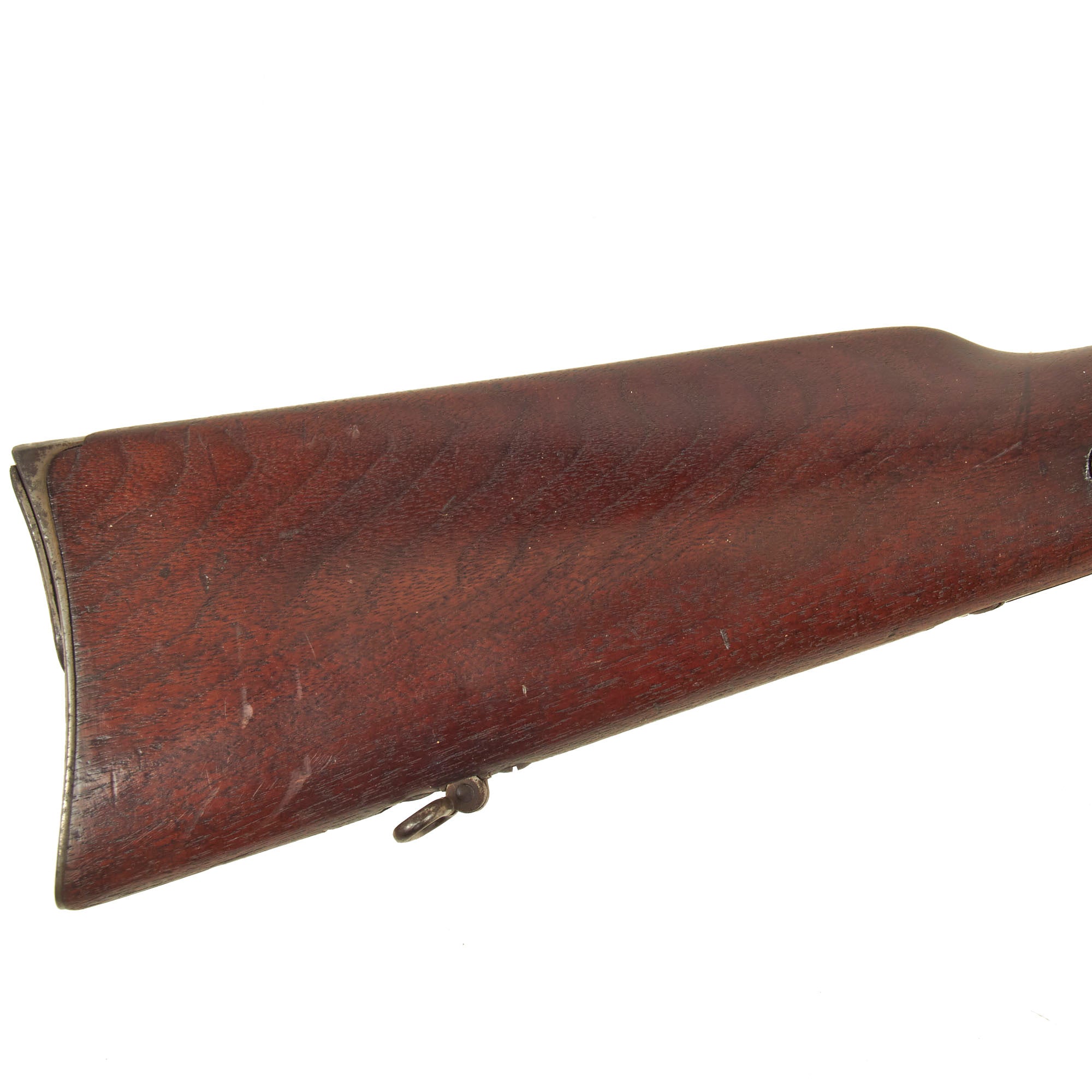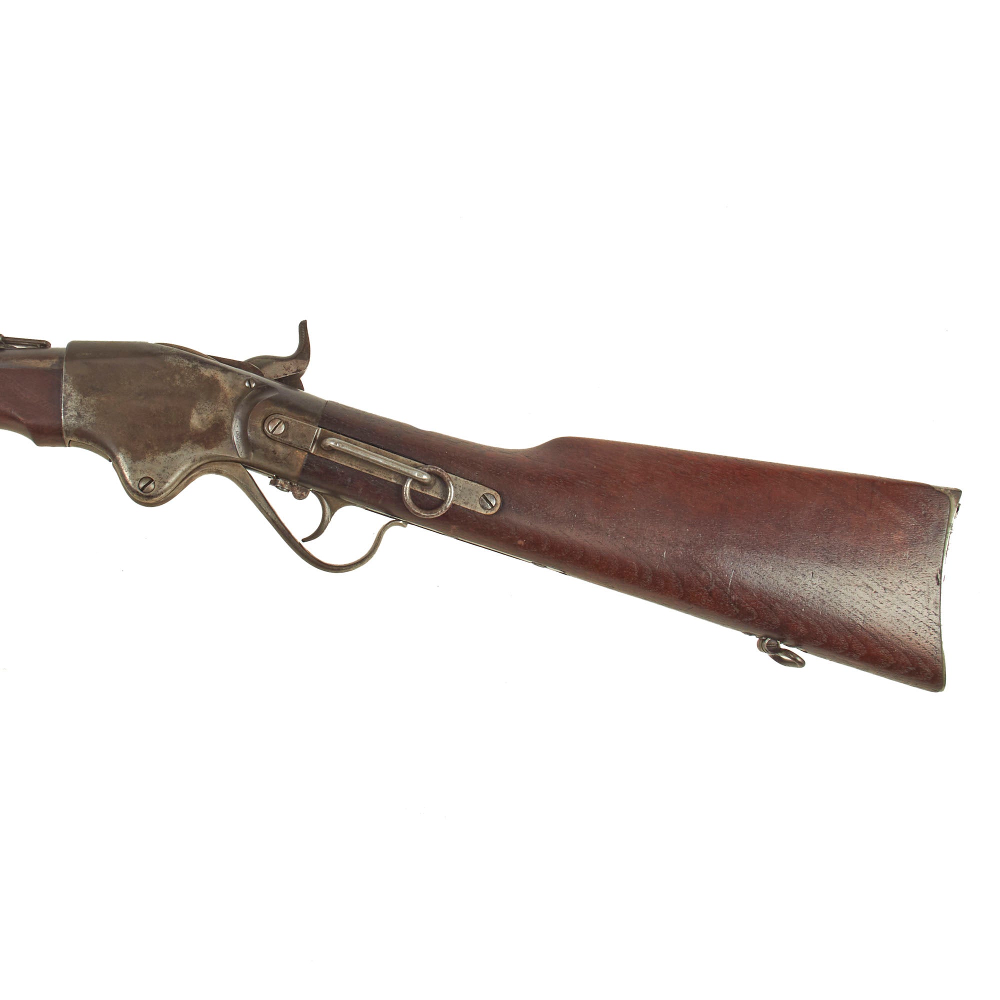 Original Item: Only One Available. This is a very interesting example of a genuine Spencer Repeating Rifle Company Saddle Ring Repeating Carbine. It looks to have started life as a Civil War issue Model 1860 carbine, with serial number 29617 indicating early 1864 manufacture. This number is also too high to be a Spencer produced Model 1865. It is however fitted with a 20 inch barrel, with crossed out serial number 20019 on the bottom, indicating that it was one of the 12,000 M1860s retrofitted at Springfield Armory to incorporate features of the later Model 1865, which included the shorter barrel. As such we are calling it a Model 1860/65.