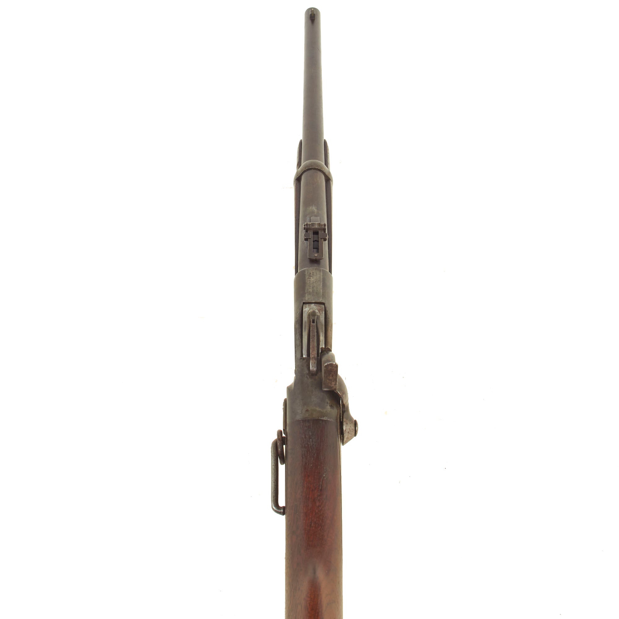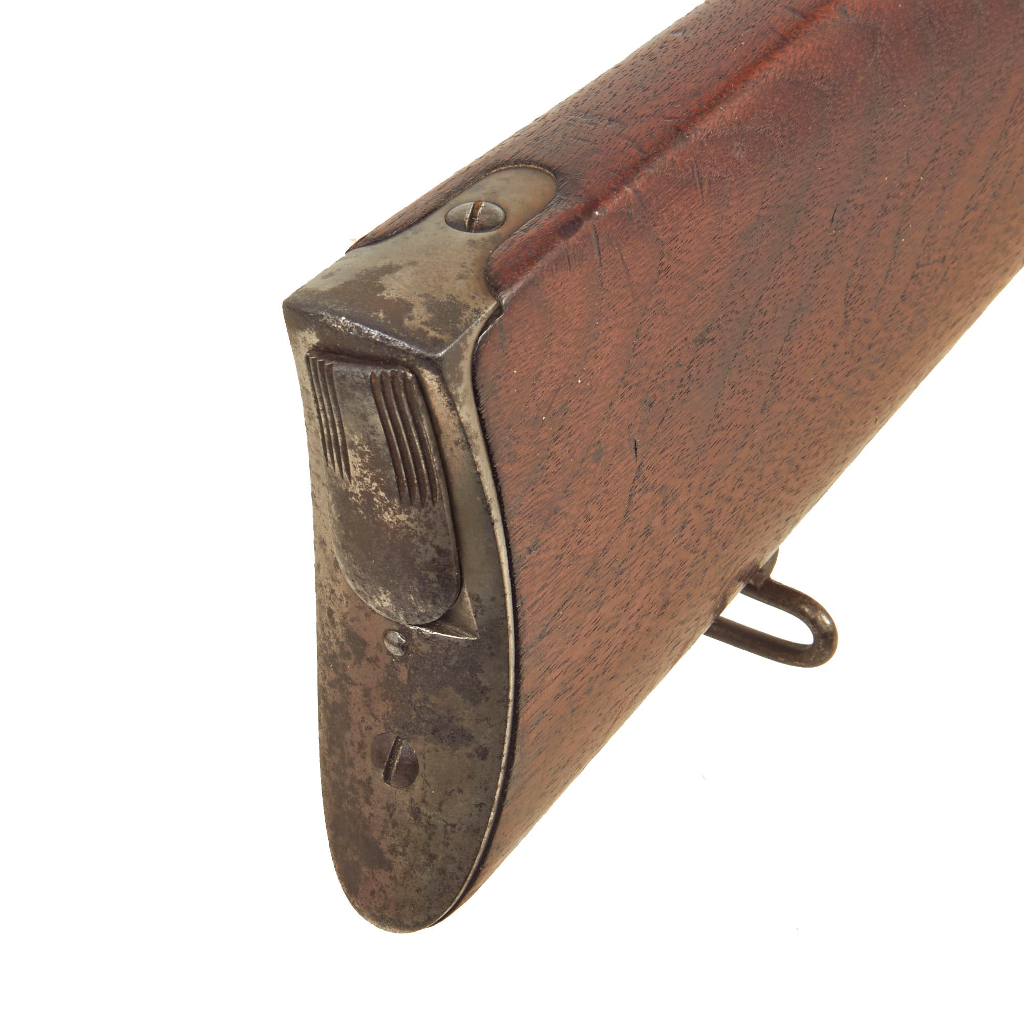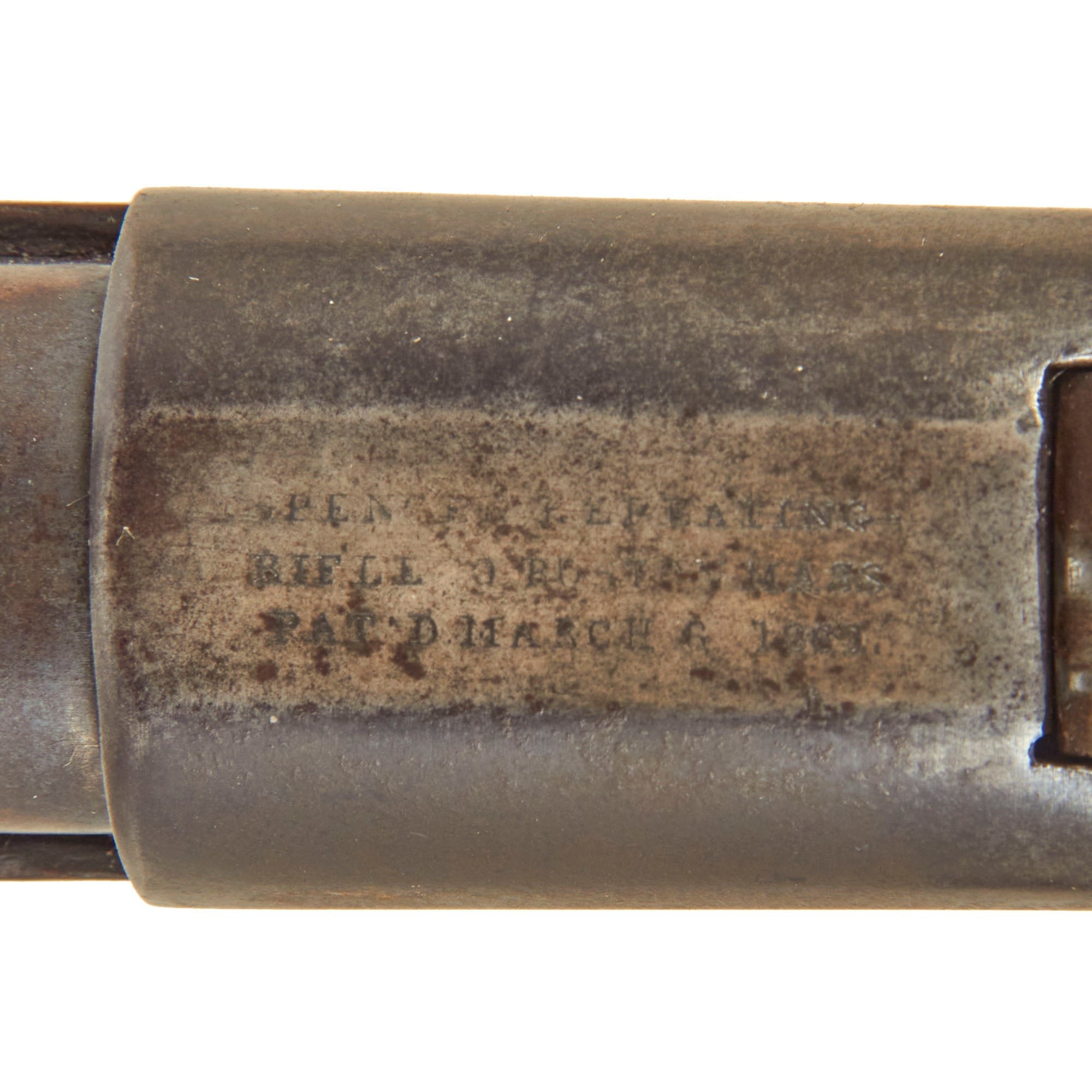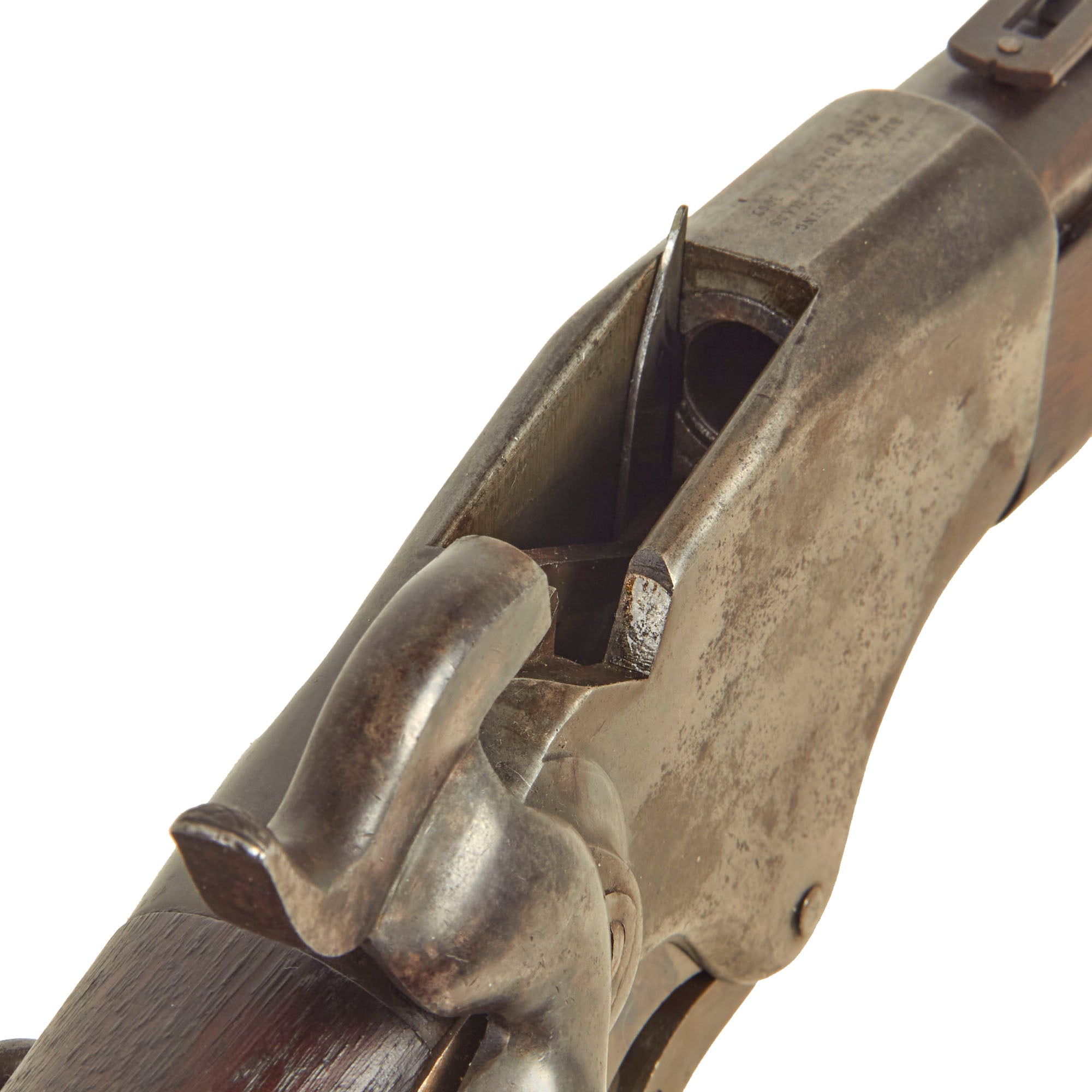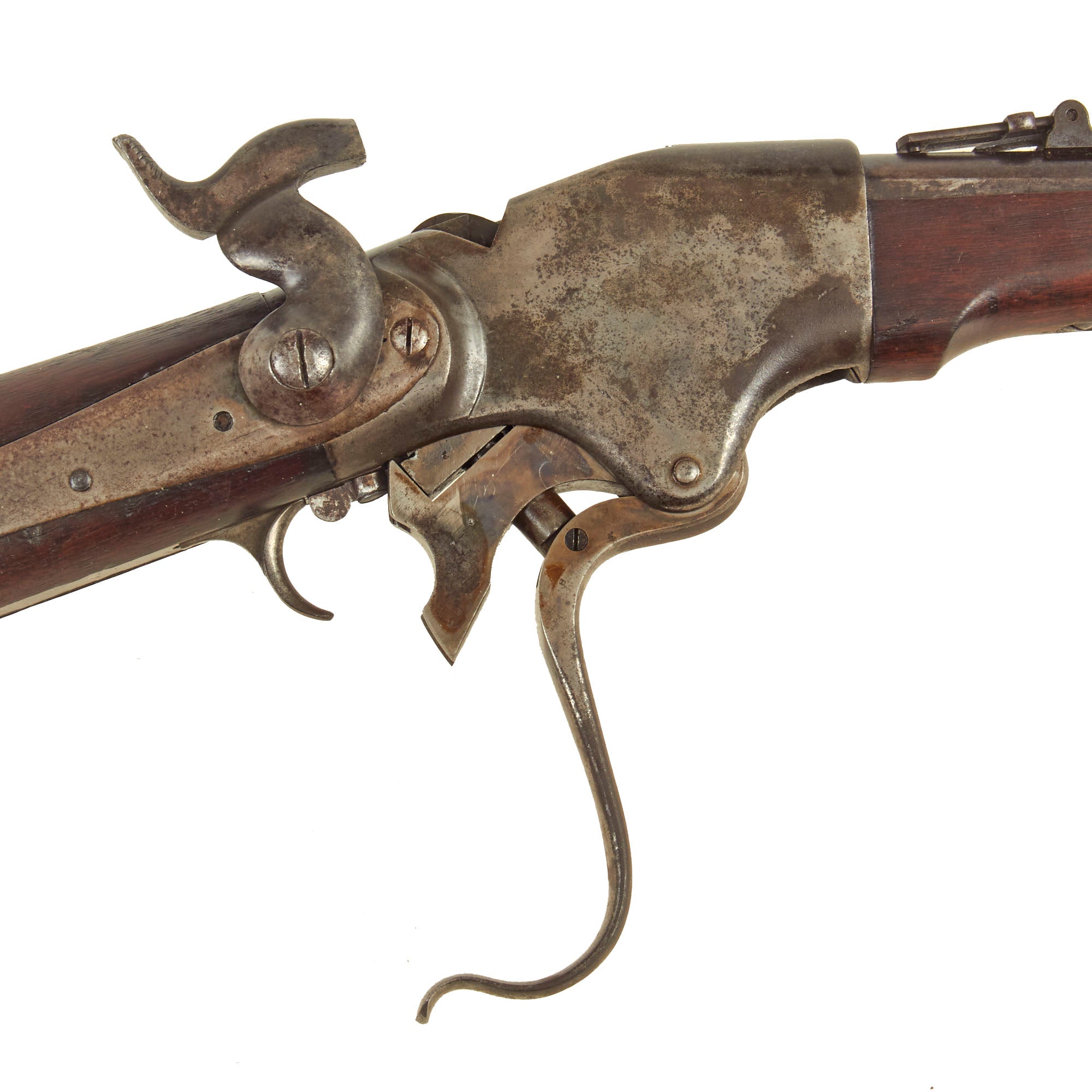 Original Item: Only One Available. This is a very interesting example of a genuine Spencer Repeating Rifle Company Saddle Ring Repeating Carbine. It looks to have started life as a Civil War issue Model 1860 carbine, with serial number 29617 indicating early 1864 manufacture. This number is also too high to be a Spencer produced Model 1865. It is however fitted with a 20 inch barrel, with crossed out serial number 20019 on the bottom, indicating that it was one of the 12,000 M1860s retrofitted at Springfield Armory to incorporate features of the later Model 1865, which included the shorter barrel. As such we are calling it a Model 1860/65.
