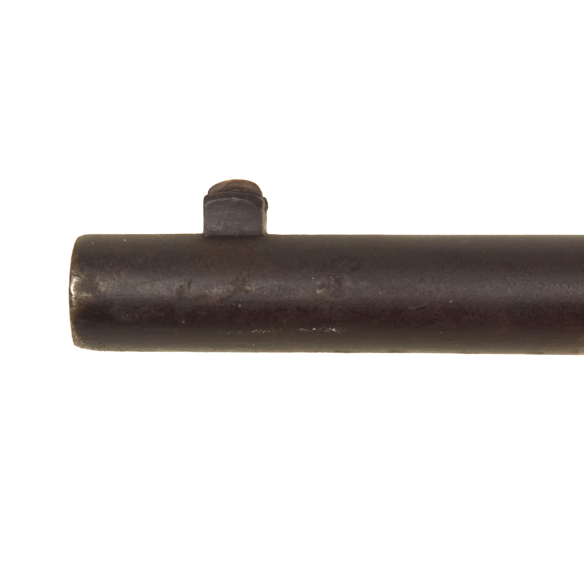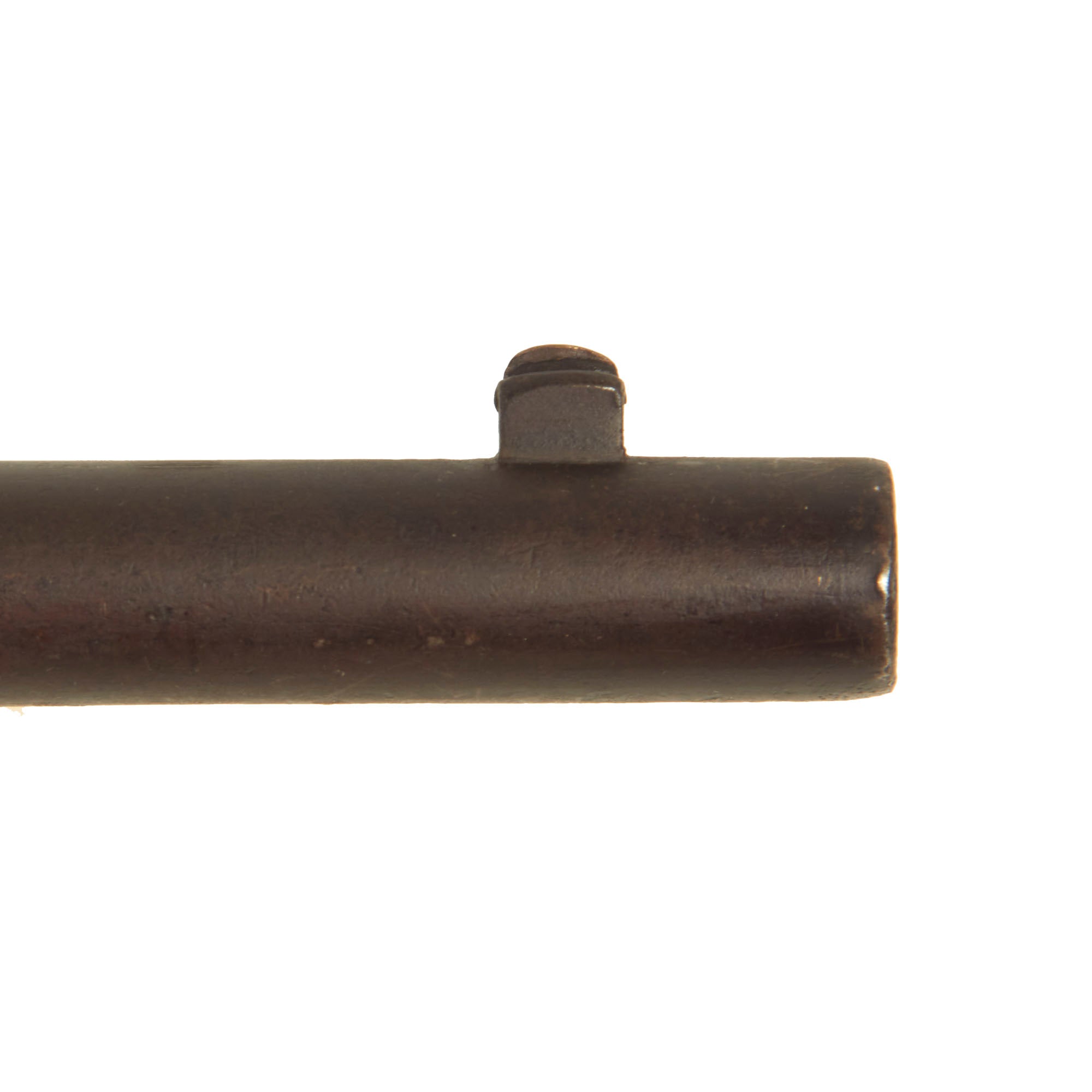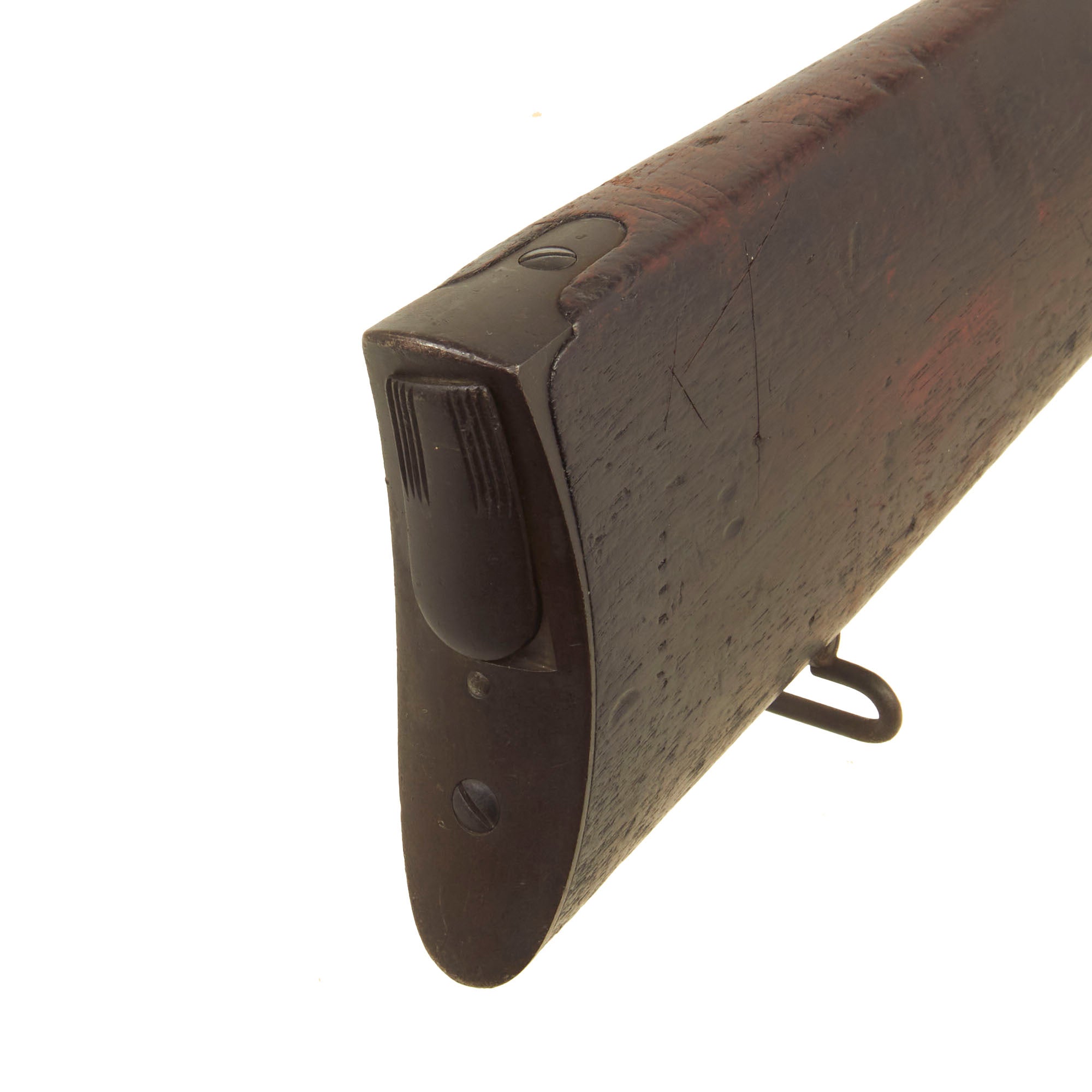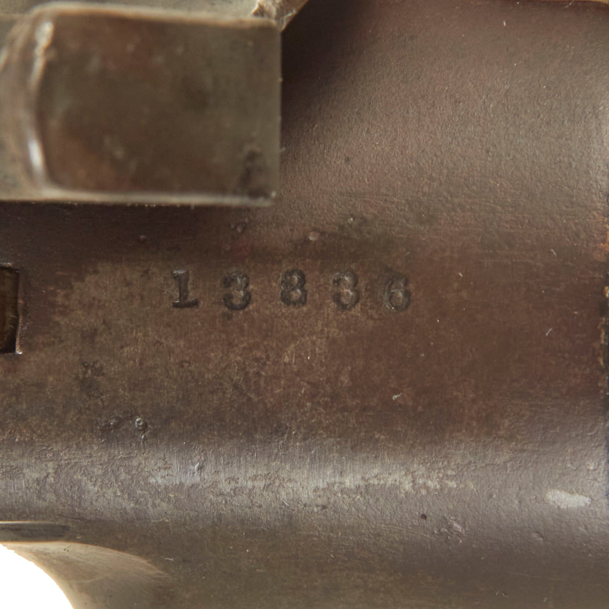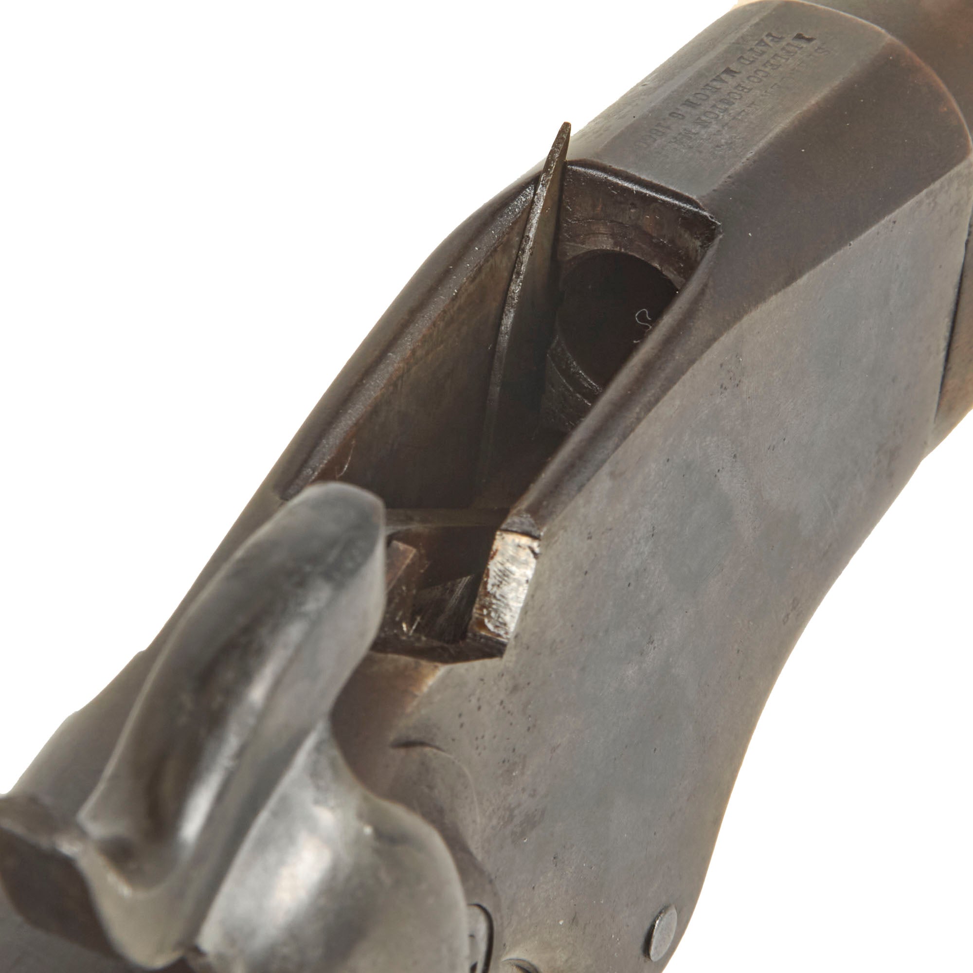 The metalwork of this carbine is in very good shape, with the original finish faded to a plum patina in most areas, with just a bit of peppering in areas of the barrel. The saddle ring bar is still present, with the original saddle ring installed. The original ladder sight is complete and fully functional. The action functions well, though we have not tested the ability of the magazine to feed. This is one of the 12,502 Carbines manufactured by Spencer with a Stabler cutoff, which is still installed and fully functional, though the slider is VERY stiff at present.