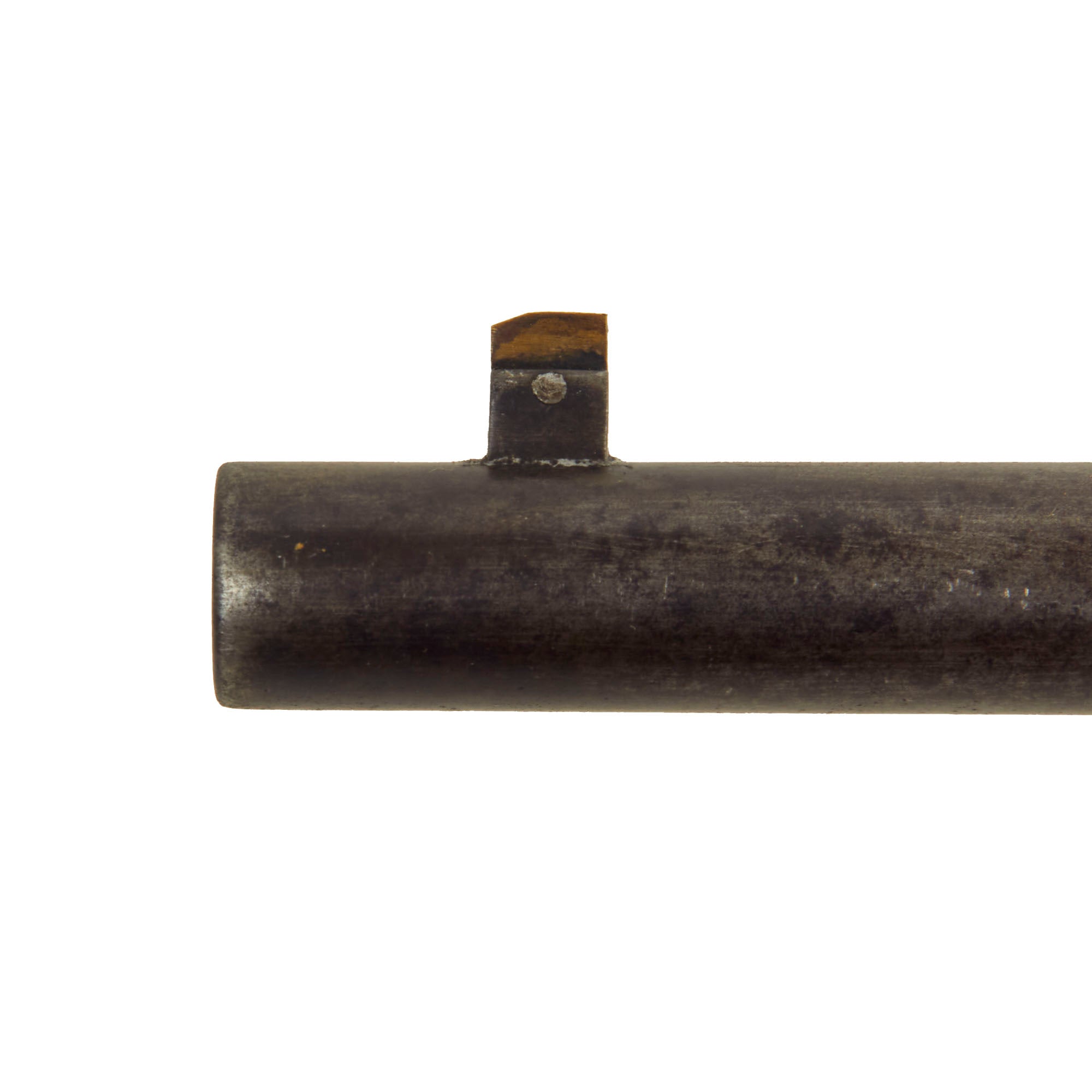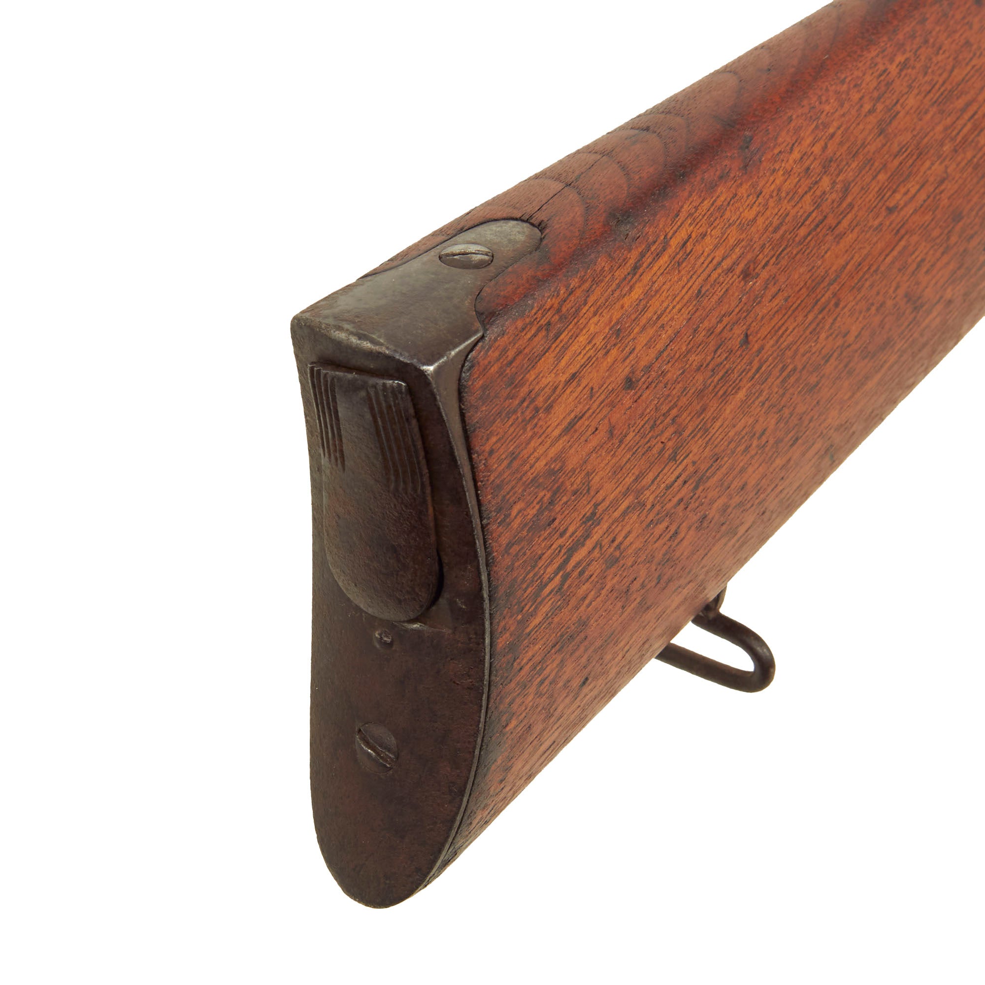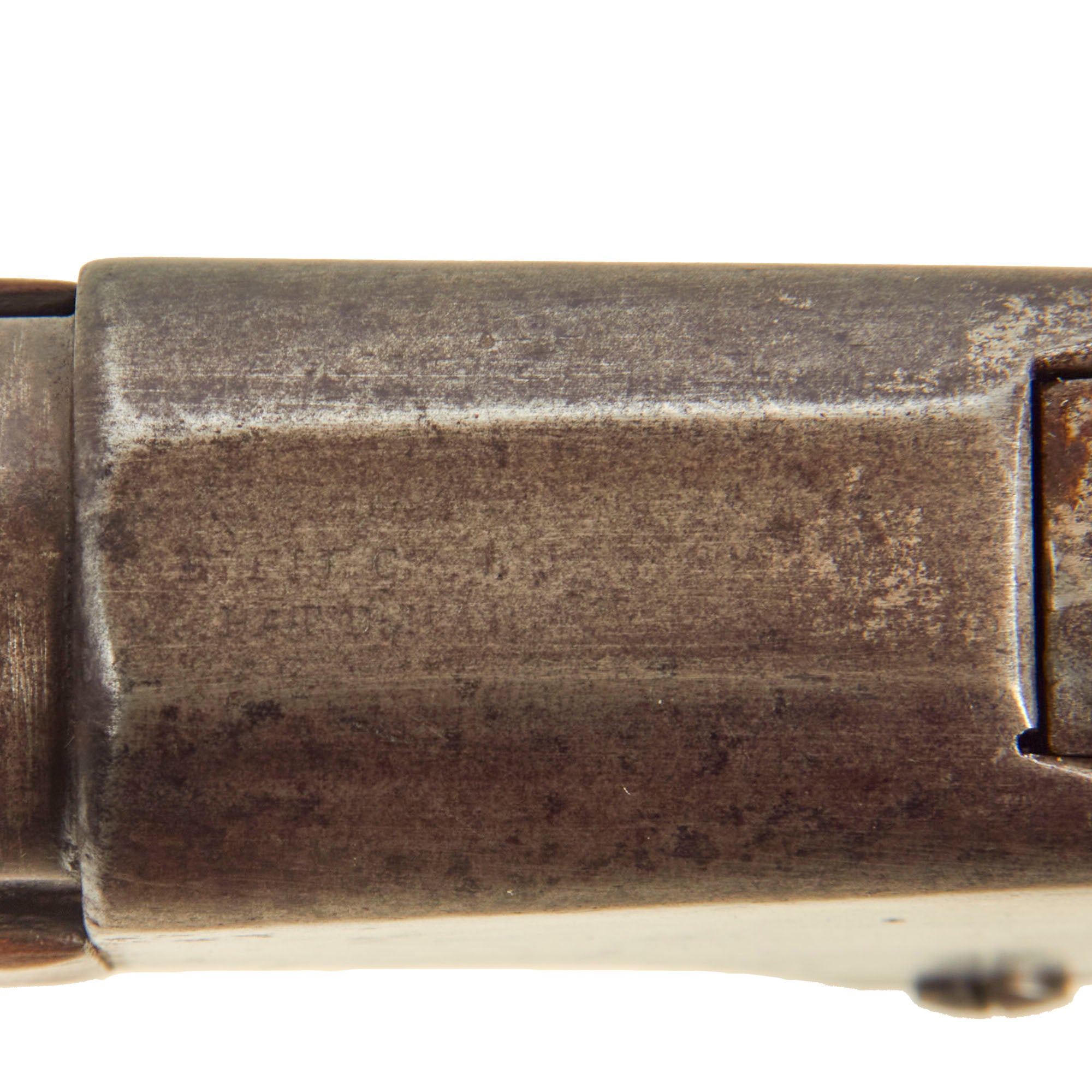 The metalwork of this carbine shows that it has been cleaned and possibly refinished in the past, which has made the markings faint on the receiver. It now has a mottled patinated look on the exterior, typical of guns that saw long service, and really looks great. The saddle ring bar is still present, with the original saddle ring installed. The original ladder sight is complete and fully functional. There is however a bit of wobble in the butt stock / rear receiver connection, possibly due to the lower screw being replaced when the cutoff was removed. The action functions well, though we have not tested the ability of the magazine to feed. This is one of the 12,502 Carbines manufactured by Spencer with a Stabler cutoff, as indicated by the set screw next to the securing screw, however the cutoff itself was removed.