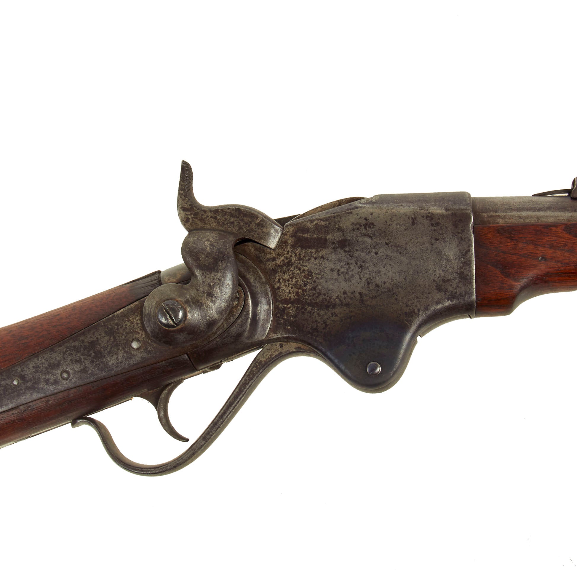 • Original Item: Only One Available. This is a very nice condition genuine Spencer Repeating Rifle Company Model 1865 Saddle Ring Carbine. It looks to have seen long service on the frontier during the late 1860s and possibly later. The exterior has a lovely "frontier worn" patina, showing areas of light pitting and oxidation on the metalwork. While most M1865 carbines we have seen were made by Burnside Rifle Company, about 40% of the total produced were manufactured by Spencer itself. This is one of the few model 1865s we have had made by Spencer, and it is does not appear to be a Model 1860 conversion, though the barrel has been replaced.