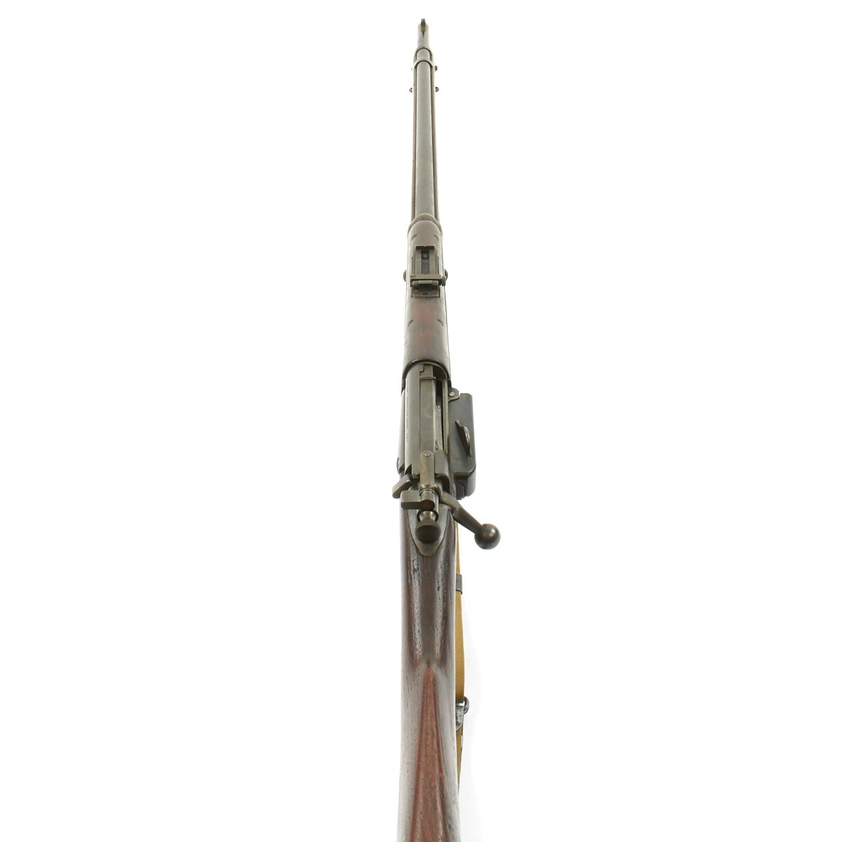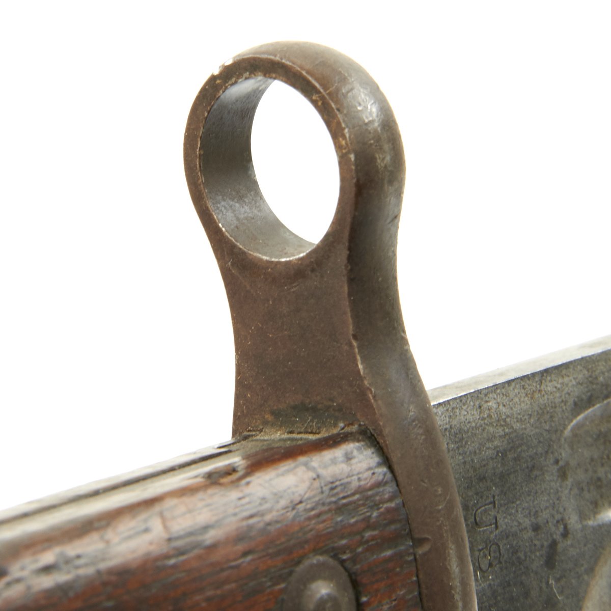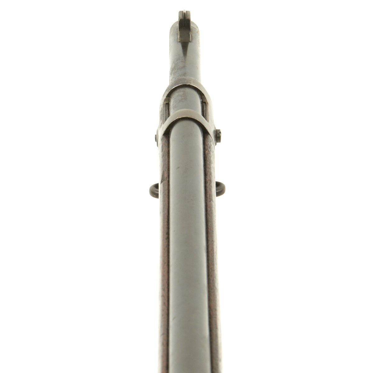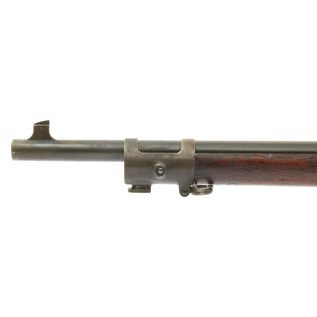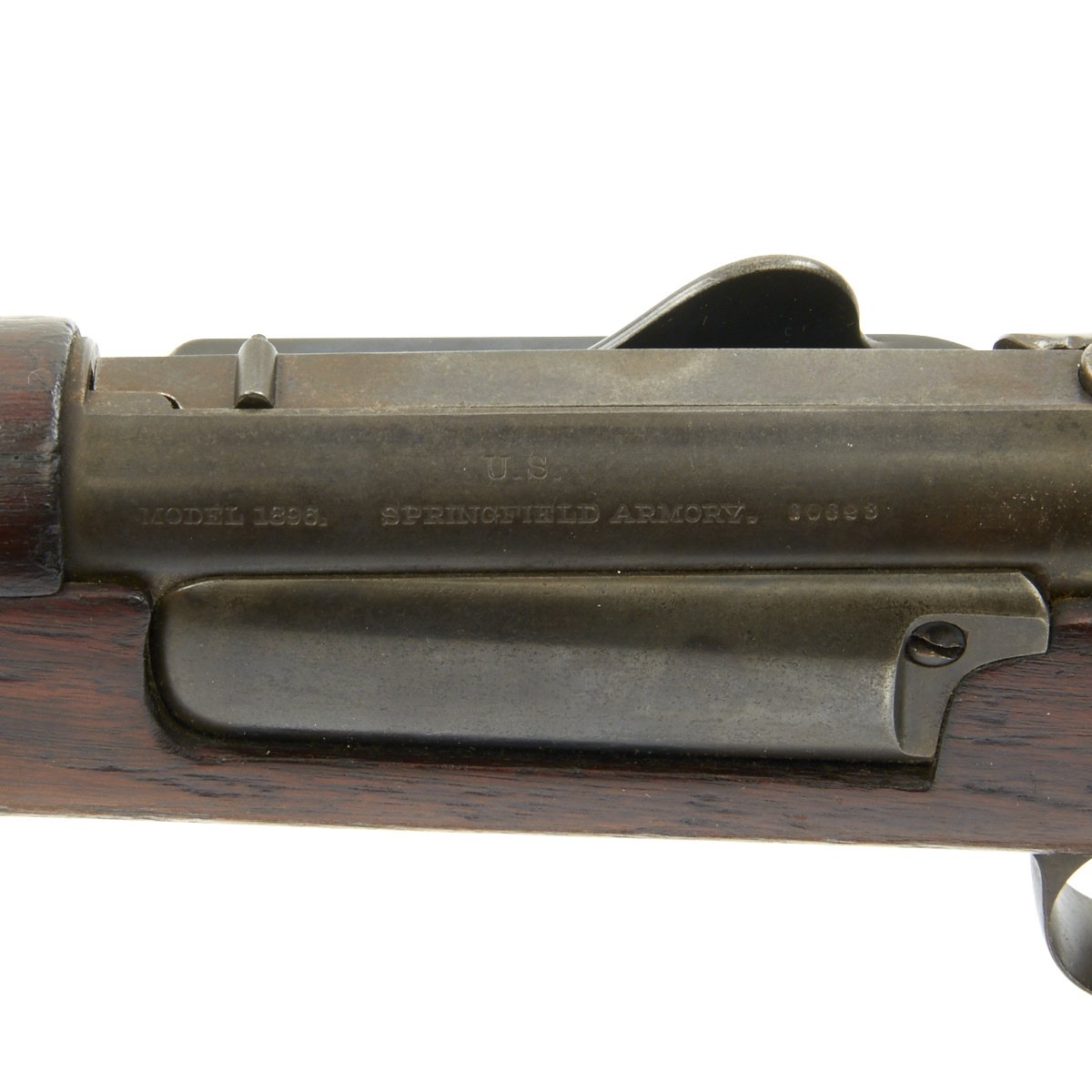 Research reveals that serial number 60693 dates the time of manufacture to the the end of 1896, which is technically part of fiscal year 1897. It still has a faint remnant of the original circled "P" proof behind the trigger guard, indicating the barrel has passed the overpressure testing. The stock is fitted with a M1896 solid smooth buttplate with a curved toe and butt-trap. The handguard meets the front edge of the receiver fitted with the correct 1896 pattern rear sight. These are very desirable as a U.S. military service rifle as most of these rifles saw heavy use in the Spanish-American War and early 1900s until the development of the M1903 rifle.