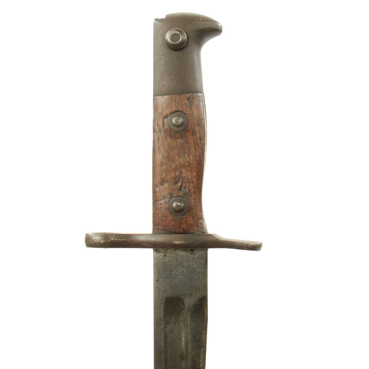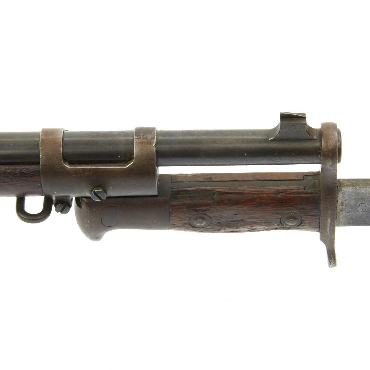 Original Item: Only One Available. This is a very nice very mid-production (1896) Krag M1896 Rifle, complete with a correct 1902-dated M1892 bayonet and canvas Kerr extension gun sling. It measures was 49 inches (1,200 mm) in overall length weighing 9.3 pounds with a 30-inch (760 mm) barrel. The The Springfield Model 1892–99 Krag–Jørgensen rifle is a Norwegian-designed bolt-action rifle that was adopted in 1892 as the standard United States Army military longarm, chambered in U.S. caliber .30-40 Krag. All versions and variants were manufactured under license by the Springfield Armory between 1892 and 1903 and famously served as the longarm during the Spanish–American War. Although Krags were popular, unique and efficient, the side loading gate mechanism was slow and cumbersome to reload in combat compared to the clip loaded Spanish Mausers the Krag was up against.