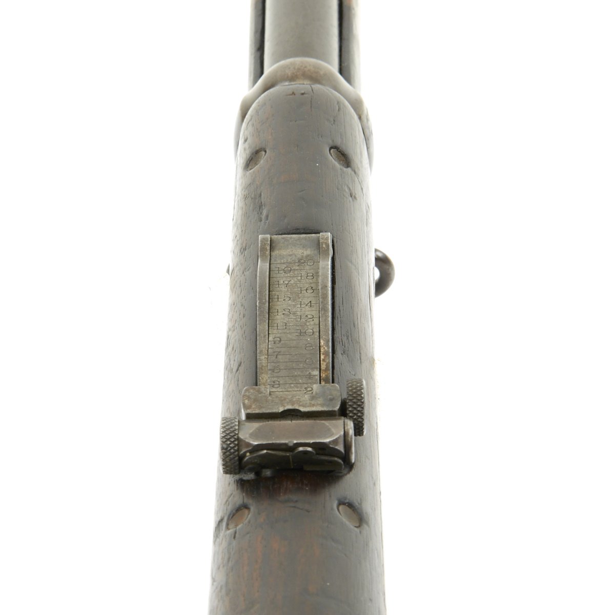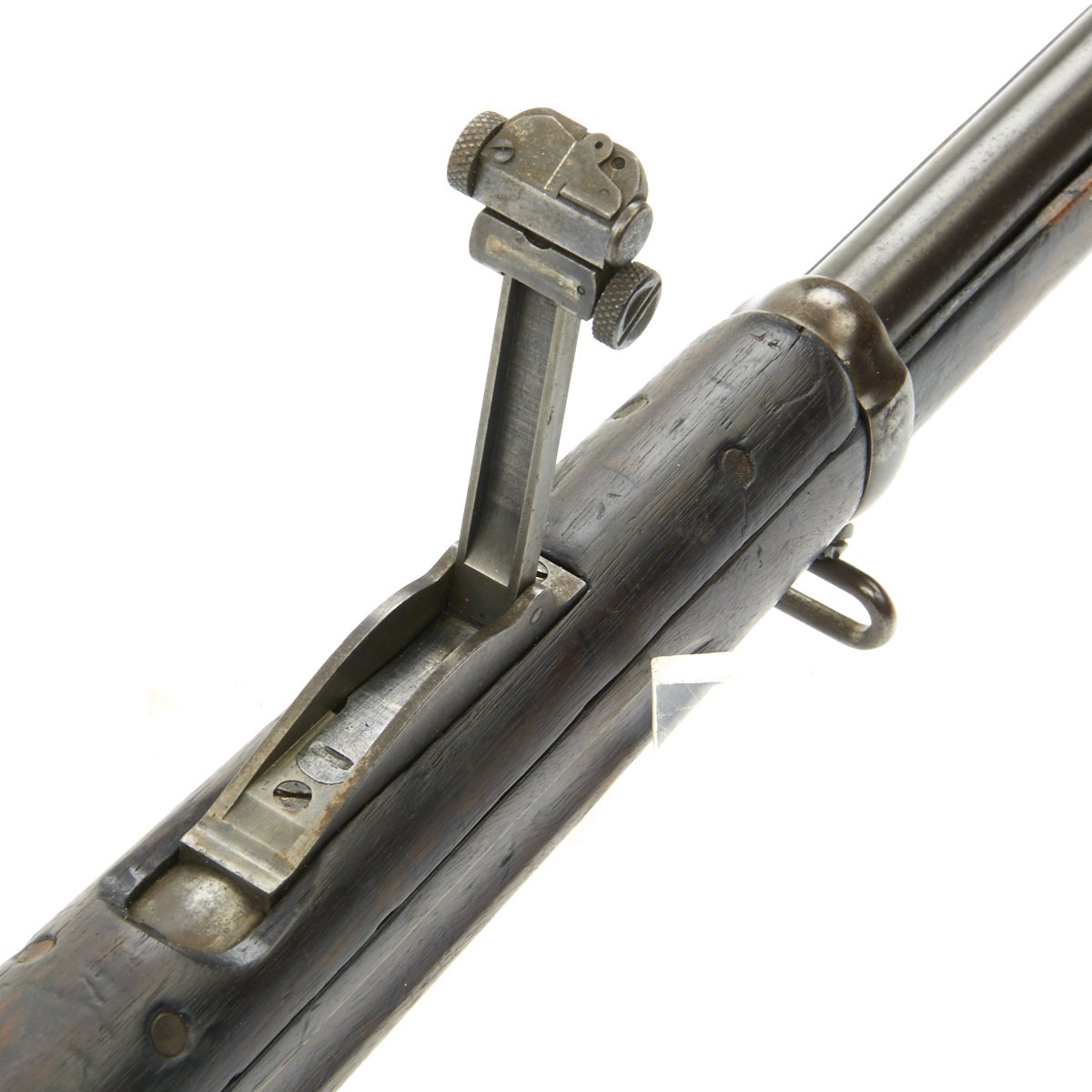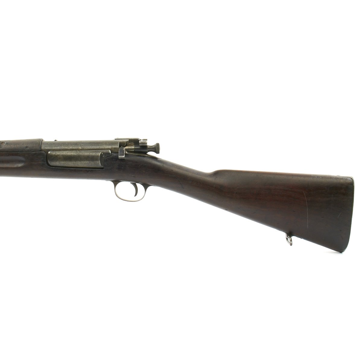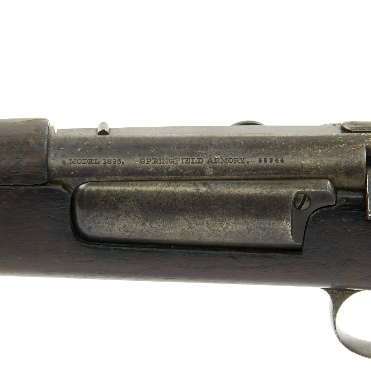 Research reveals that serial number 66944 dates the time of manufacture to the first half of 1897, which is technically part of fiscal year 1897. It still has the original circled "P" proof behind the trigger guard, indicating the barrel has passed the overpressure testing. The stock is fitted with a M1896 solid smooth buttplate with a curved toe and butt-trap. The handguard meets the front edge of the receiver fitted with an updated 1902 pattern rear sight. These are very desirable as a U.S. military service rifle as most of these rifles saw heavy use in the Spanish-American War and early 1900s until the development of the M1903 rifle.