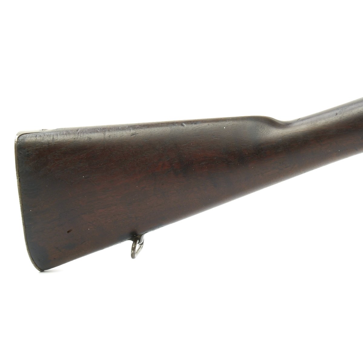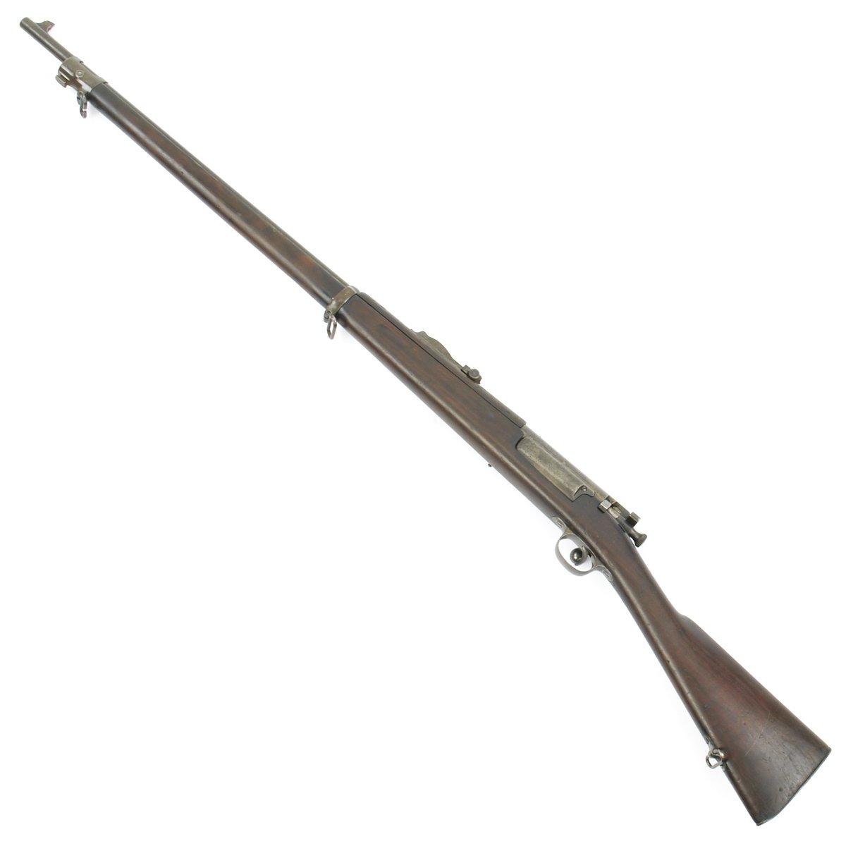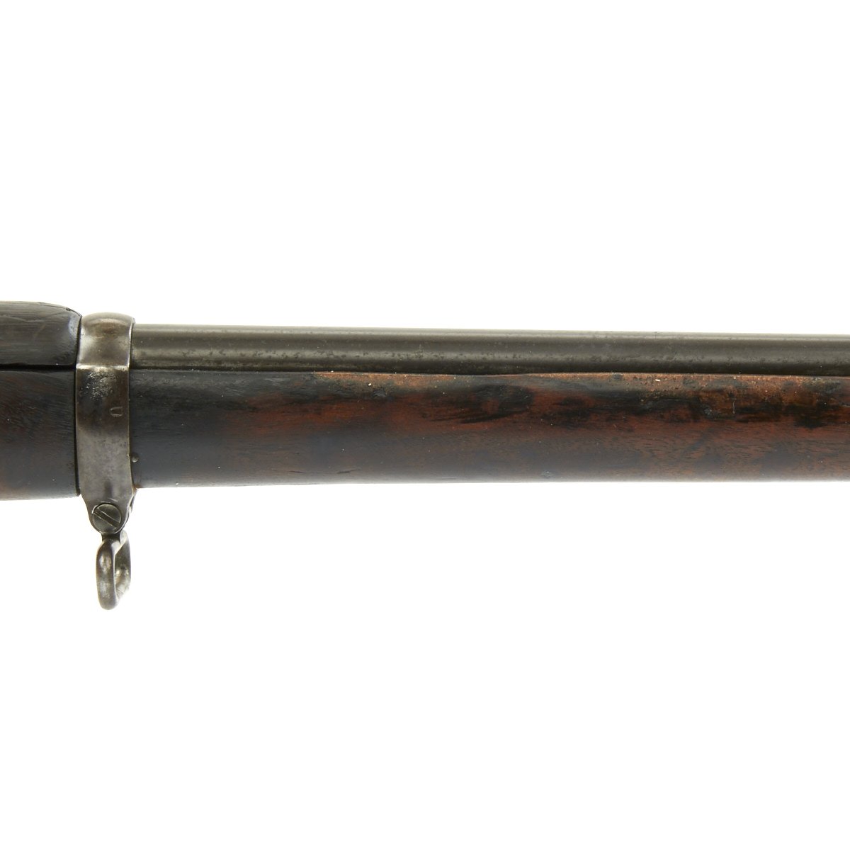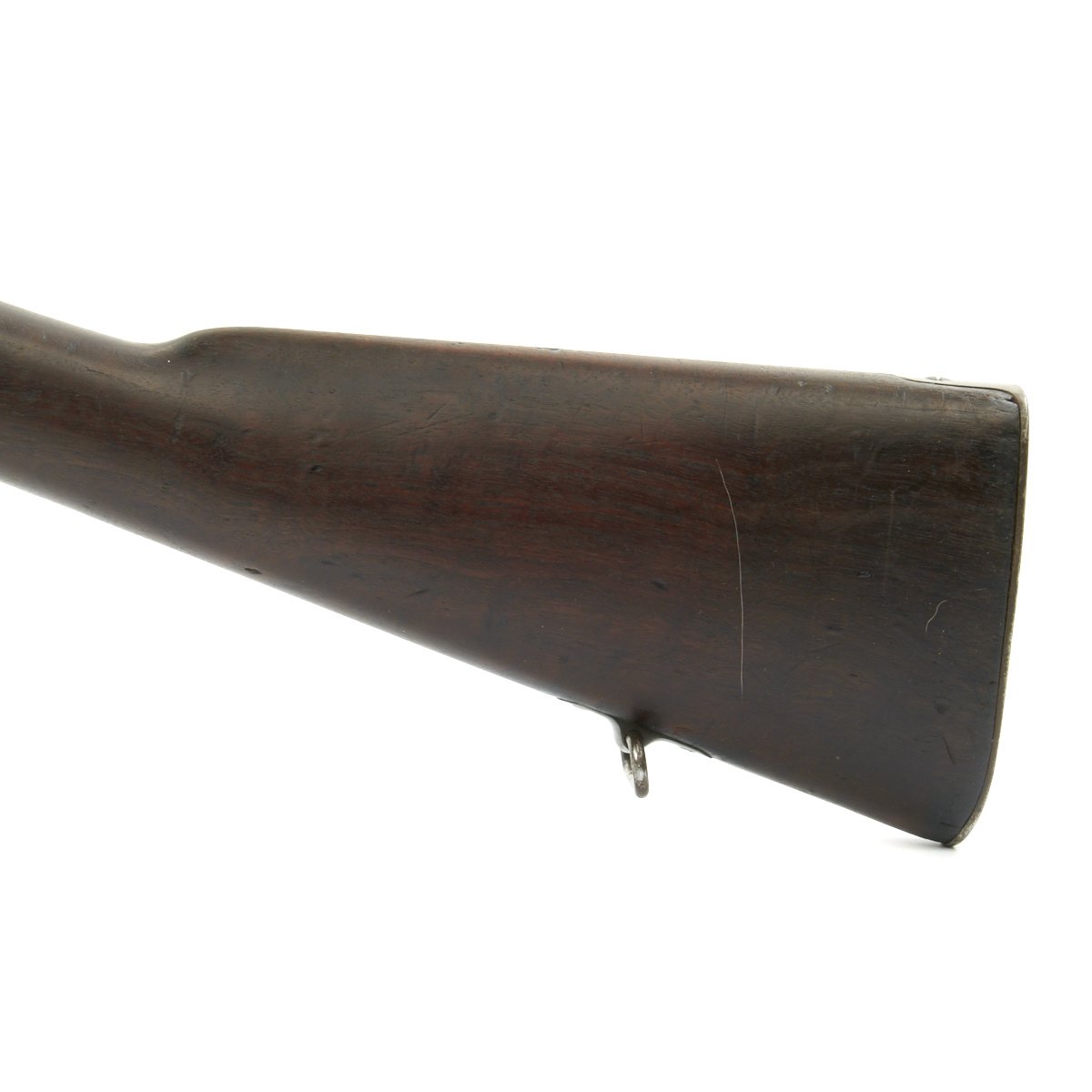 Research reveals that serial number 66944 dates the time of manufacture to the first half of 1897, which is technically part of fiscal year 1897. It still has the original circled "P" proof behind the trigger guard, indicating the barrel has passed the overpressure testing. The stock is fitted with a M1896 solid smooth buttplate with a curved toe and butt-trap. The handguard meets the front edge of the receiver fitted with an updated 1902 pattern rear sight. These are very desirable as a U.S. military service rifle as most of these rifles saw heavy use in the Spanish-American War and early 1900s until the development of the M1903 rifle.