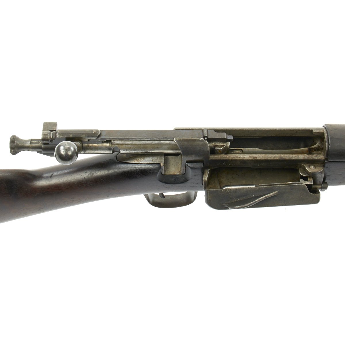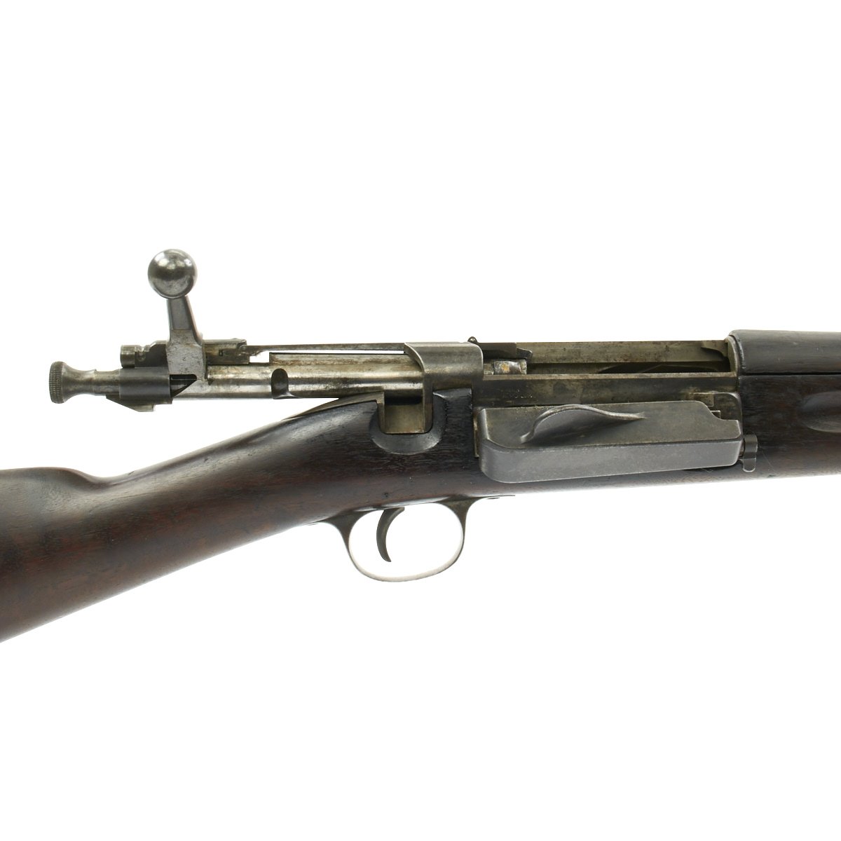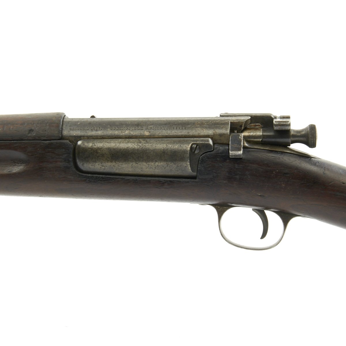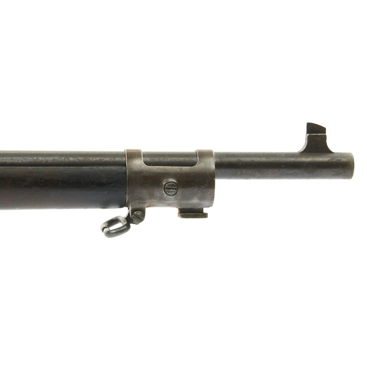 Research reveals that serial number 66944 dates the time of manufacture to the first half of 1897, which is technically part of fiscal year 1897. It still has the original circled "P" proof behind the trigger guard, indicating the barrel has passed the overpressure testing. The stock is fitted with a M1896 solid smooth buttplate with a curved toe and butt-trap. The handguard meets the front edge of the receiver fitted with an updated 1902 pattern rear sight. These are very desirable as a U.S. military service rifle as most of these rifles saw heavy use in the Spanish-American War and early 1900s until the development of the M1903 rifle.