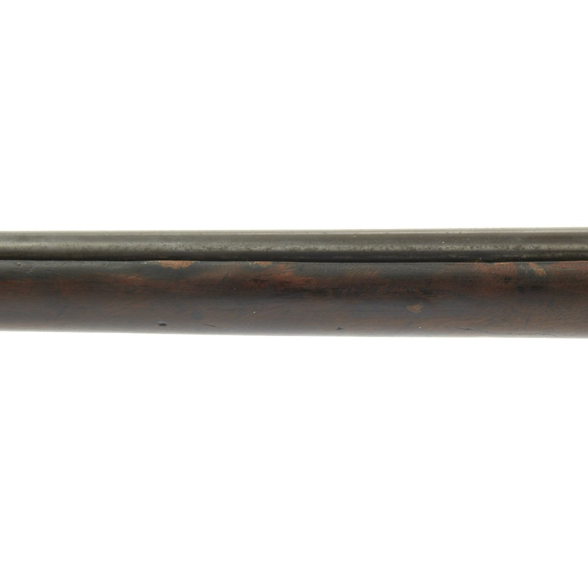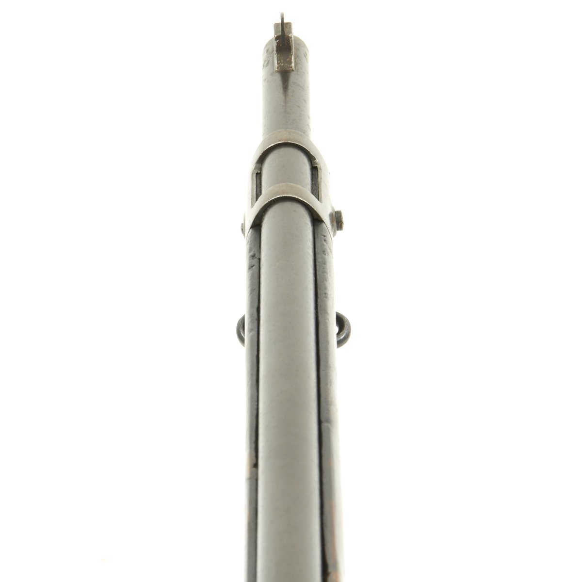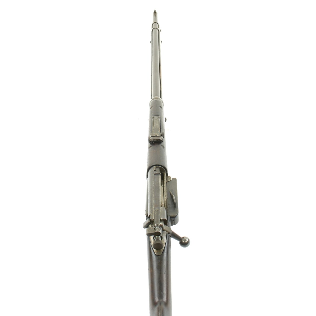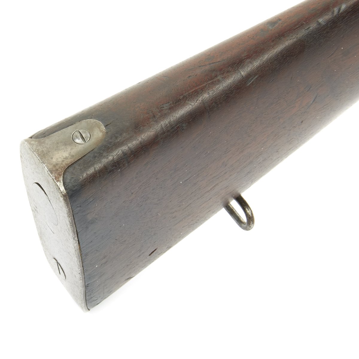 Research reveals that serial number 66944 dates the time of manufacture to the first half of 1897, which is technically part of fiscal year 1897. It still has the original circled "P" proof behind the trigger guard, indicating the barrel has passed the overpressure testing. The stock is fitted with a M1896 solid smooth buttplate with a curved toe and butt-trap. The handguard meets the front edge of the receiver fitted with an updated 1902 pattern rear sight. These are very desirable as a U.S. military service rifle as most of these rifles saw heavy use in the Spanish-American War and early 1900s until the development of the M1903 rifle.