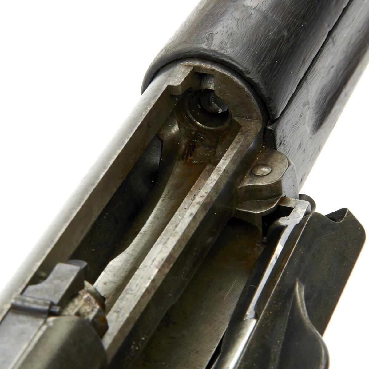 Condition is very good, with a lot of the original finish present, with the usual wear around the magazine door and bolt. The stock and handguard are in good condition, and have a nice matching deep red walnut color, though there have been some repairs around the woodline on the forestock. The stock shows minor handling marks and very light impressions in some areas. Both sling swivels and the stacking swivel are present and in very good condition. Action works smoothly and all components have a nice finish, with a bit of oxidation on the bright areas. Bore is bright, with clear lands and grooves. There is a little bit of rounding on the lands, so this rifle definitely did see some use, but is overall in great shape.