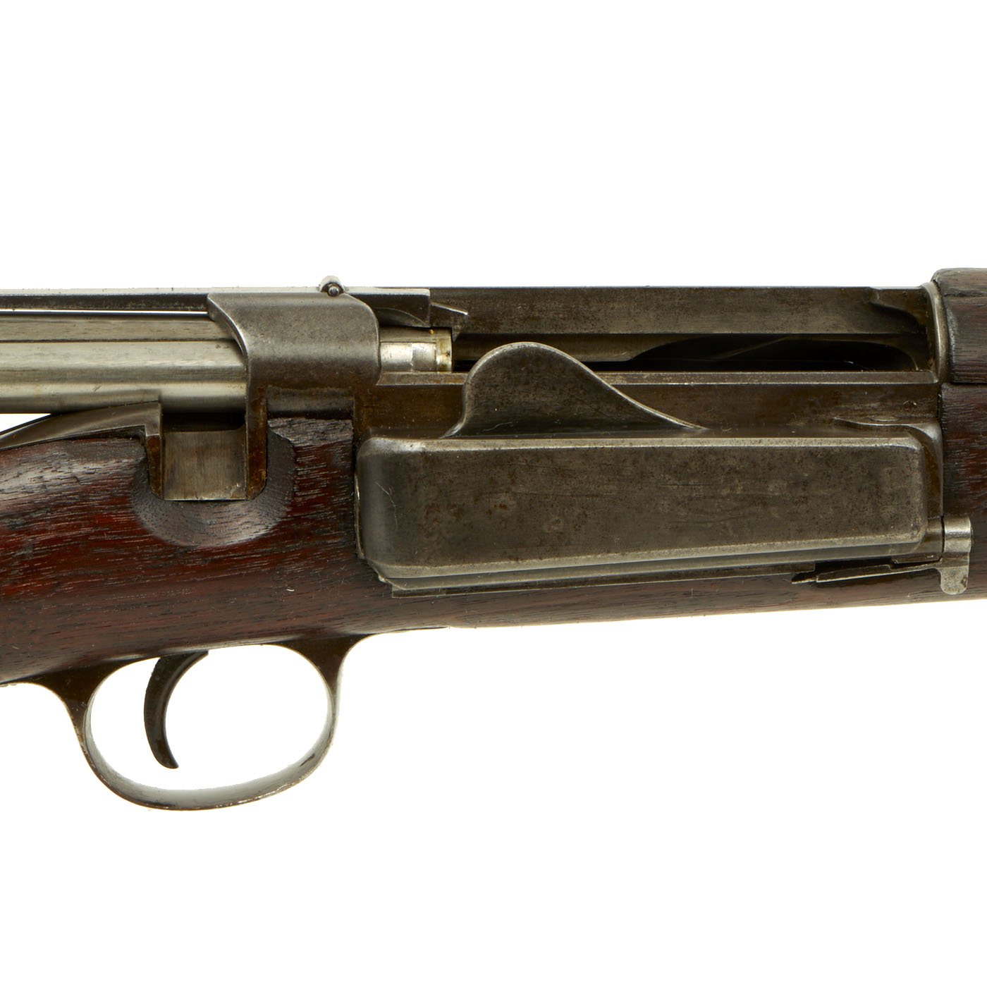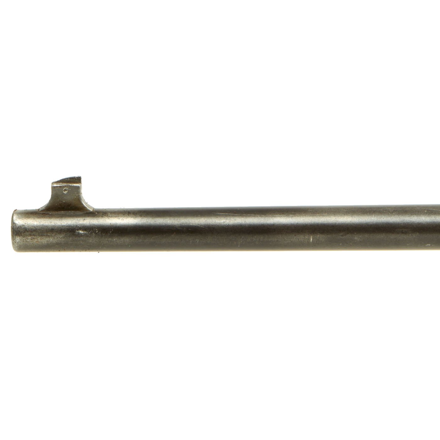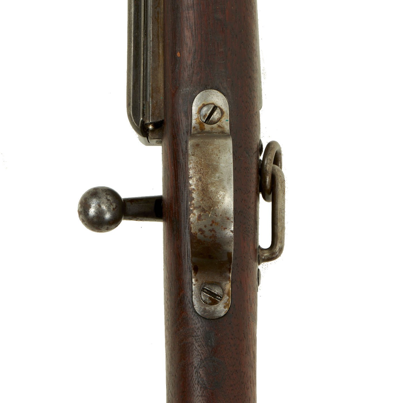 The Carbine Model 1896 features the later bolt with the extractor with pin and the receiver is machined to work with the pin. The handguard is correct for the model 1896 rear sight, which has a C on the top of the ladder, indicating that it is for a "Carbine." There is also a rare barrel band sight guard directly in front to protect it. The stock is fitted with a M1896 solid smooth buttplate with a curved toe and butt-trap, which is unfortunately empty. It still features the original 22 inch barrel, and has not been modified from the original issue configuration.