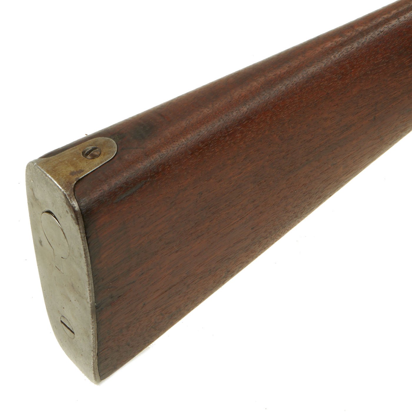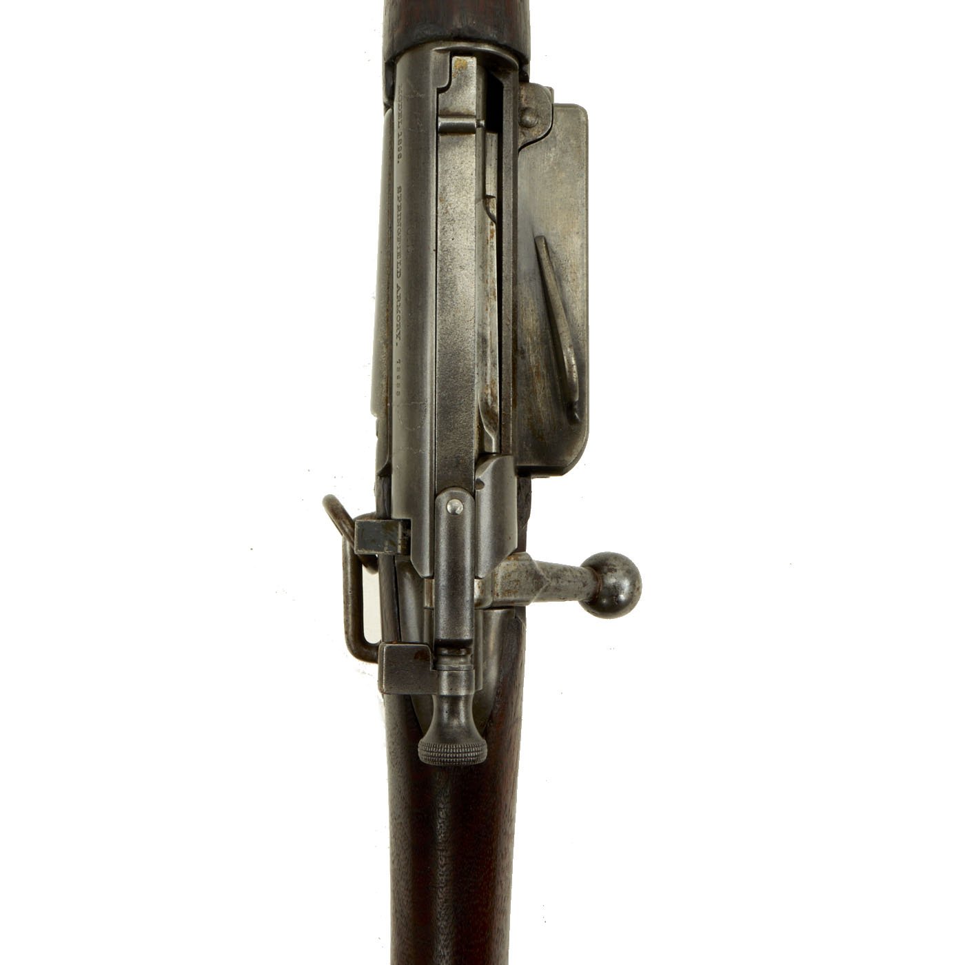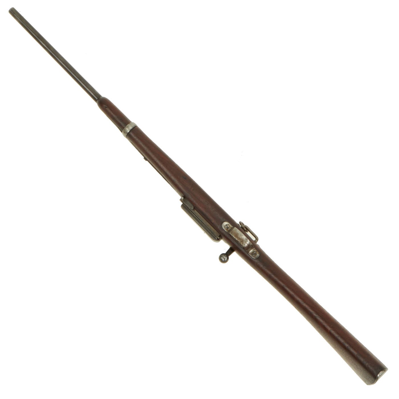 The Carbine Model 1896 features the later bolt with the extractor with pin and the receiver is machined to work with the pin. The handguard is correct for the model 1896 rear sight, which has a C on the top of the ladder, indicating that it is for a "Carbine." There is also a rare barrel band sight guard directly in front to protect it. The stock is fitted with a M1896 solid smooth buttplate with a curved toe and butt-trap, which is unfortunately empty. It still features the original 22 inch barrel, and has not been modified from the original issue configuration.