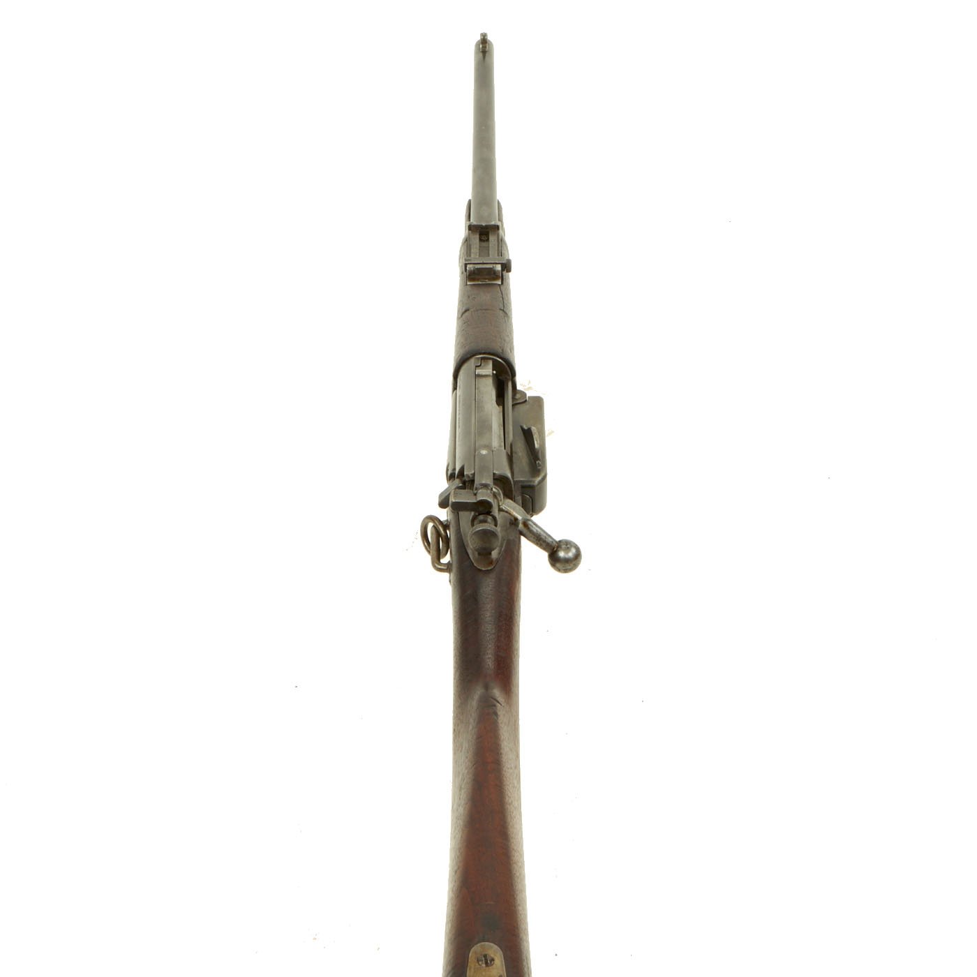 The carbine measures approximately 41 inches (1,042 mm) in overall length with a 22-inch (560 mm) barrel. The The Springfield Model 1892–99 Krag–Jørgensen rifle is a Norwegian-designed bolt-action rifle that was adopted in 1892 as the standard United States Army military longarm, chambered in U.S. caliber .30-40 Krag. All versions and variants were manufactured under license by the Springfield Armory between 1892 and 1903 and famously served as the longarm during the Spanish–American War. Although Krags were popular, unique and efficient, the side loading gate mechanism was slow and cumbersome to reload in combat compared to the clip loaded Spanish Mausers the Krag was up against.