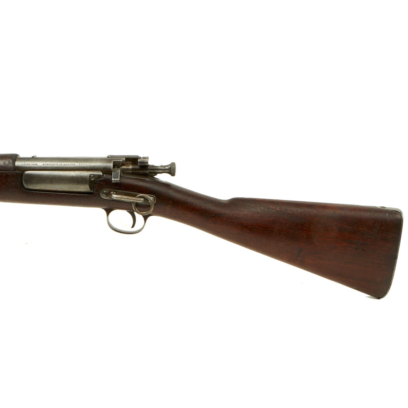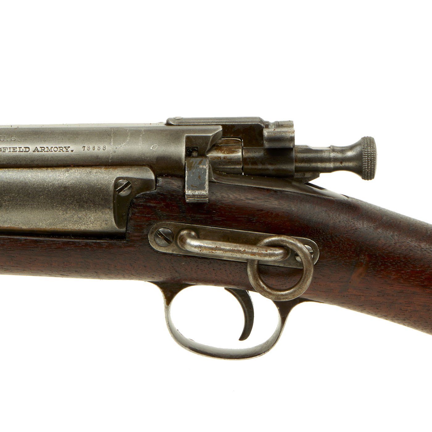 Original Item: Only One Available. This is a very nice example of the very hard to find Springfield Model 1896 Krag–Jørgensen Carbine, which still has an intact saddle ring and sight guard. It does look to have seen long service, and is worn on the exterior. However it comes complete with an original 1905 Dated Cavalry Carbine Leather Saddle Scabbard by Rock Island Arsenal! These are very hard to find, especially with the brass fittings intact, and it is only the second time we have had one.