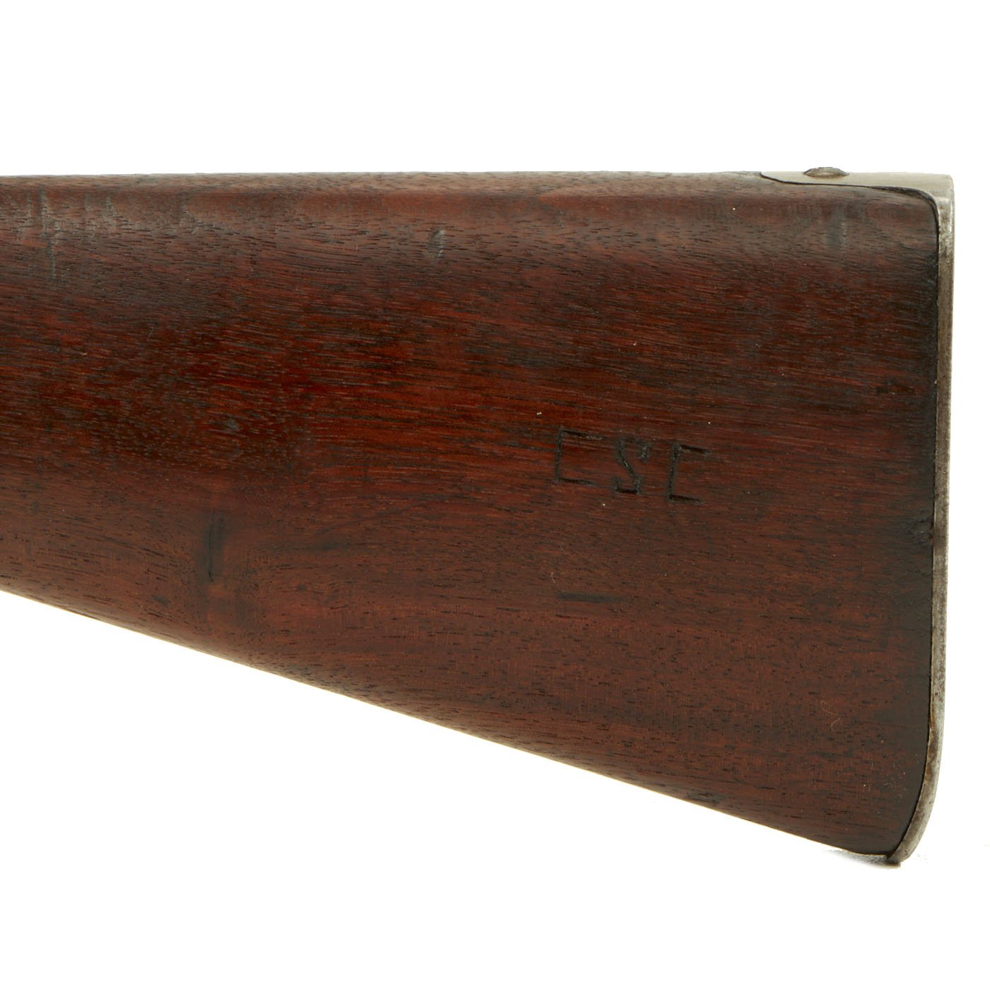 Metal condition is very good, with a lovely worn blue patina and a bit of light speckling in areas. The stocks are in very good condition and have a lovely color, showing wear typical of long service, but no major damage we can see. It still has a faint circled P proof behind the trigger guard, indicating the barrel has passed the overpressure testing. The initials C.S.C. have been carved into the left butt stock.