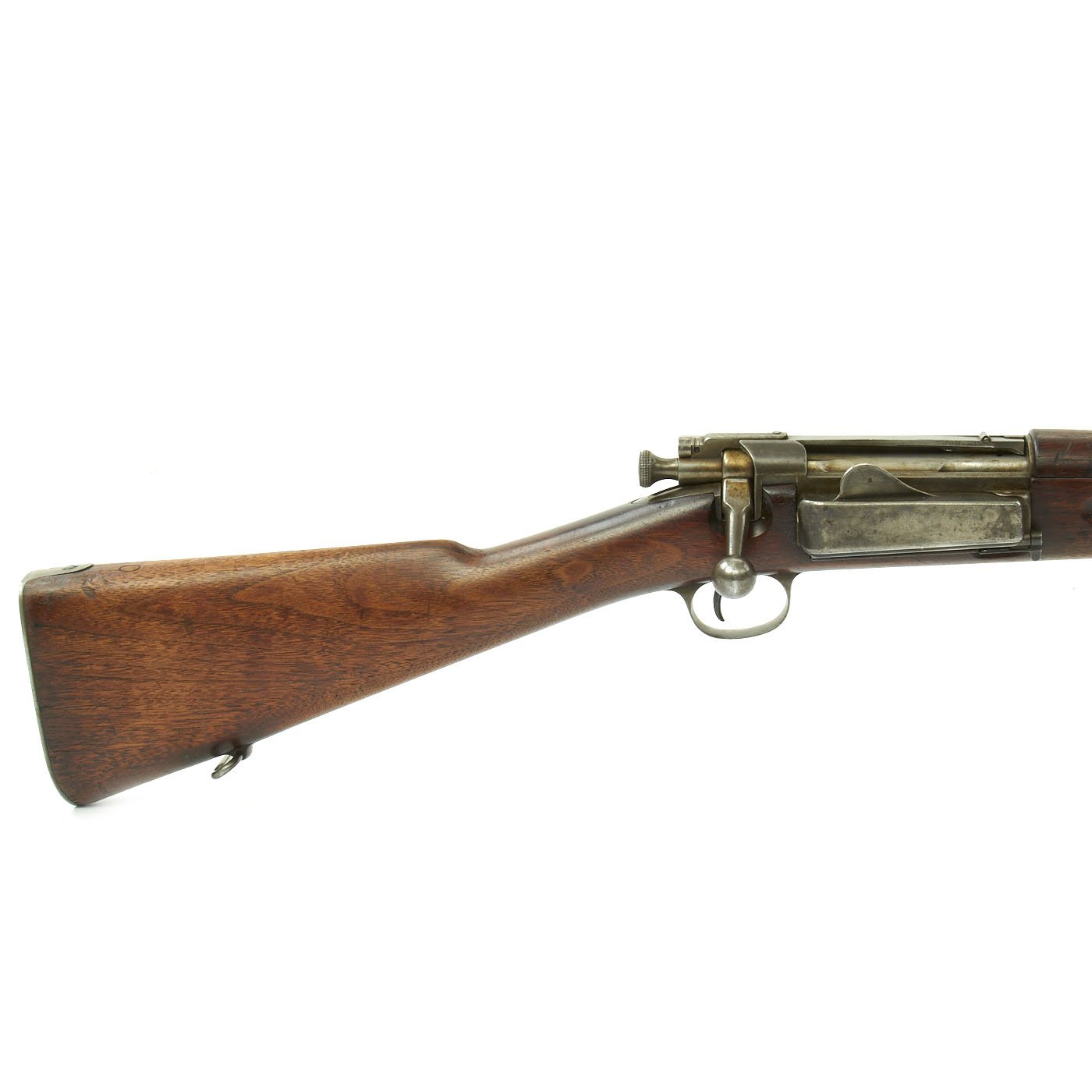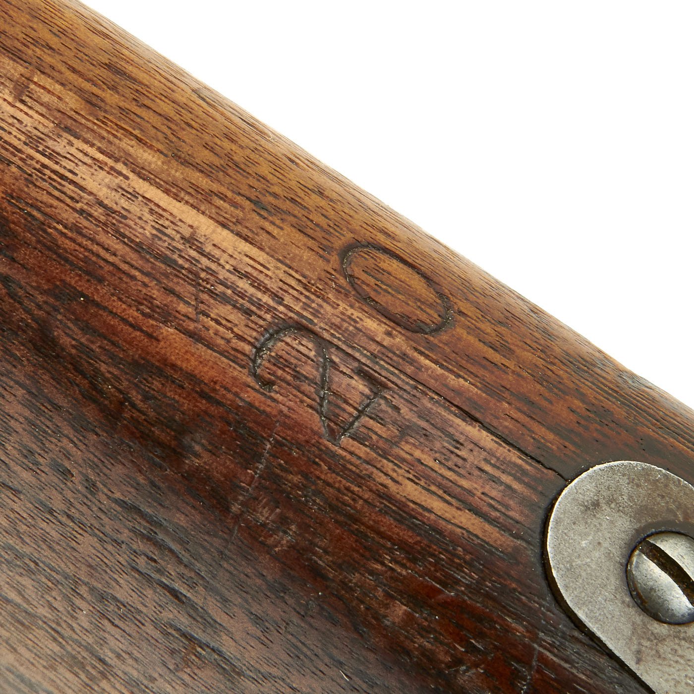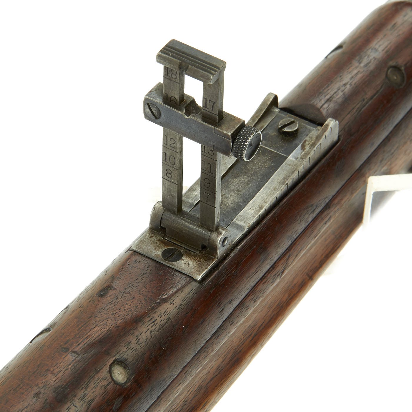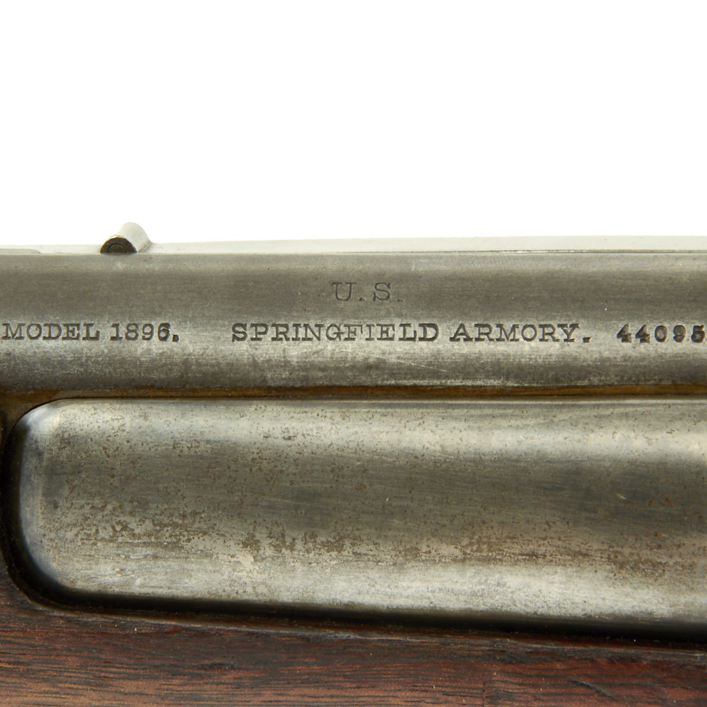 Research reveals that serial number 44095 dates the time of manufacture to the the second half of 1896, which is part of U.S. fiscal year 1897. The stock is fitted with a M1896 solid smooth buttplate with a curved toe and butt-trap. The handguard meets the front edge of the receiver fitted with the correct 1896 pattern rear sight. These are very desirable as a U.S. military service rifle as most of these rifles saw heavy use in the Spanish-American War and early 1900s until the development of the M1903 rifle.