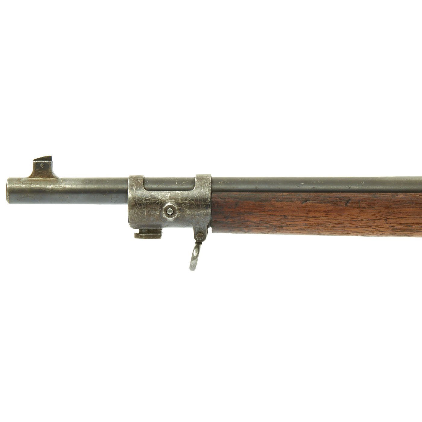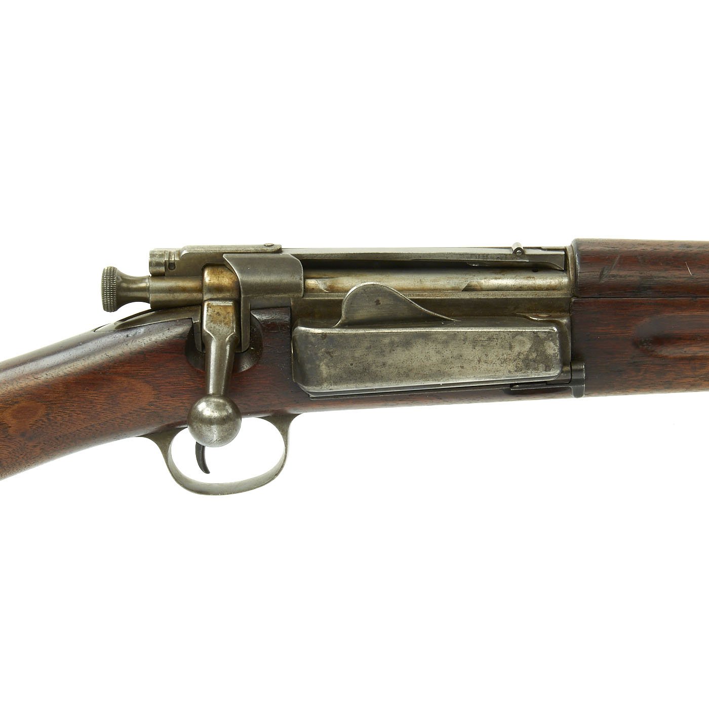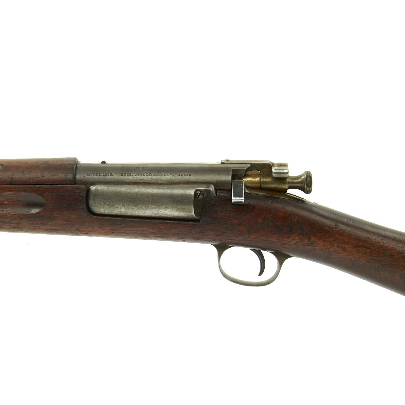 Research reveals that serial number 44095 dates the time of manufacture to the the second half of 1896, which is part of U.S. fiscal year 1897. The stock is fitted with a M1896 solid smooth buttplate with a curved toe and butt-trap. The handguard meets the front edge of the receiver fitted with the correct 1896 pattern rear sight. These are very desirable as a U.S. military service rifle as most of these rifles saw heavy use in the Spanish-American War and early 1900s until the development of the M1903 rifle.