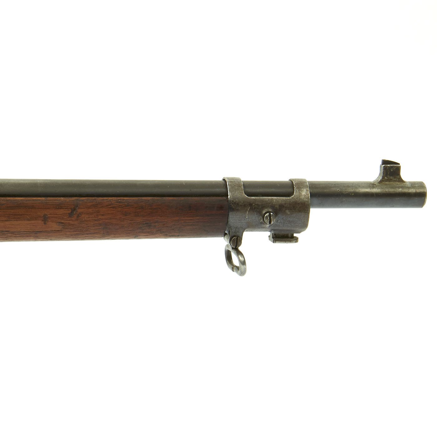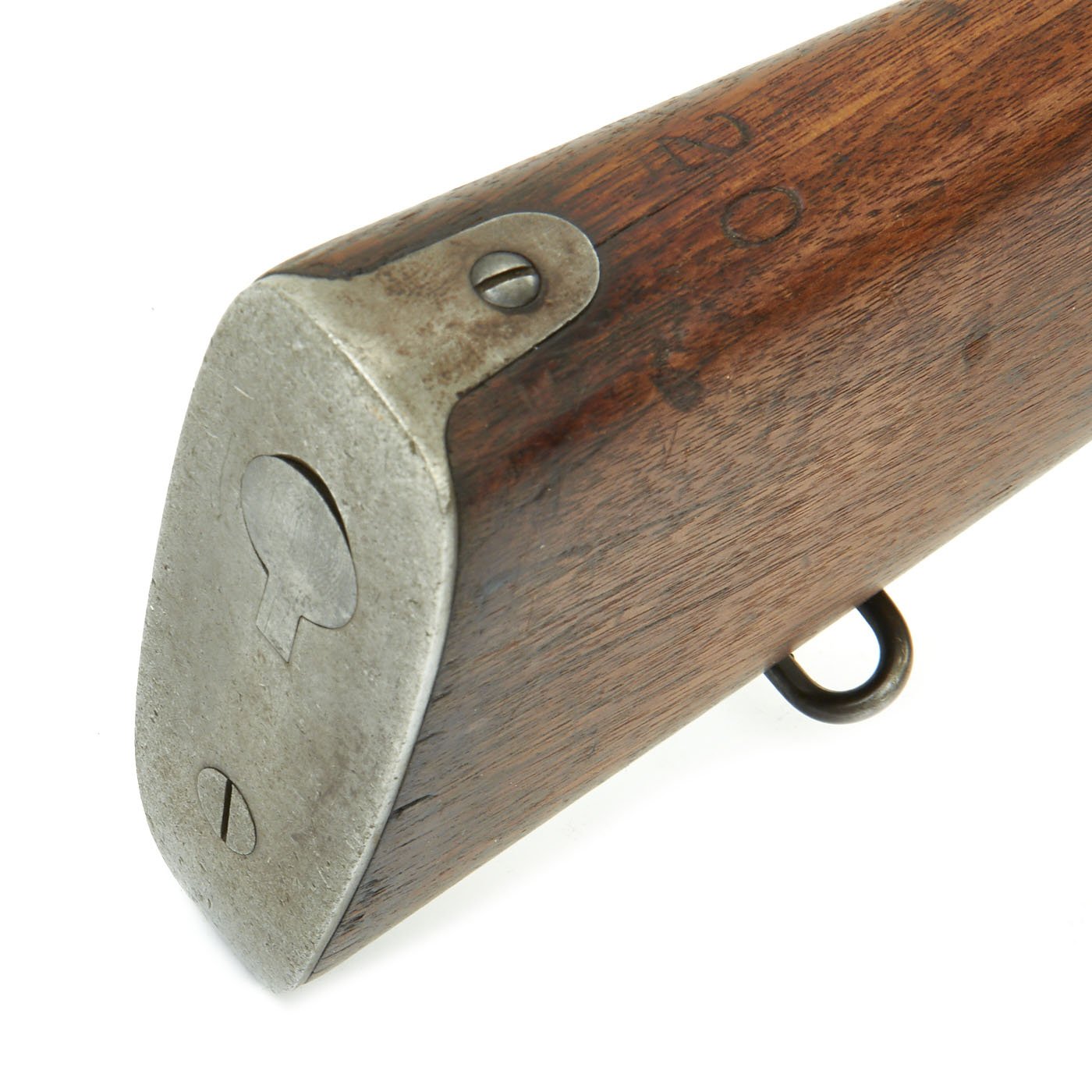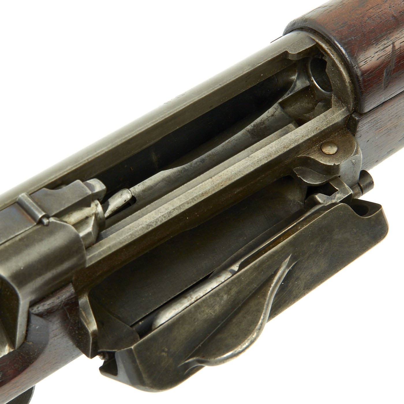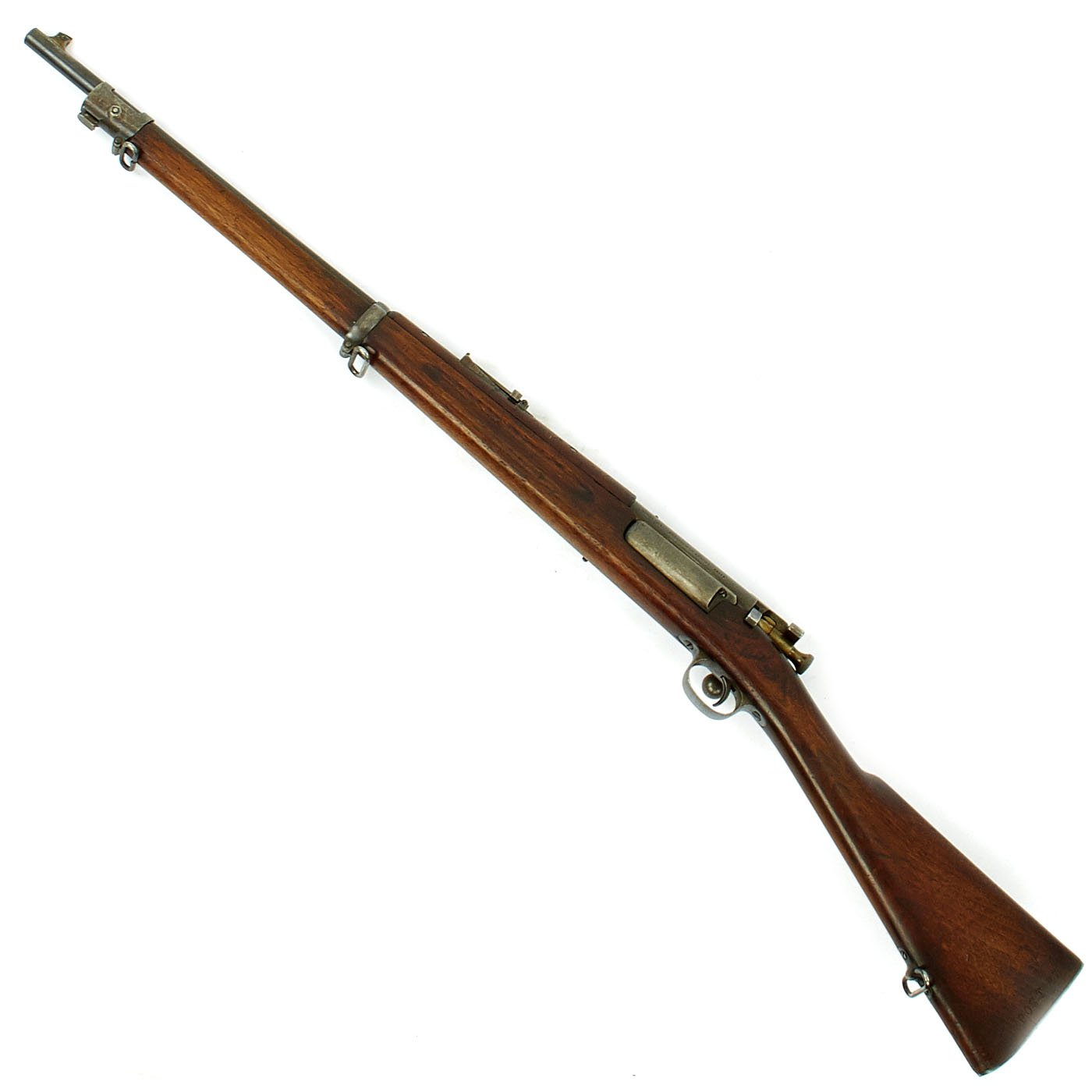 Research reveals that serial number 44095 dates the time of manufacture to the the second half of 1896, which is part of U.S. fiscal year 1897. The stock is fitted with a M1896 solid smooth buttplate with a curved toe and butt-trap. The handguard meets the front edge of the receiver fitted with the correct 1896 pattern rear sight. These are very desirable as a U.S. military service rifle as most of these rifles saw heavy use in the Spanish-American War and early 1900s until the development of the M1903 rifle.