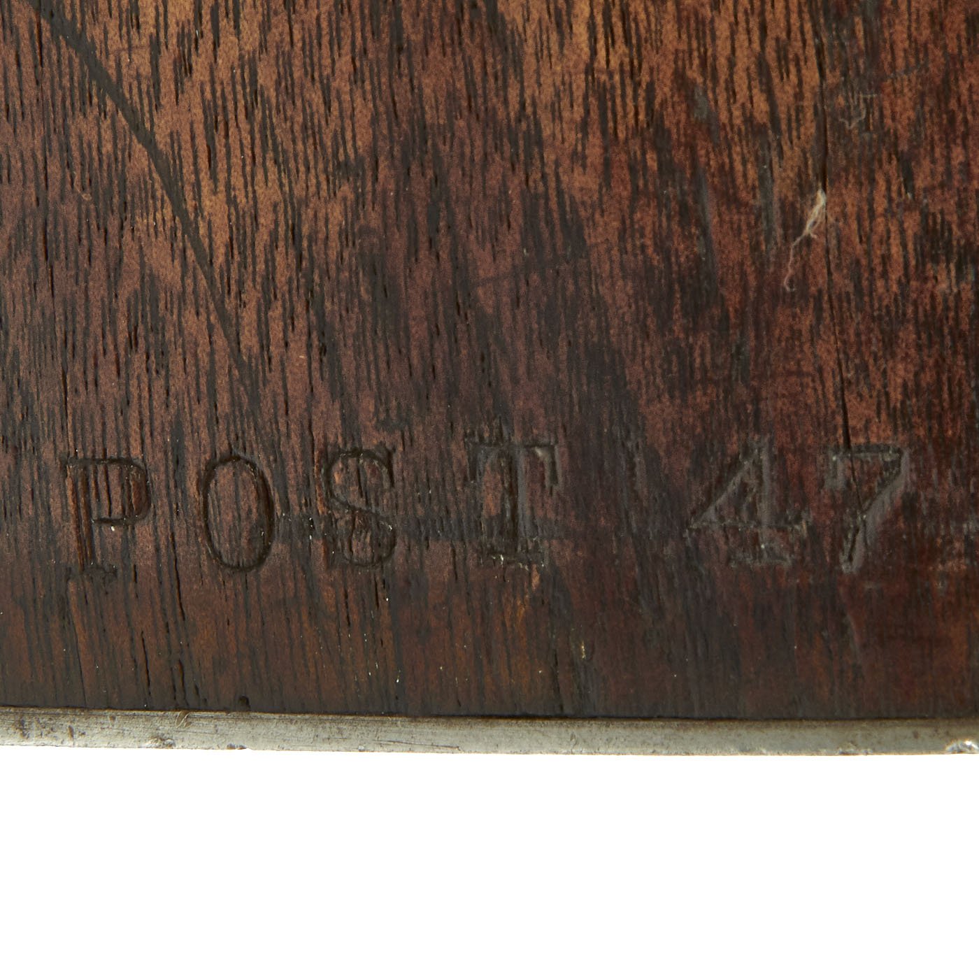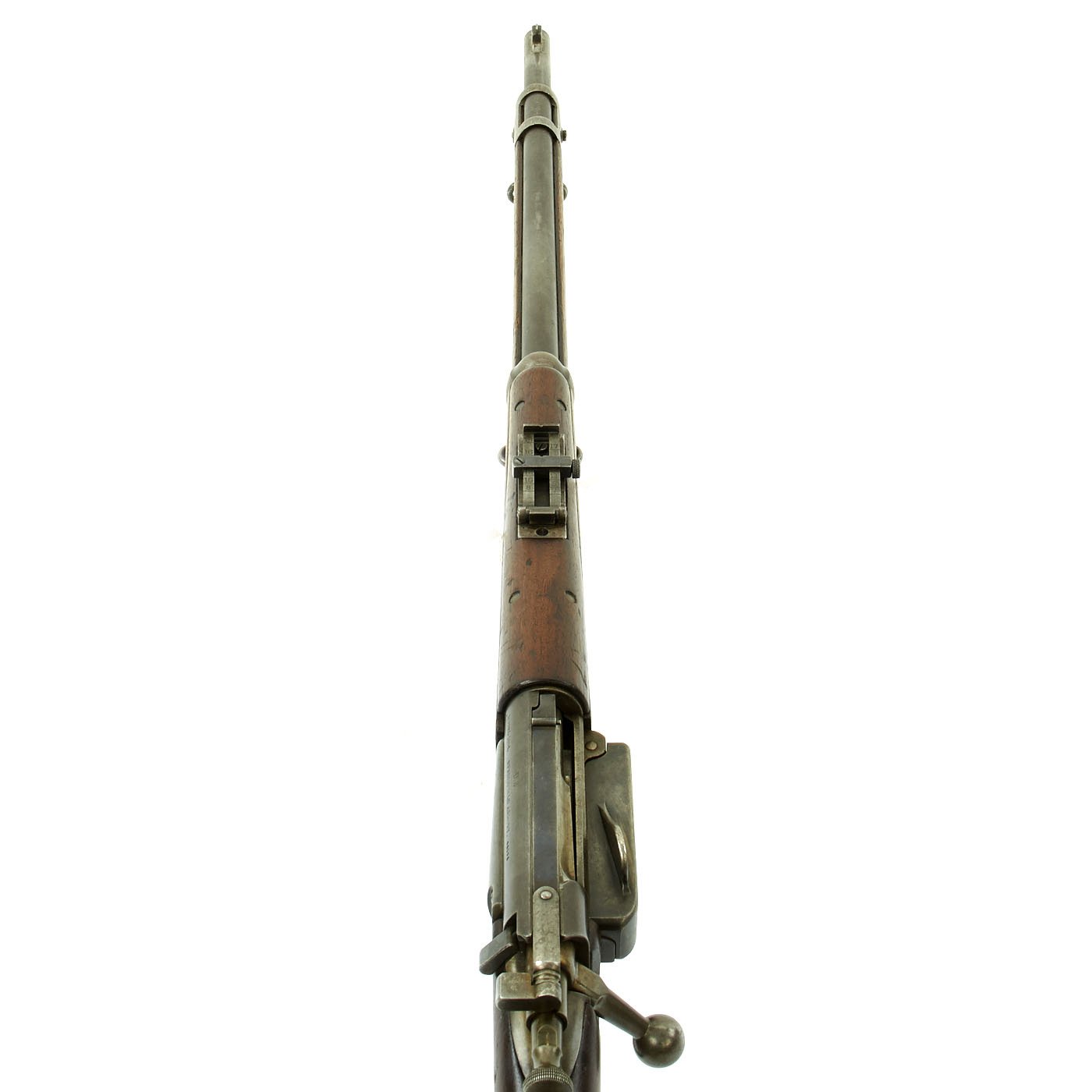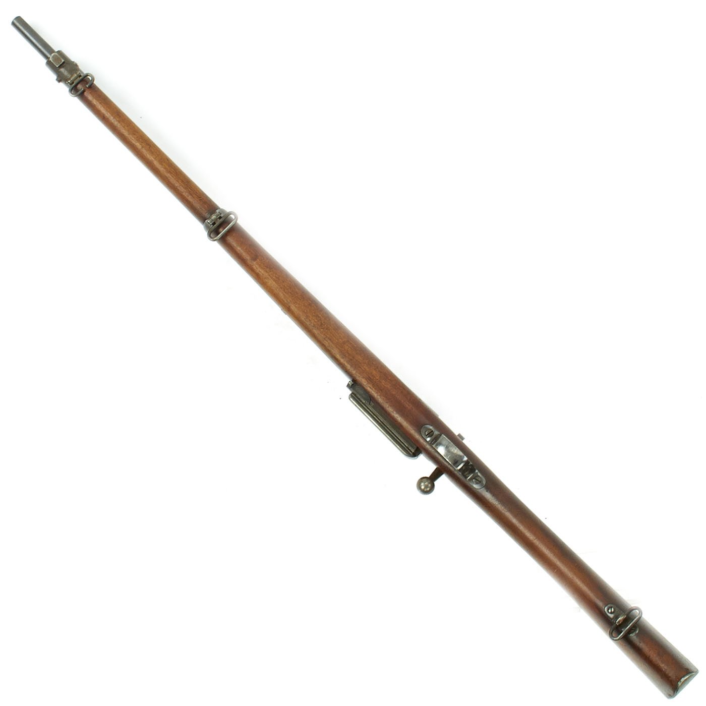 This example is in very good condition, and has a great aged, but well cared for appearance. The stock and handguard are in good condition, and have a nice aged walnut color, though the stock has definitely been sanded a bit, so the inspection cartouche on the left stock above the trigger guard is faded. There are traces of the original stylized "P" on the stock under the trigger guard, along with a freshly struck one, which indicates that the rifle passed overpressure testing twice. The metal components still have some of the original finish, but most is worn to a gray patina. The bore is very good, being bright with clear lands and grooves.
