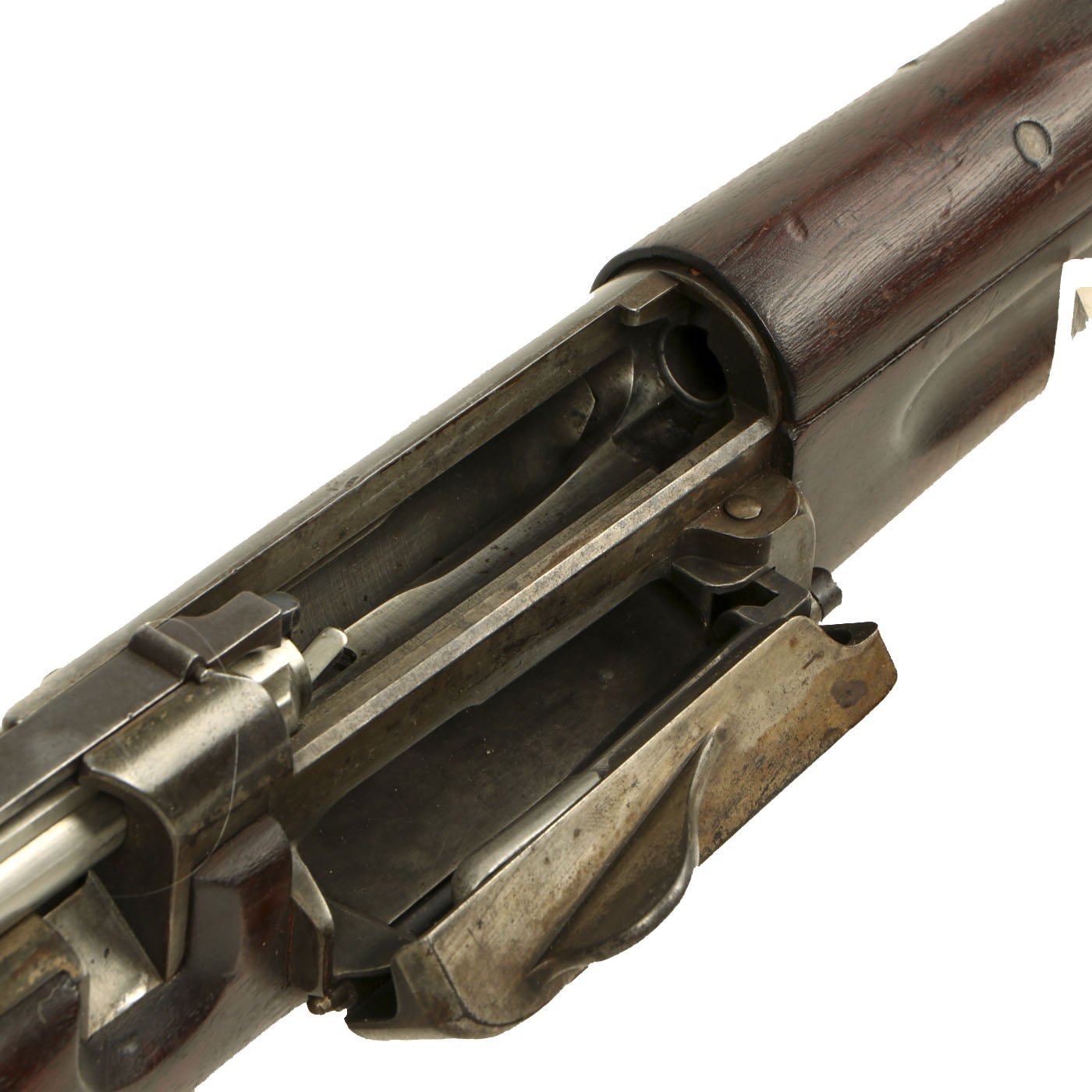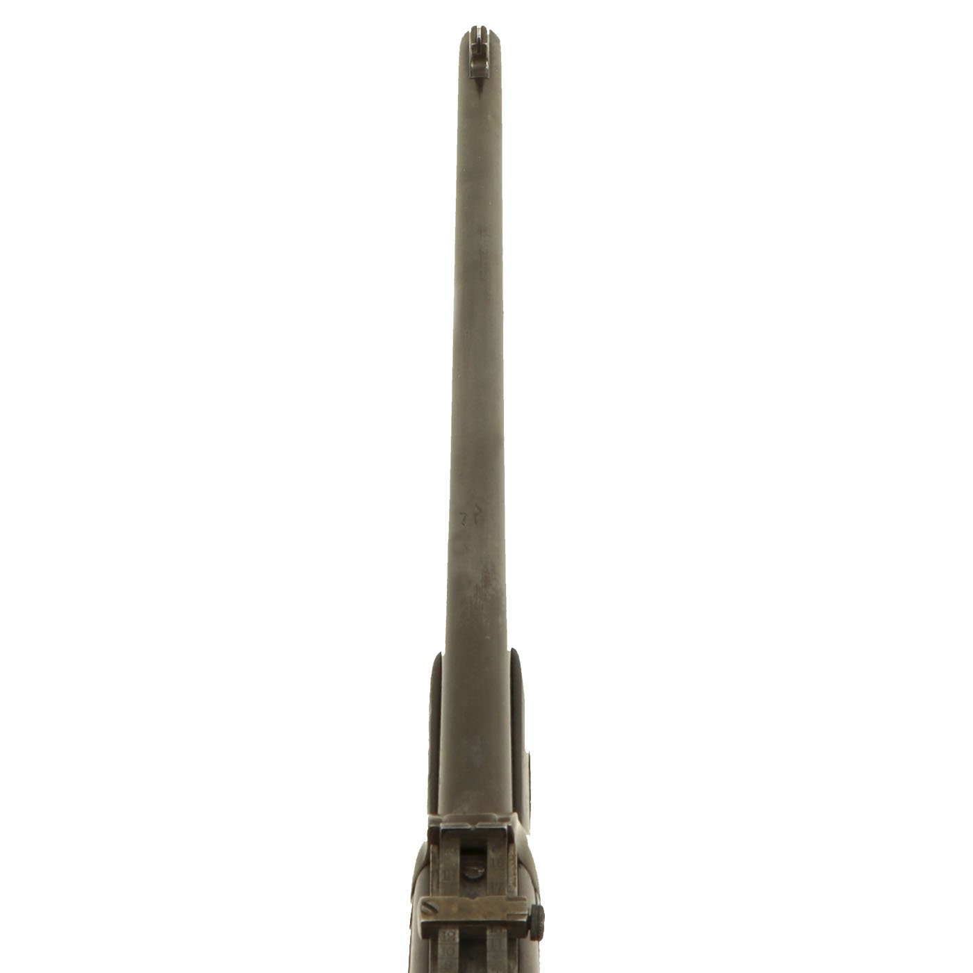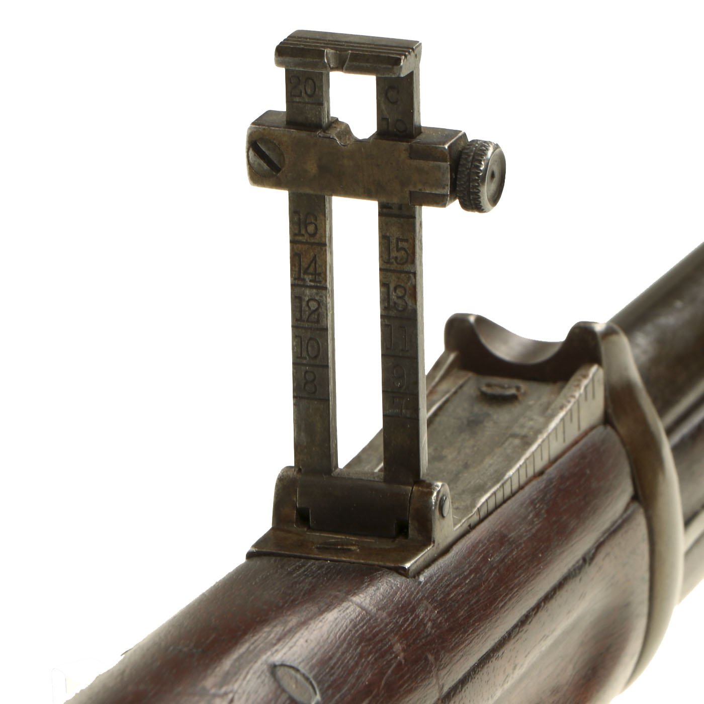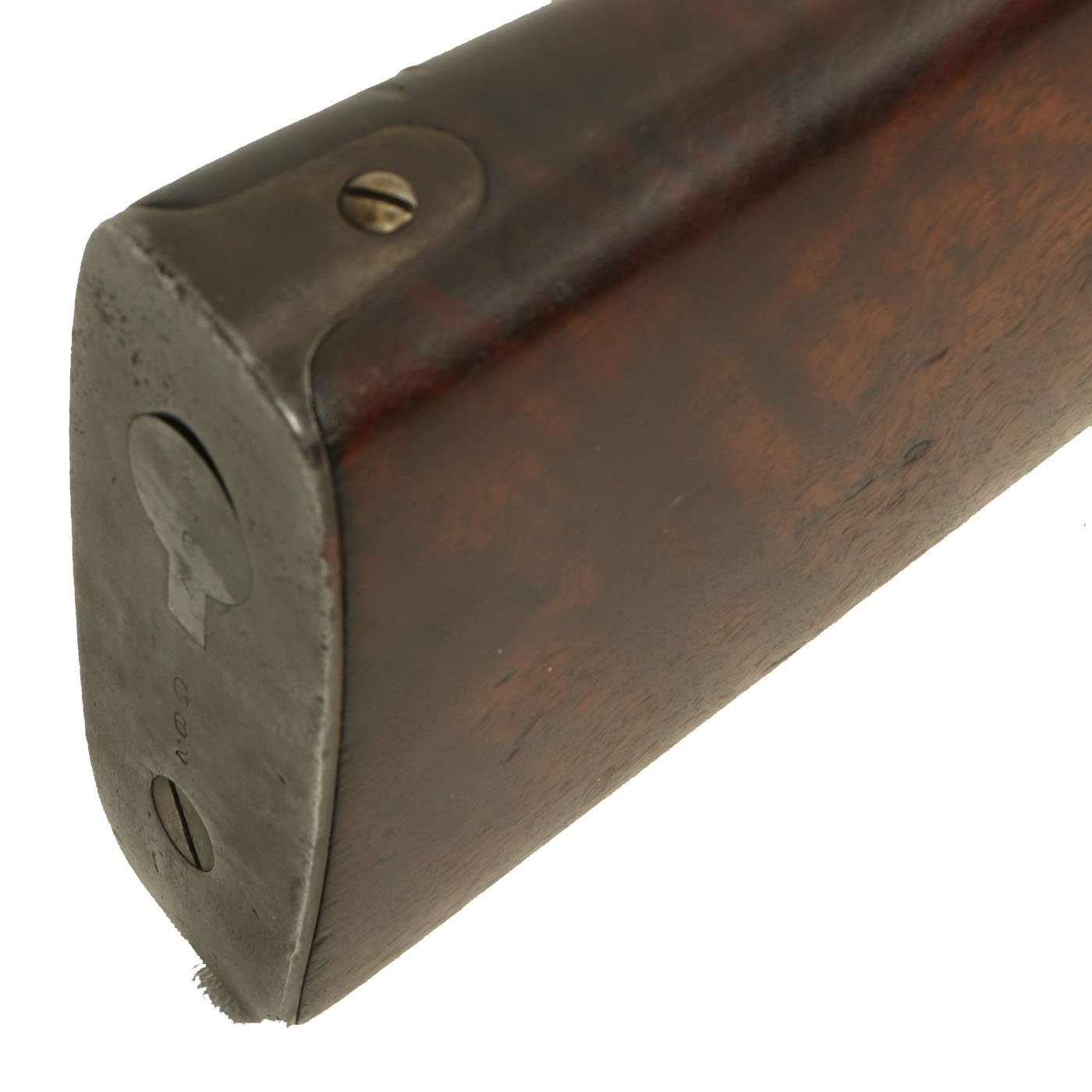 The Carbine Model 1896 features features the later bolt with the extractor with pin and the receiver is machined to work with the pin. The handguard meets the front edge of the receiver fitted with the correct pattern M1896 rear sight. This is surrounded by the correct hand guard, with the barrel band sight guard directly in front to protect it. The stock is fitted with a M1896 solid smooth buttplate with a curved toe and butt-trap, which is unfortunately empty. It still features the original 22 inch barrel, and has not been modified from the original issue configuration.