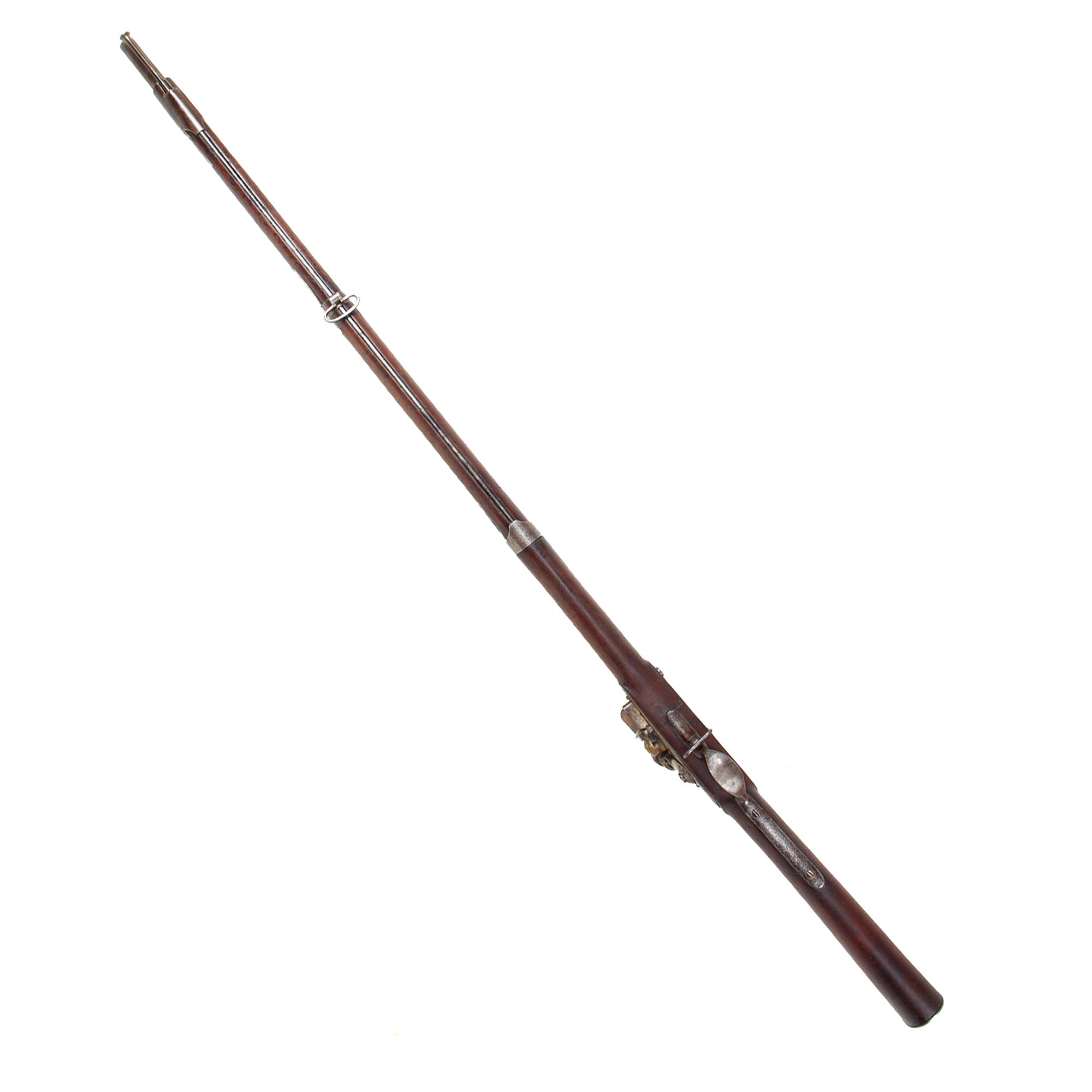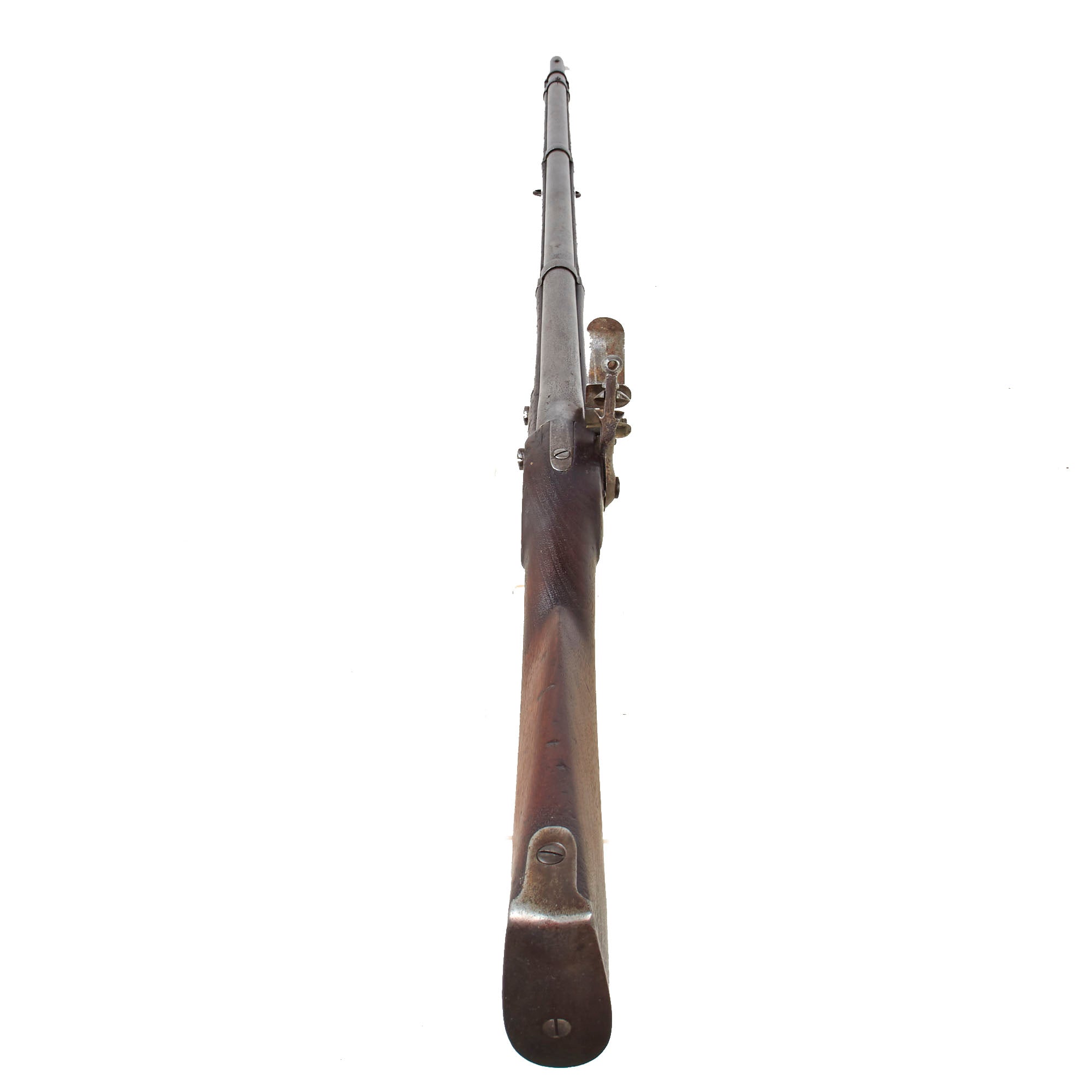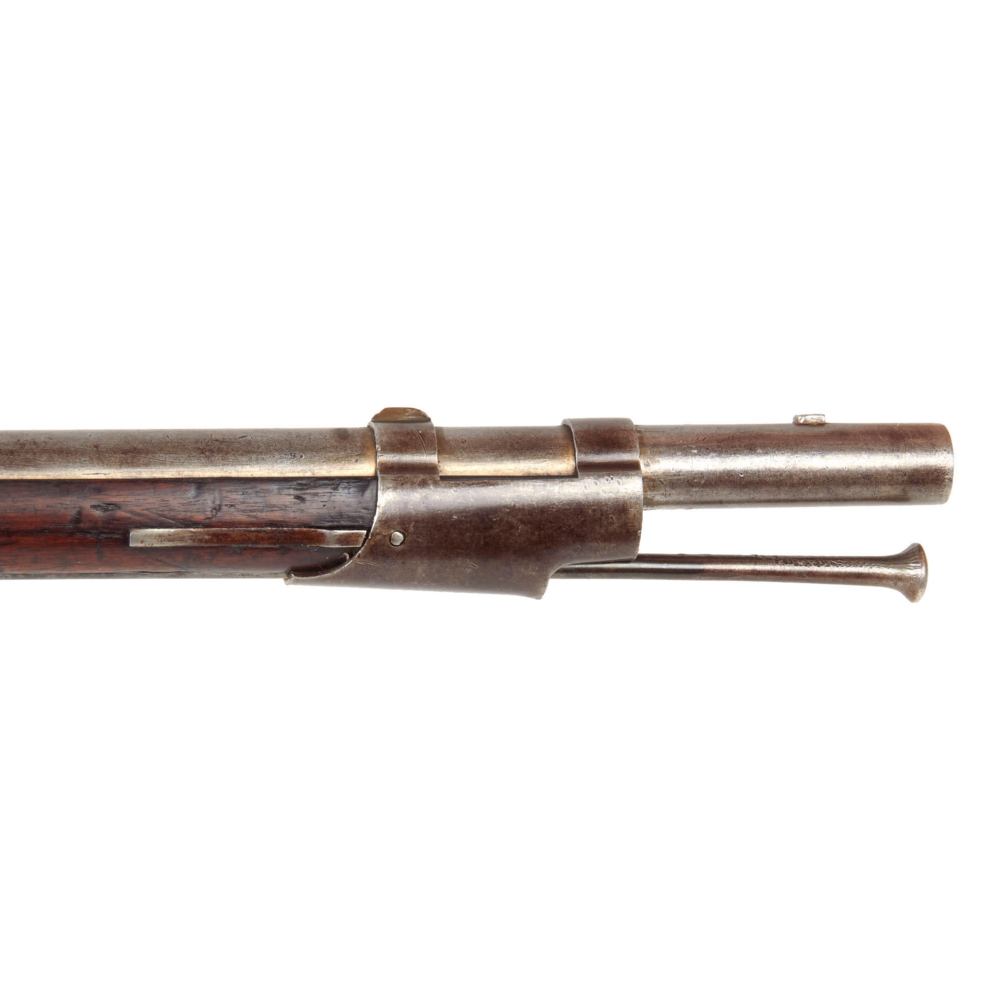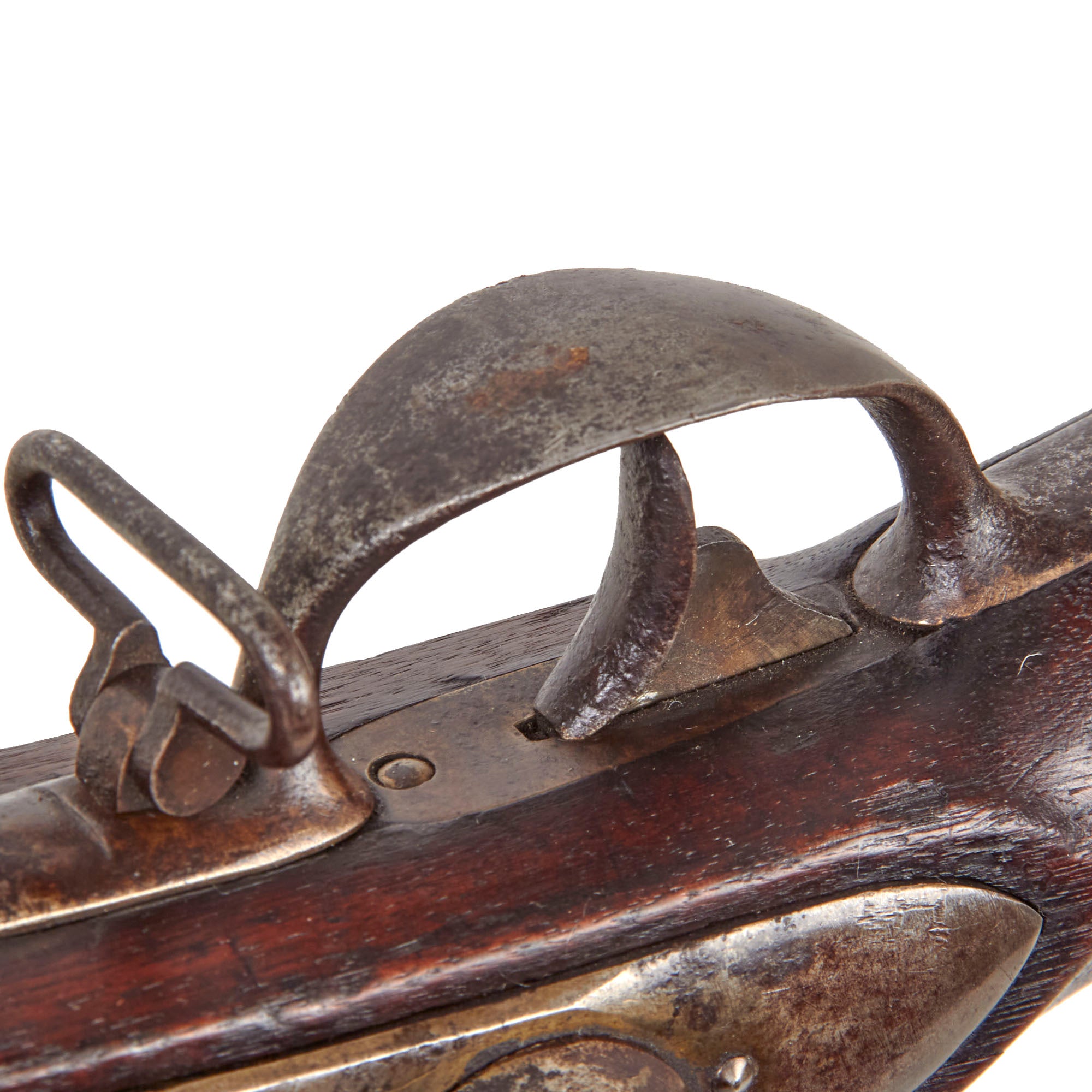 Overall this is a very nice patinated example of a Model 1816 Long Musket, with signs of long service in the field. The barrel and metalwork show signs of past peppering and light pitting, now mostly cleaned away but leaving a lovely mottled patina in areas. The lock is fully functional, holding correctly at half cock and firing at full, though it is a bit stiff. The stock is in lovely condition, showing a fantastic red brown color, only possible on aged and oiled walnut. It shows wear and denting, as well as staining around the iron fittings from rust and moisture. There is a good amount of wear around the fittings, and we can definitely see that repeated cleanings have removed some wood. Both sling swivels are present and move relatively easily, and the cleaning rod looks to be original, still retaining threads on the end.