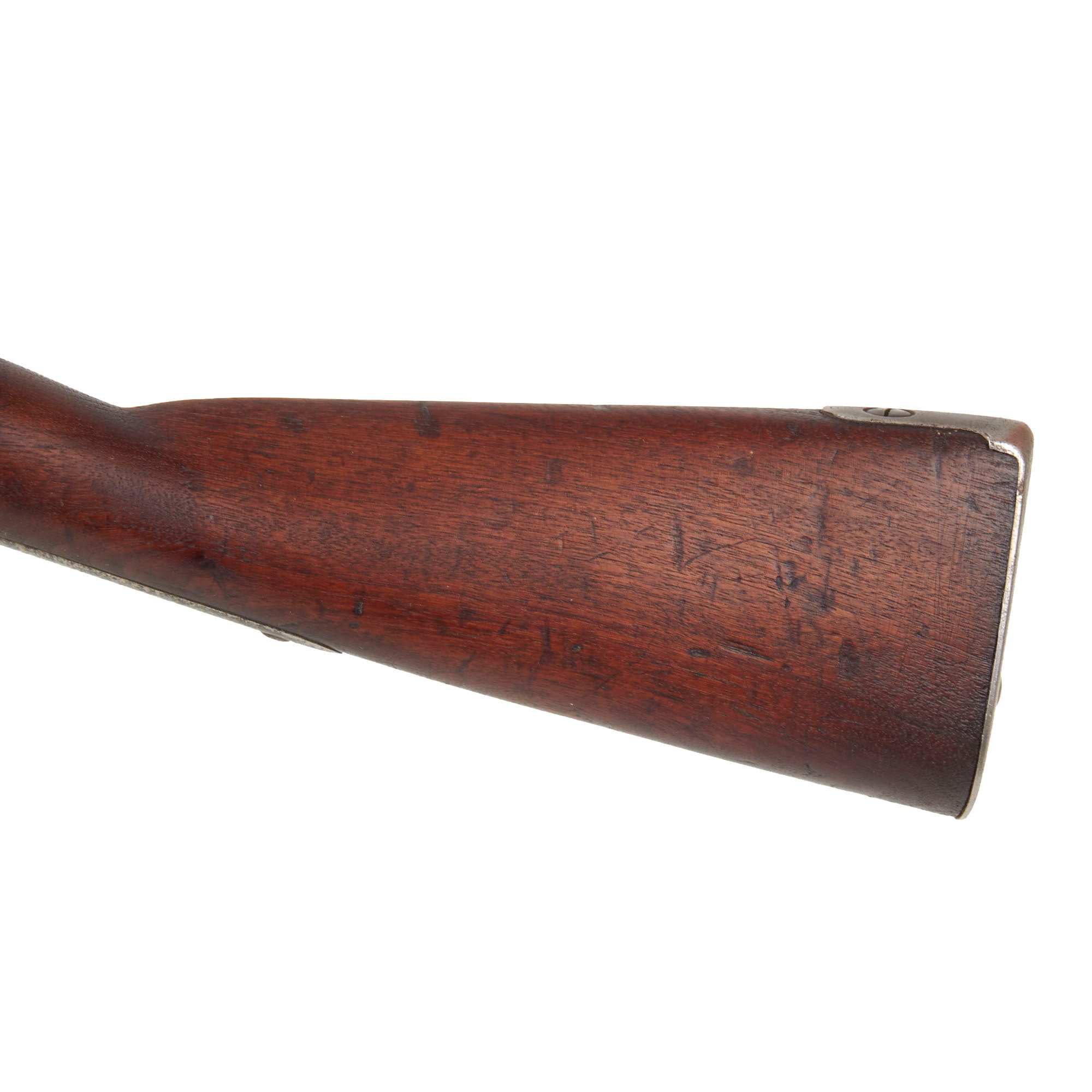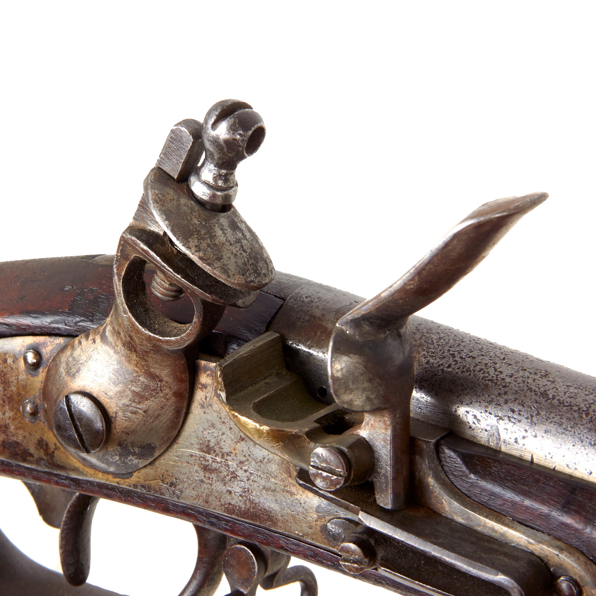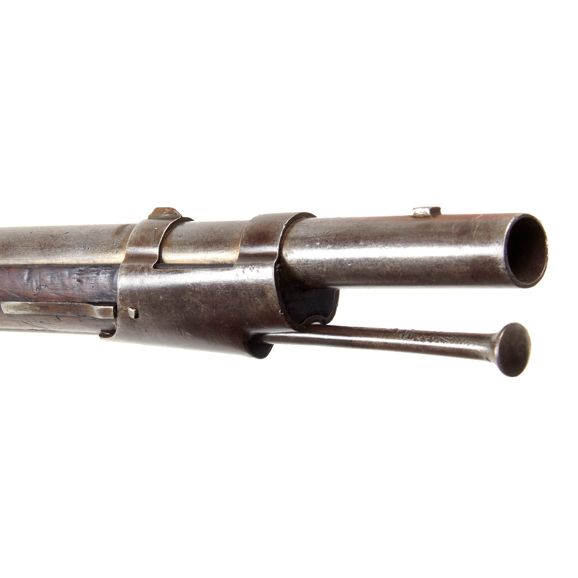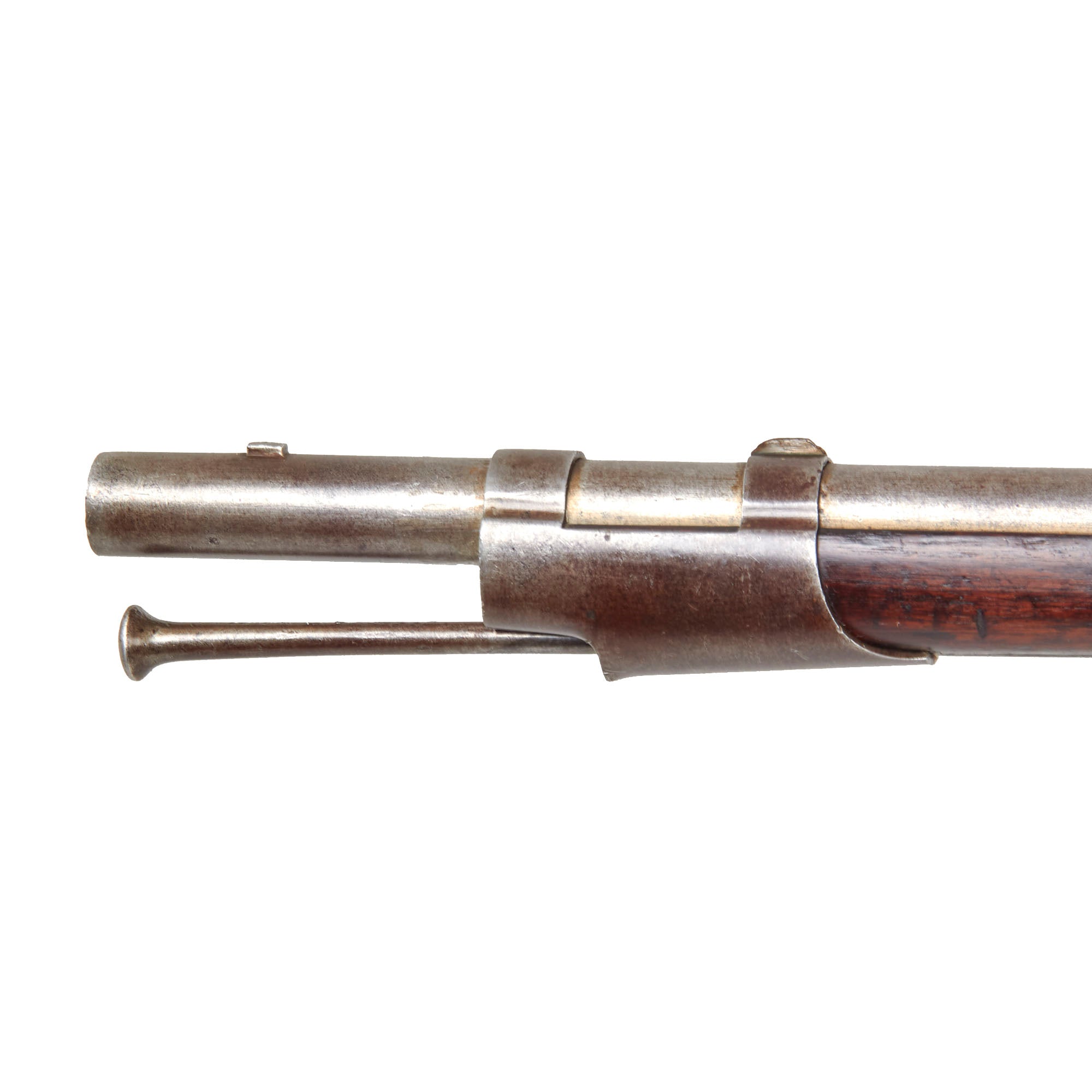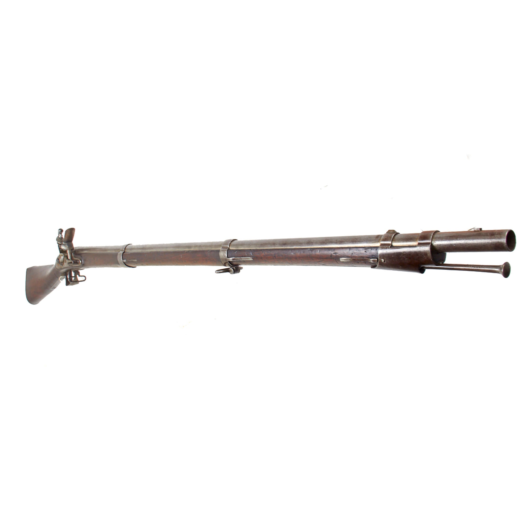 Overall this is a very nice patinated example of a Model 1816 Long Musket, with signs of long service in the field. The barrel and metalwork show signs of past peppering and light pitting, now mostly cleaned away but leaving a lovely mottled patina in areas. The lock is fully functional, holding correctly at half cock and firing at full, though it is a bit stiff. The stock is in lovely condition, showing a fantastic red brown color, only possible on aged and oiled walnut. It shows wear and denting, as well as staining around the iron fittings from rust and moisture. There is a good amount of wear around the fittings, and we can definitely see that repeated cleanings have removed some wood. Both sling swivels are present and move relatively easily, and the cleaning rod looks to be original, still retaining threads on the end.
