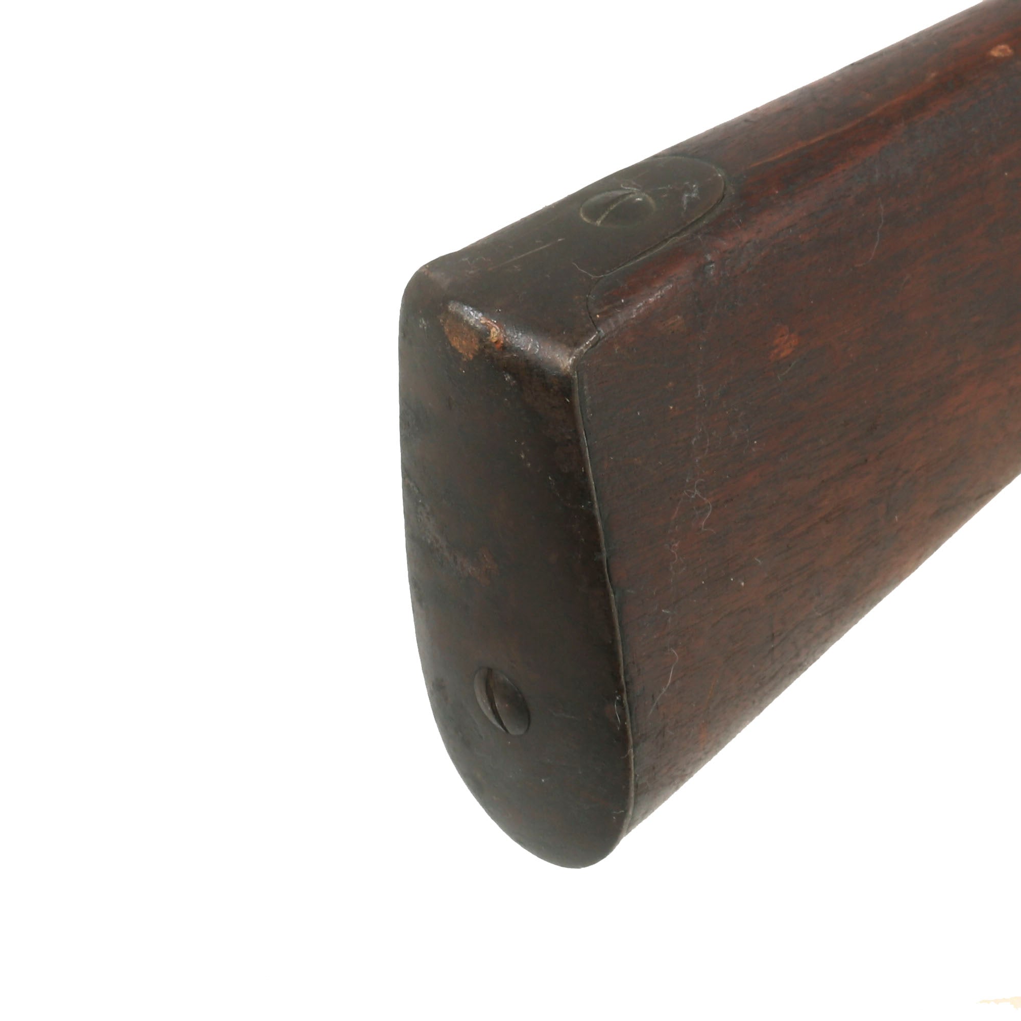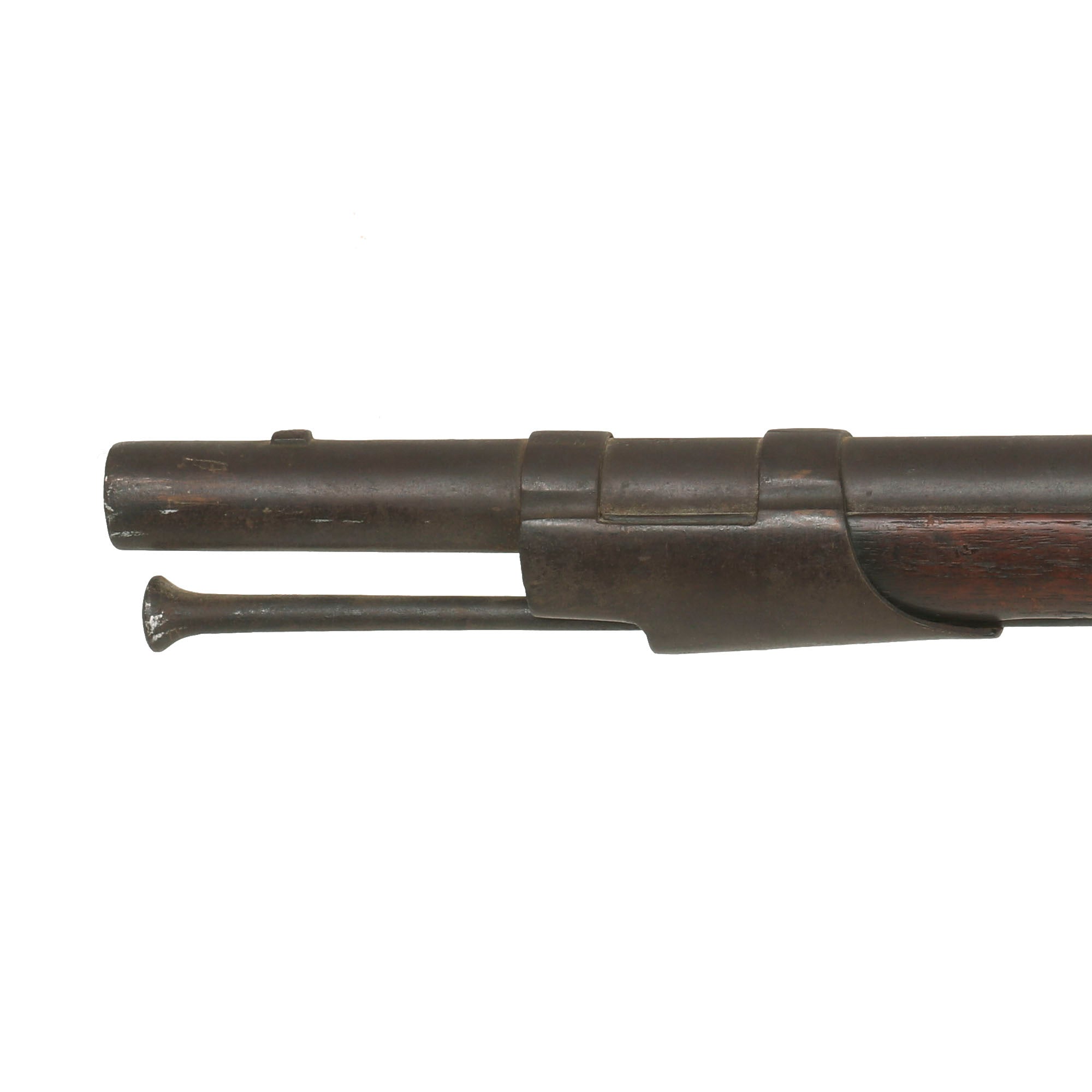 The stock is in lovely condition, showing a fantastic red brown color, only possible on aged and oiled walnut. It shows some wear and denting, but no major damage, and the only crack we can see is a stress crack on the lower left butt stock, which has no movement. The metalwork shows a lovely brown oxidized patina, which is really quite lovely, very similar to the "arsenal brown" finish used during the early part of the 19th century. The lock still functions correctly, holding at full cock and firing at full, and the sling swivels are both still present and move easily. The cleaning rod is still present as well.