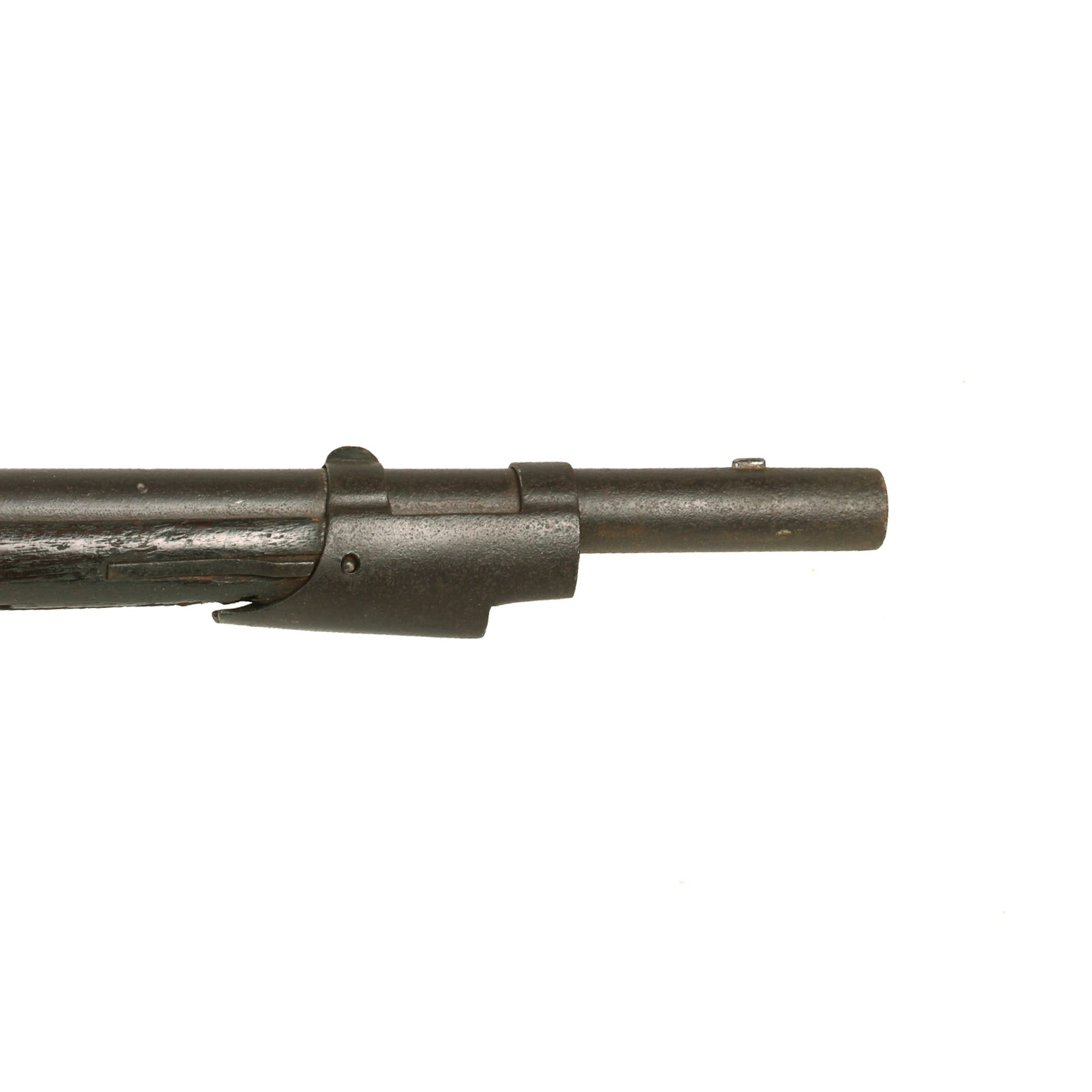 Overall this is a very good patinated example of a Model 1816 Long Musket, still in the original flintlock configuration with no signs of alteration or reconversion to the lock and barrel. The stock is in very nice condition, showing evidence of long use, with the expected dents and dings from service, and overall wear. It also was split completely through the wrist at some point, and there are wood graft repairs on the back and through the wrist area used to repair it, most likely at some point during the mid 20th century. There is also some cracking under the fore stock along the ramrod channel with a small hole into the channel.