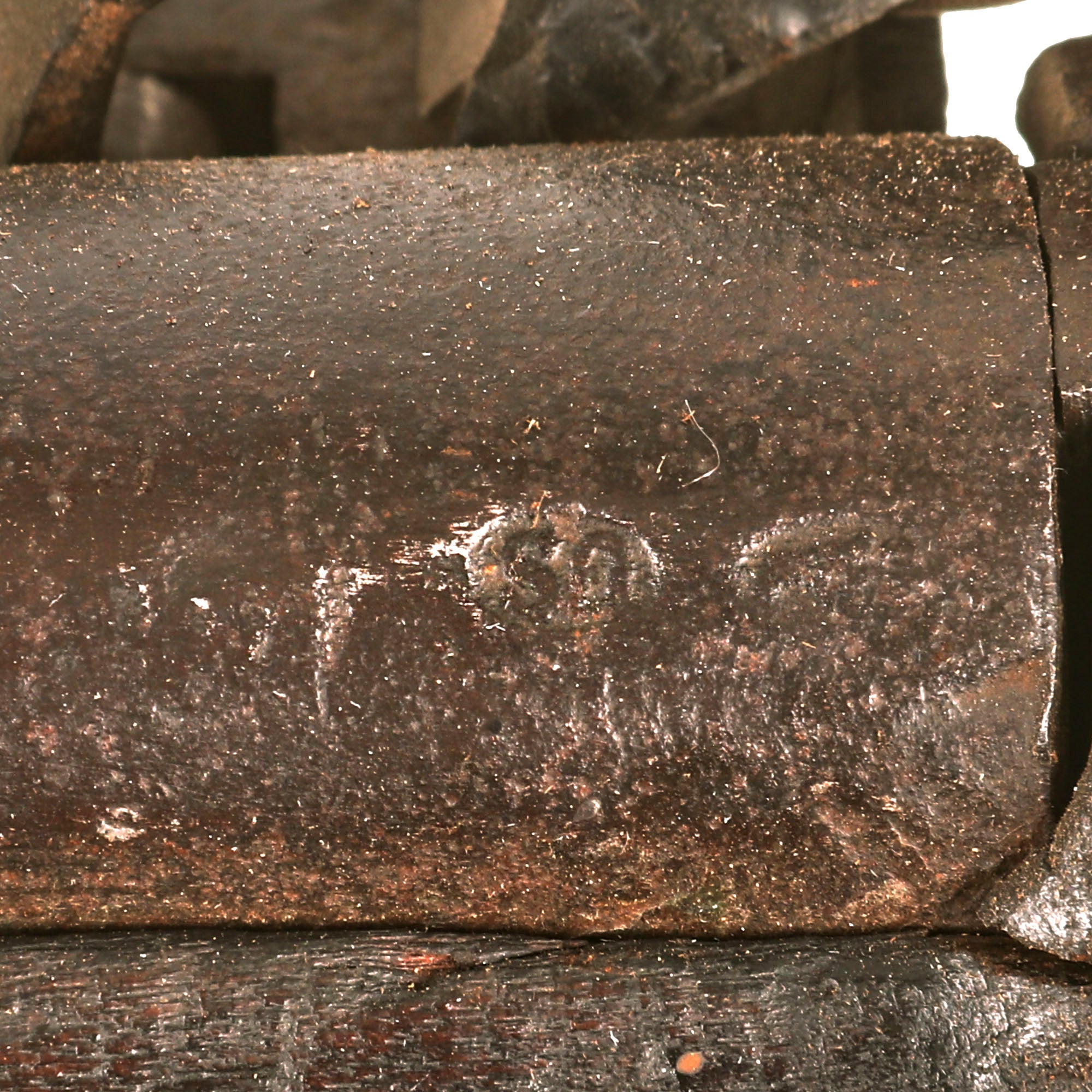 There is also a EAGLE over U.S. marking on the lock plate in front of the hammer, which is still visible amidst the rust peppering on the lock plate. The left side of the barrel breech is marked with faint oval US and Eagle's Head proofs, correct for this time period, as the "Liberty Cap" had been deprecated in 1799 in favor of other markings. There are no markings on the stock we can see, and powder burn from the flash pan has most likely removed addition markings on the barrel.