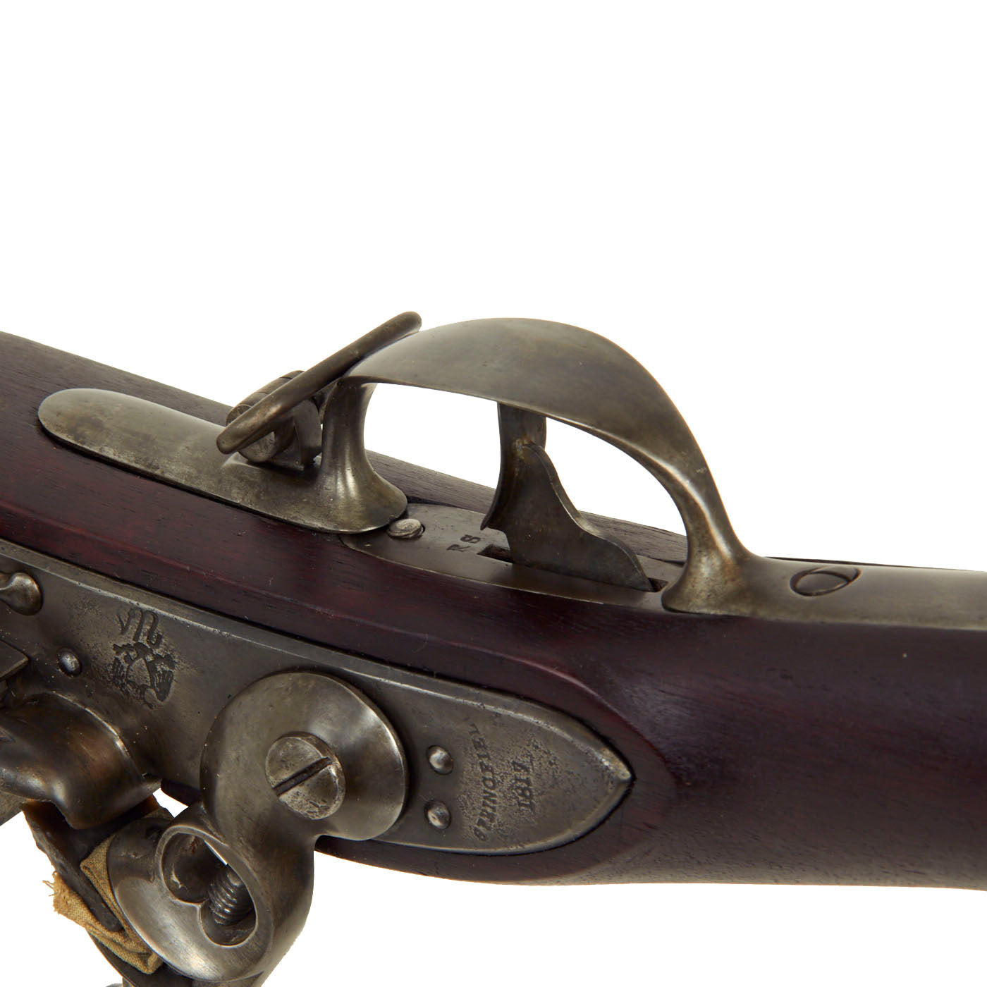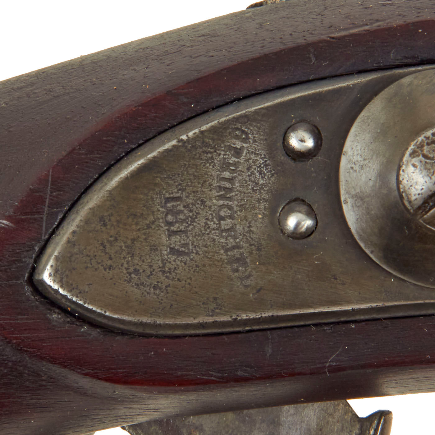 There is also an EAGLE over U.S. on the lock plate in front of the hammer, the standard marking seen on these locks. The side of the barrel nocks form is marked P / Eagle's Head / V, the standard Springfield Armory proof mark in of the era and later, first instituted in 1799, replacing the earlier "Liberty Cap" marking. The barrel tang is dated clearly with 1817, and there is also A 47 on the barrel just in front of the tang. There are traces of cartouches stamped into the left side of the stock behind the lower lock screw, however we cannot make out anything accurately.