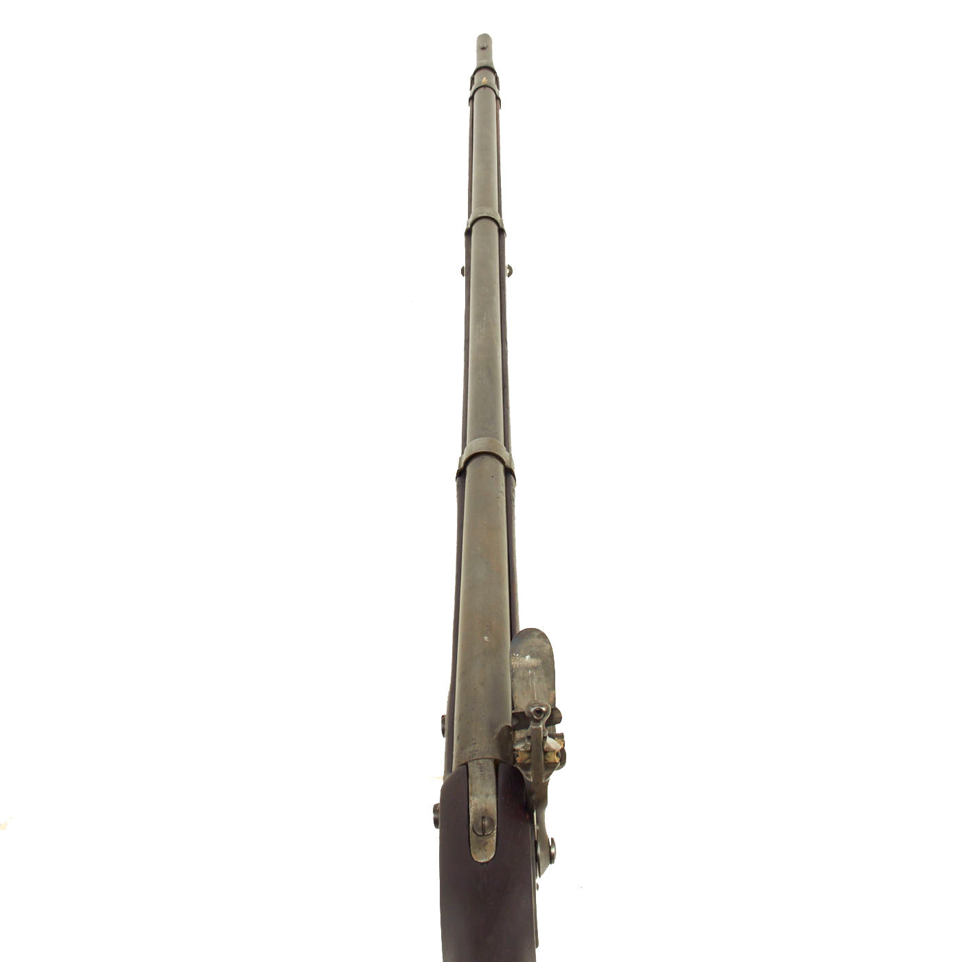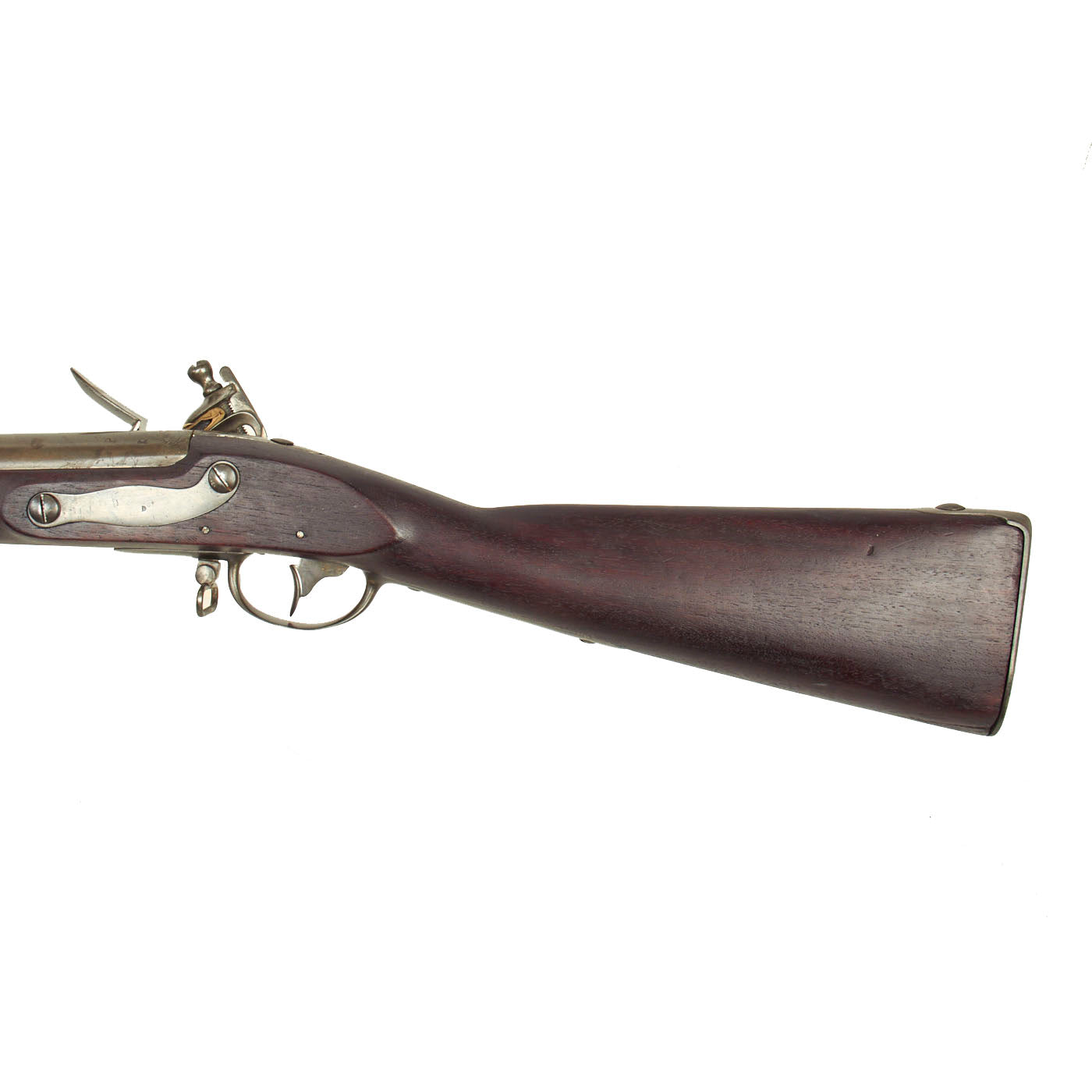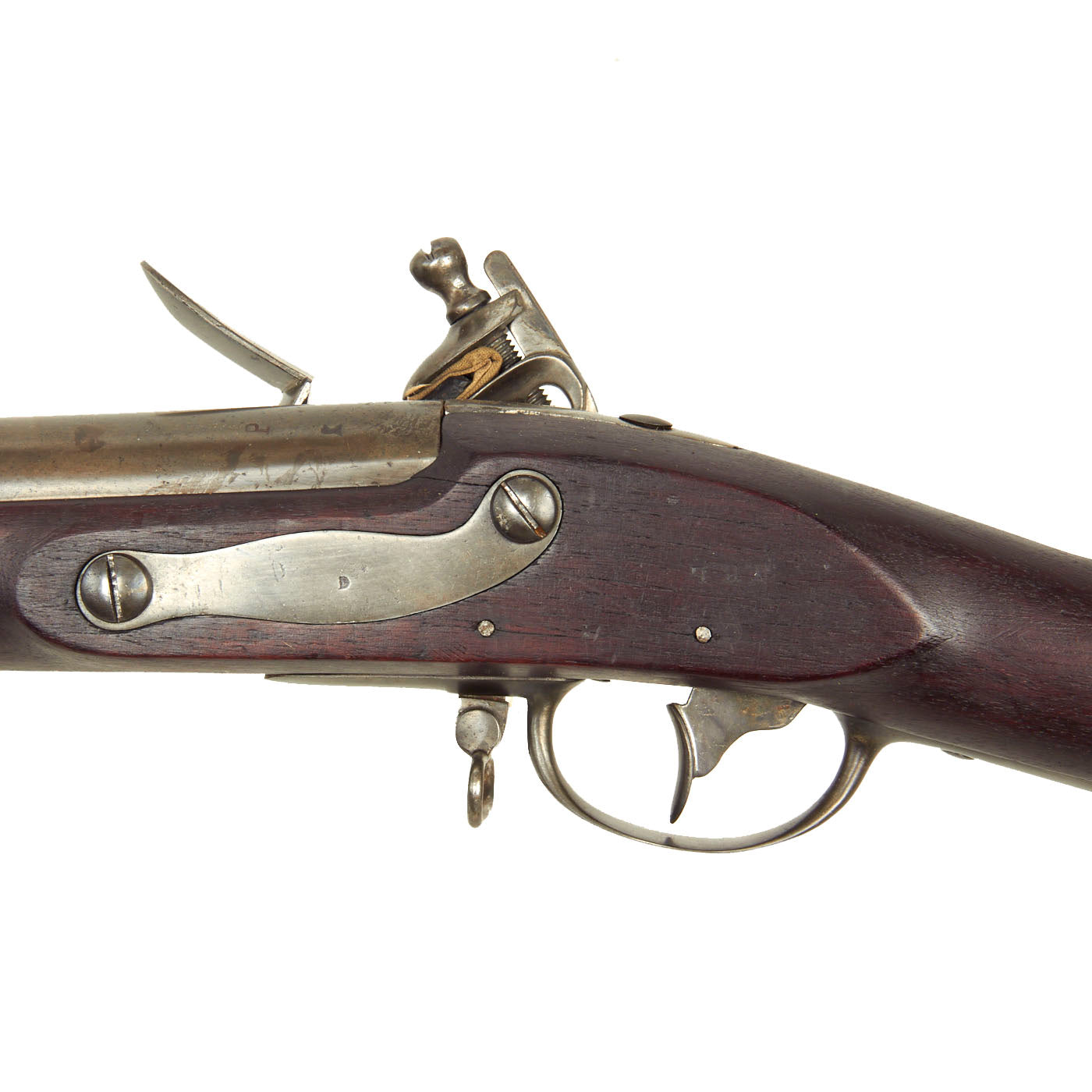 Overall this is a great example of a Model 1816 Long Musket, with a great look. The metalwork overall has a lovely gray patina of age, acquired from centuries of age and cleaning. The iron mounts are all present, and exactly correct. The lock functions correctly, holding at half cock and firing at full. It is however a bit stiff, and requires a strong trigger pull. It moves relatively slowly when firing, so the trigger must be held down to keep it from sticking at half cock. The iron butt plate is also stamped U.S. and the overall condition of the musket is just lovely.
