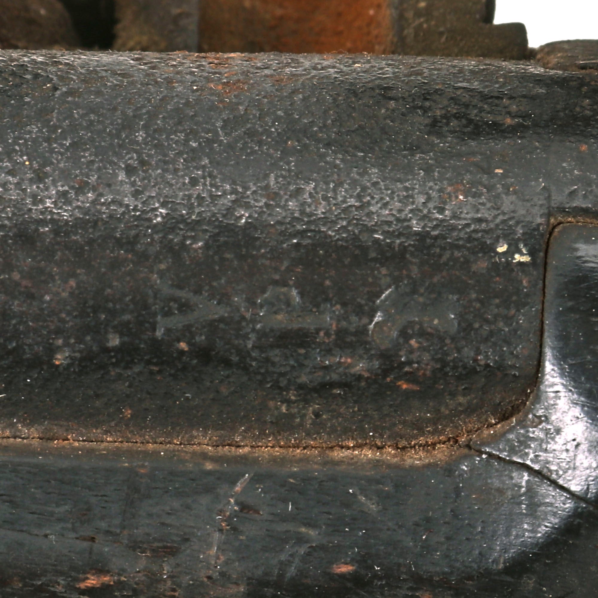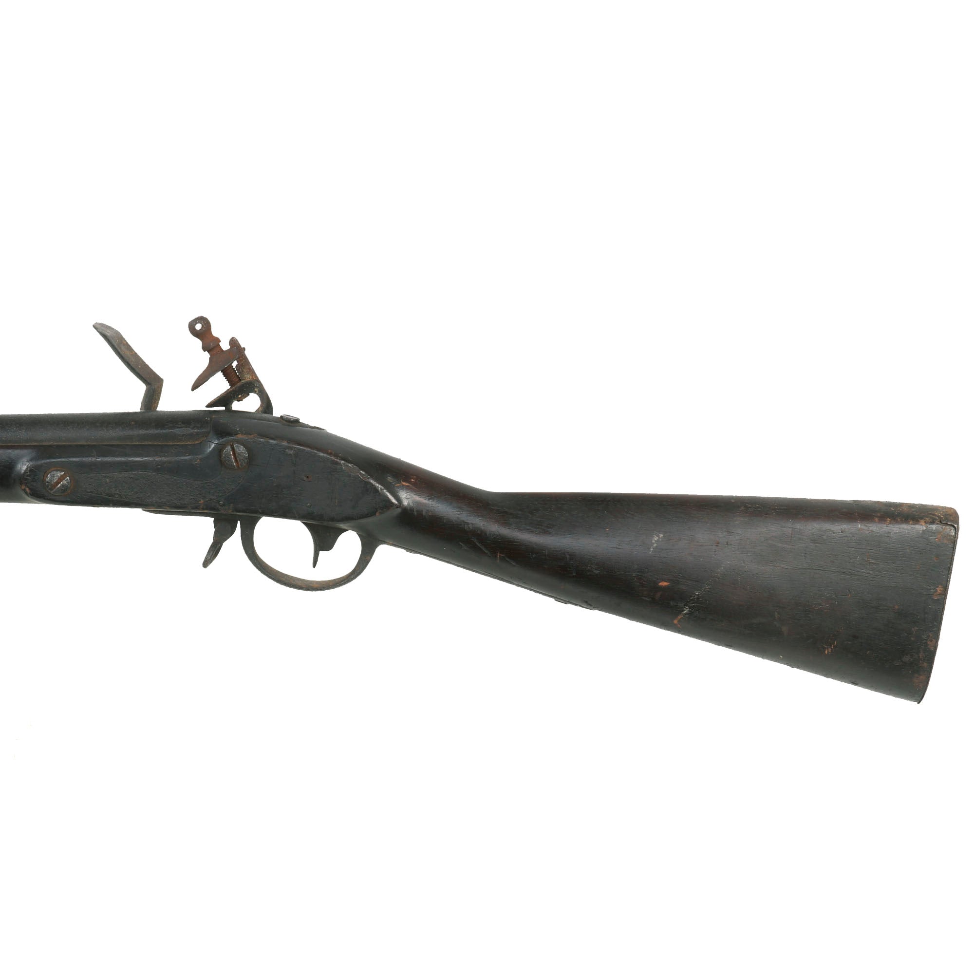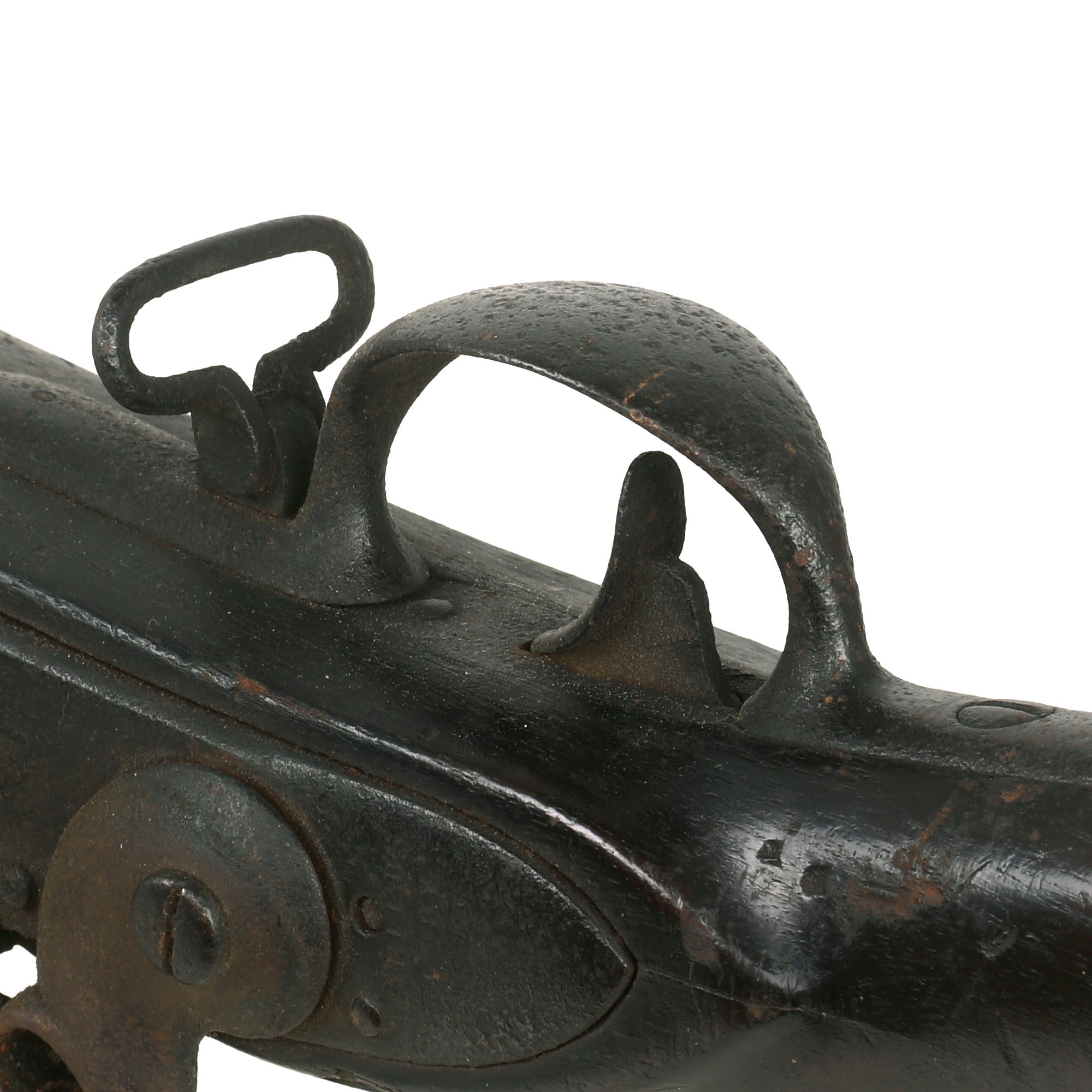 The metalwork is lovely, showing a nice aged brown peppered patina overall, with past rust pitting giving it a lovely "attic found" look. Like a time capsule, all we did was remove the dust to preserve the fantastic aged look. In spite of the oxidation, the lock still functions correctly, holding at full cock and firing at full. The upper sling swivel is missing, and the lower sling swivel is present, but seized. It still has the correct ramrod under the barrel, which does have some threads on the end, so it was definitely made for this short musket.