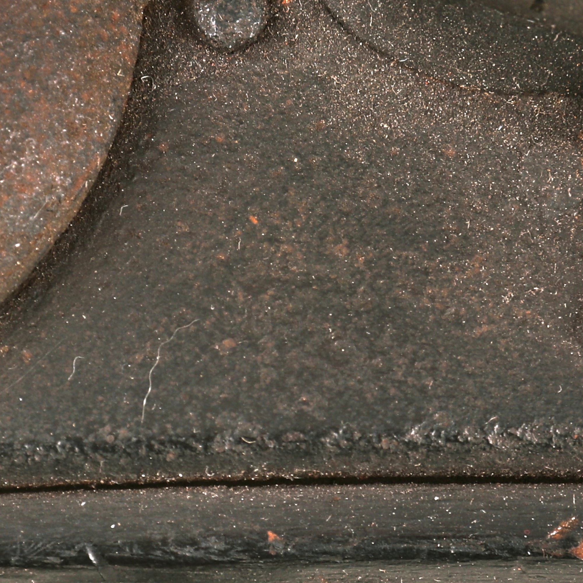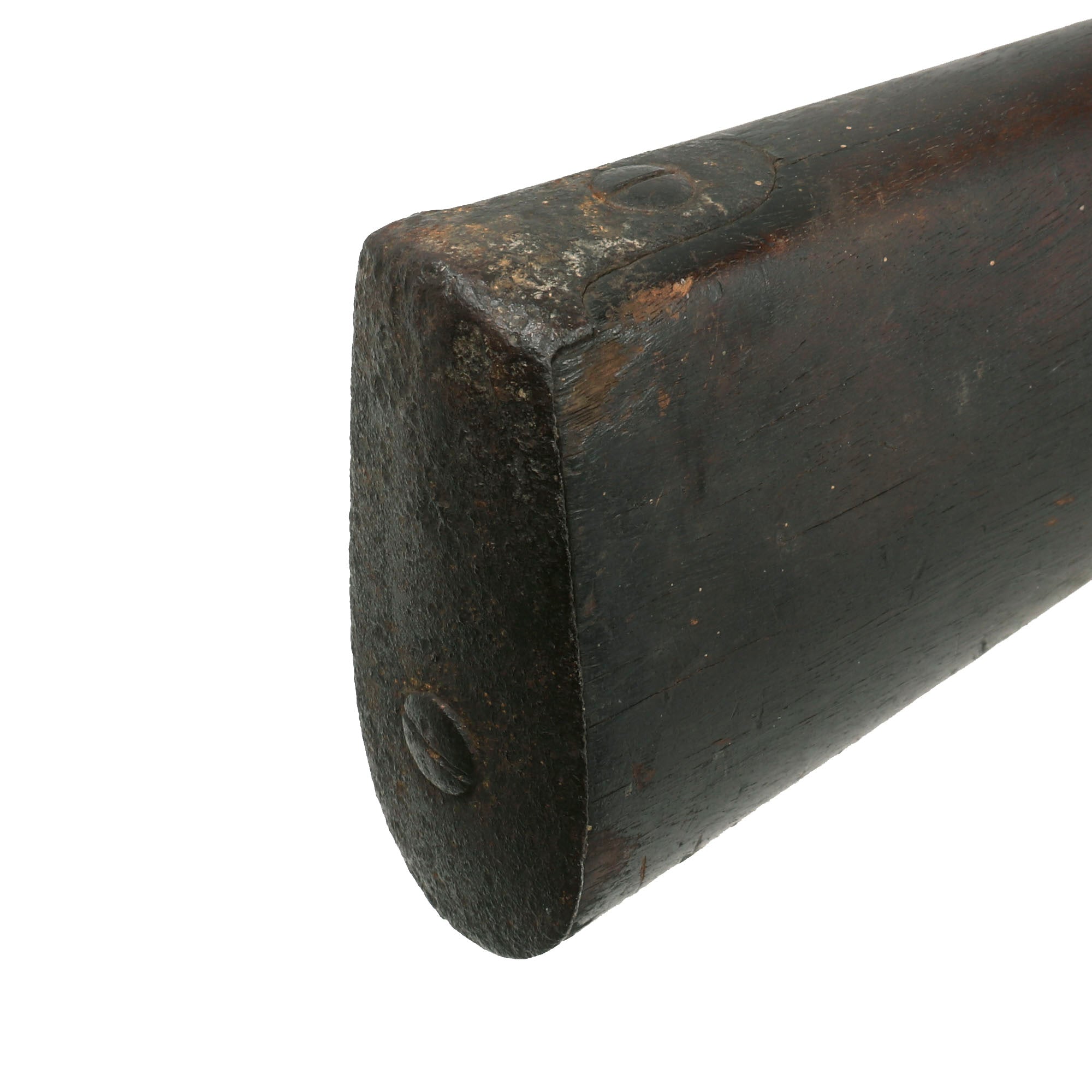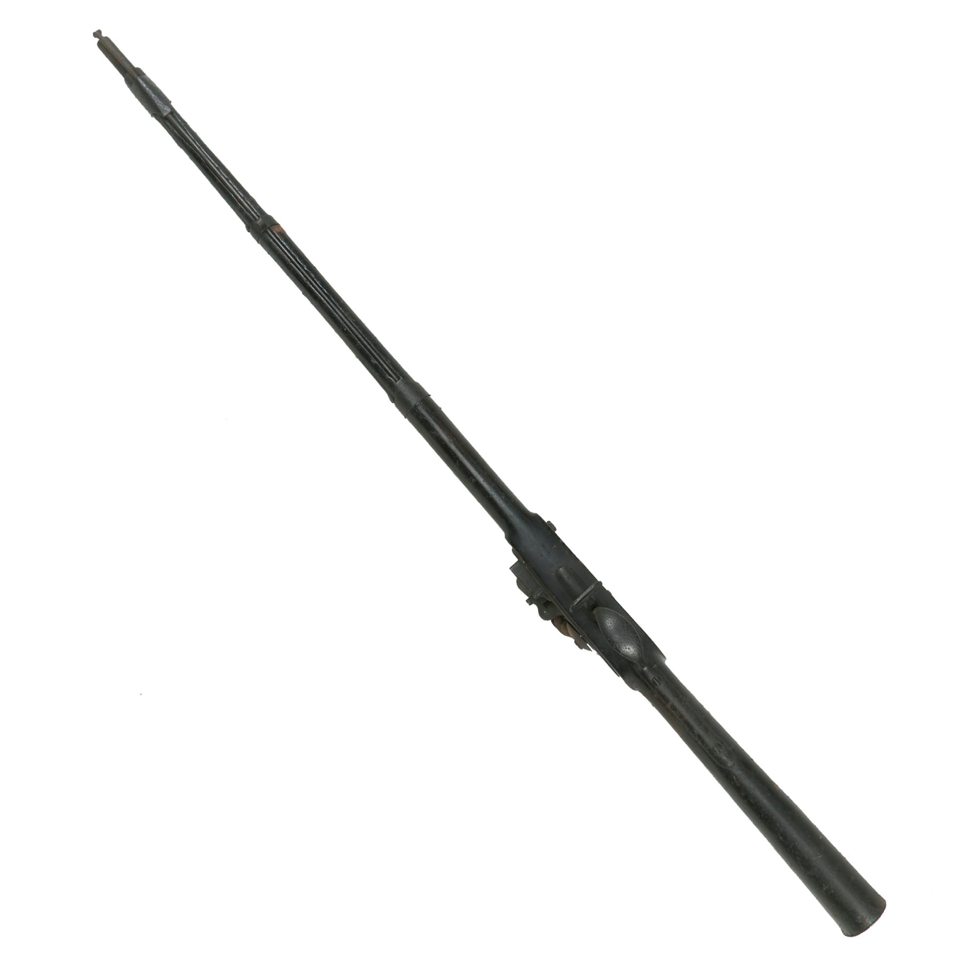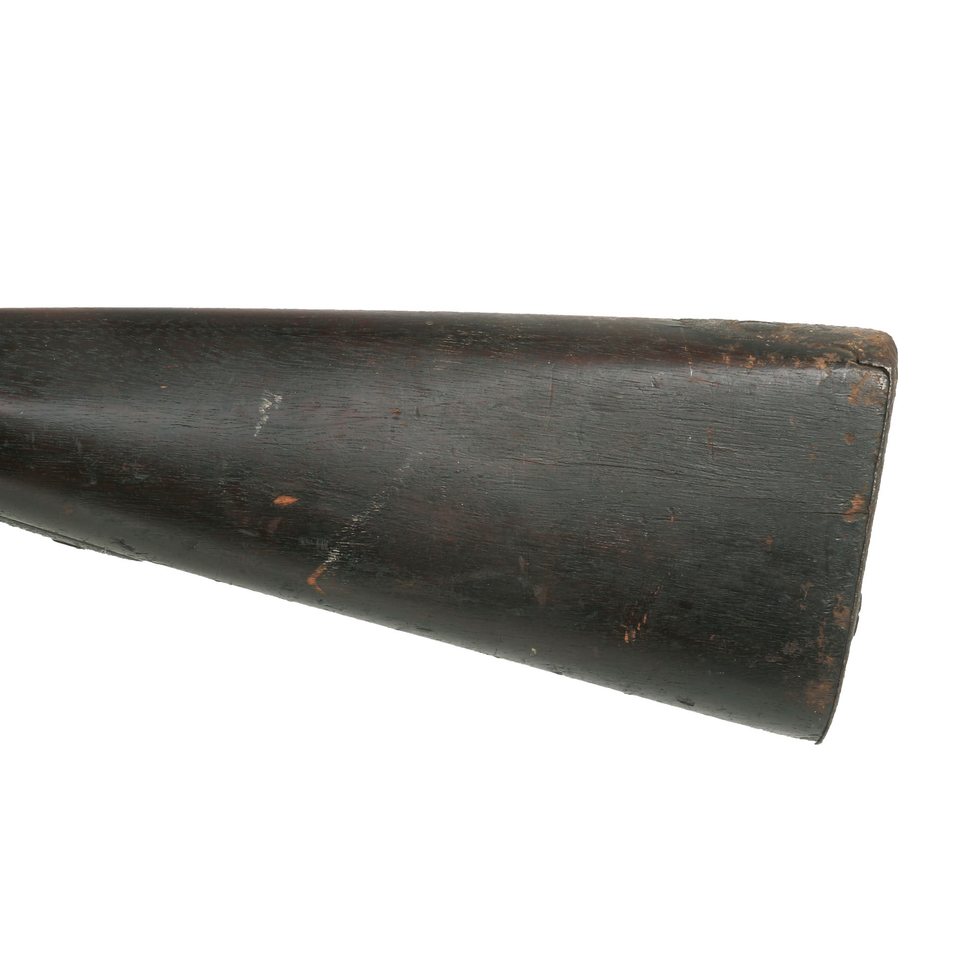 The metalwork is lovely, showing a nice aged brown peppered patina overall, with past rust pitting giving it a lovely "attic found" look. Like a time capsule, all we did was remove the dust to preserve the fantastic aged look. In spite of the oxidation, the lock still functions correctly, holding at full cock and firing at full. The upper sling swivel is missing, and the lower sling swivel is present, but seized. It still has the correct ramrod under the barrel, which does have some threads on the end, so it was definitely made for this short musket.