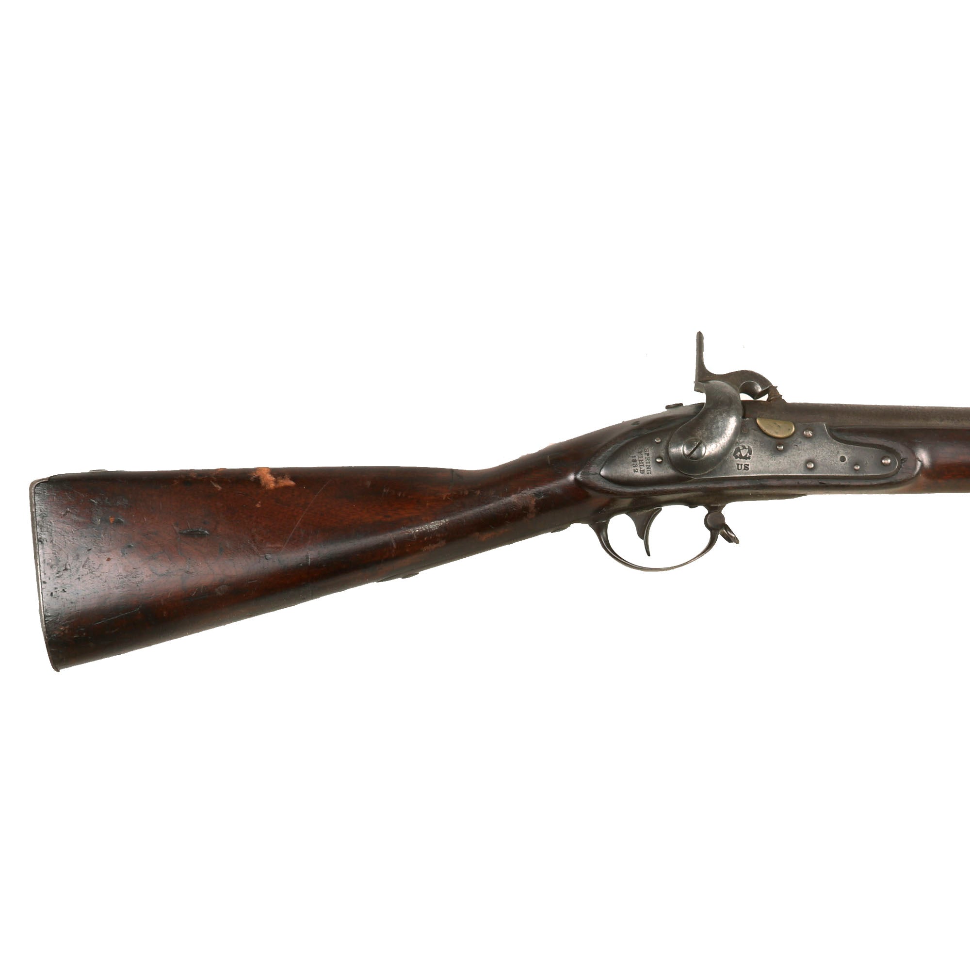 This nice patinated example still has the remnants of the brass pan intact on the lock plate, and was originally manufactured at the United States Armory and Arsenal at Springfield itself in 1832, as indicated by markings on the tail of the lock plate: