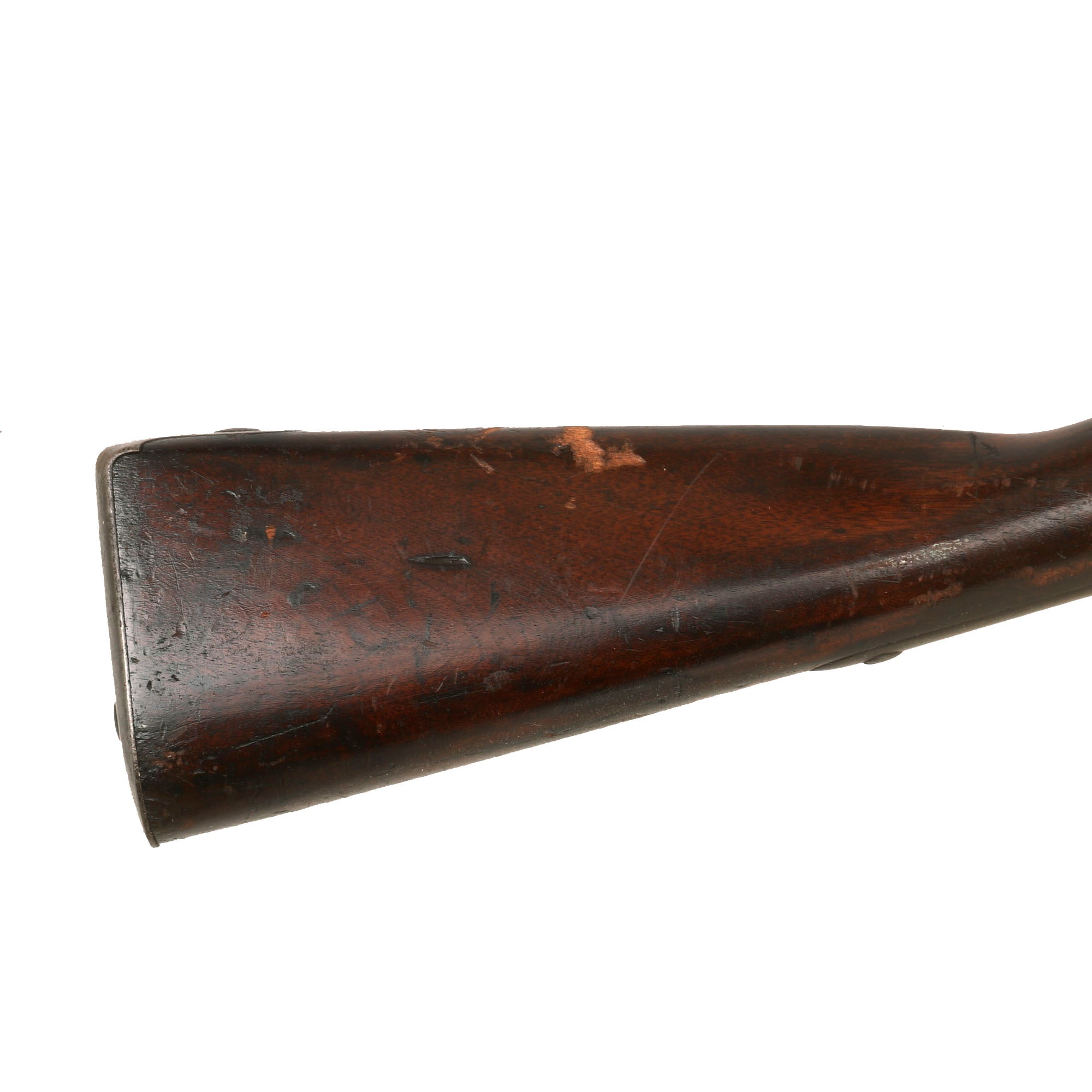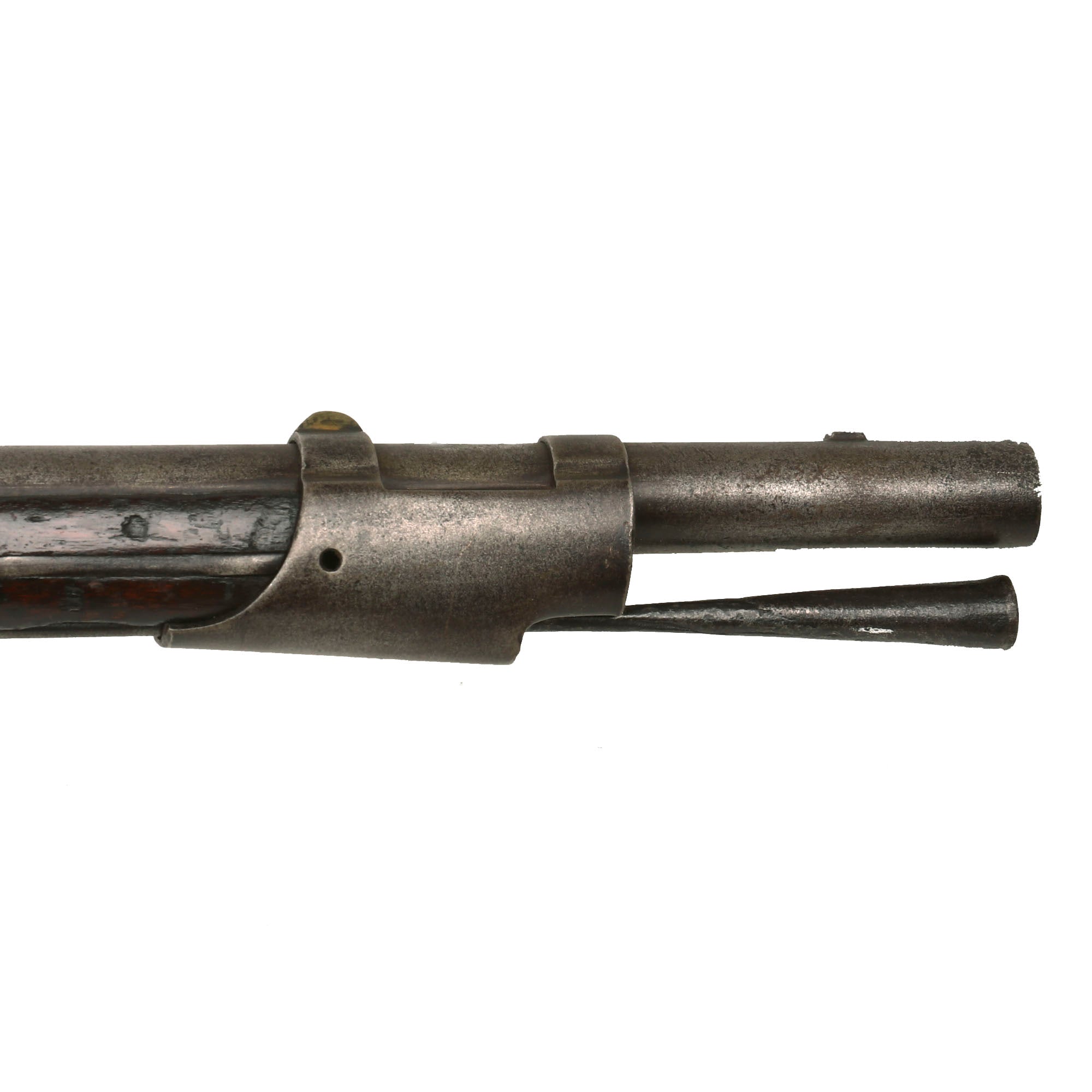 The stock is in very good shape with the usual scuffs and scratches from storage wear, but it still has a lovely color and looks great. It looks to have been varnished at some point, which really makes the grain "pop", though after that it did incur additional wear from storage. There is a small crack to the rear the lock plate but it doesn’t seem to be serious, and there is another running from the rear lock screw to the breech, a very common place for stress cracks. Both sling swivels are present, with the trigger guard swivel being rust frozen at present. The trumpet shaped ramrod is still present under the barrel.