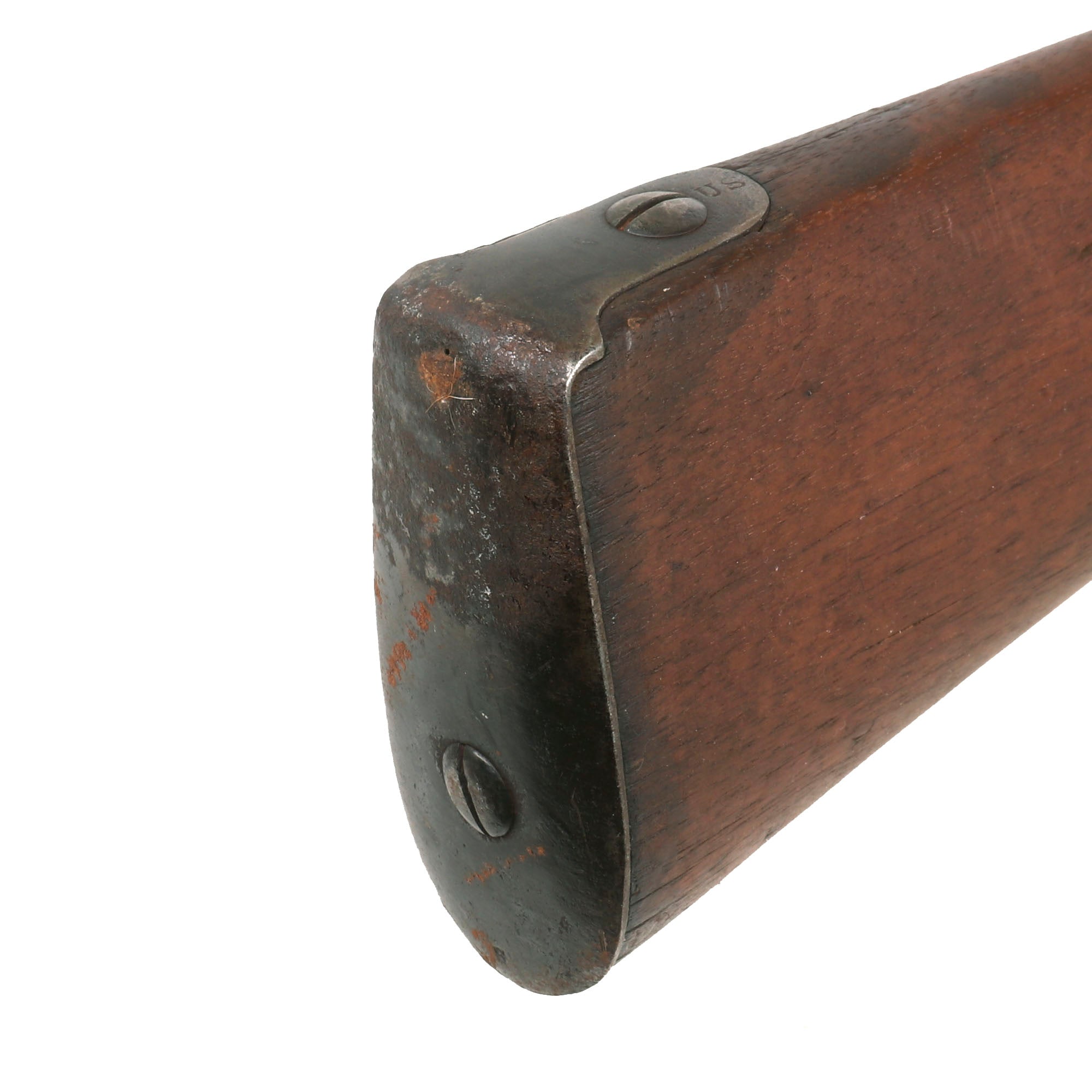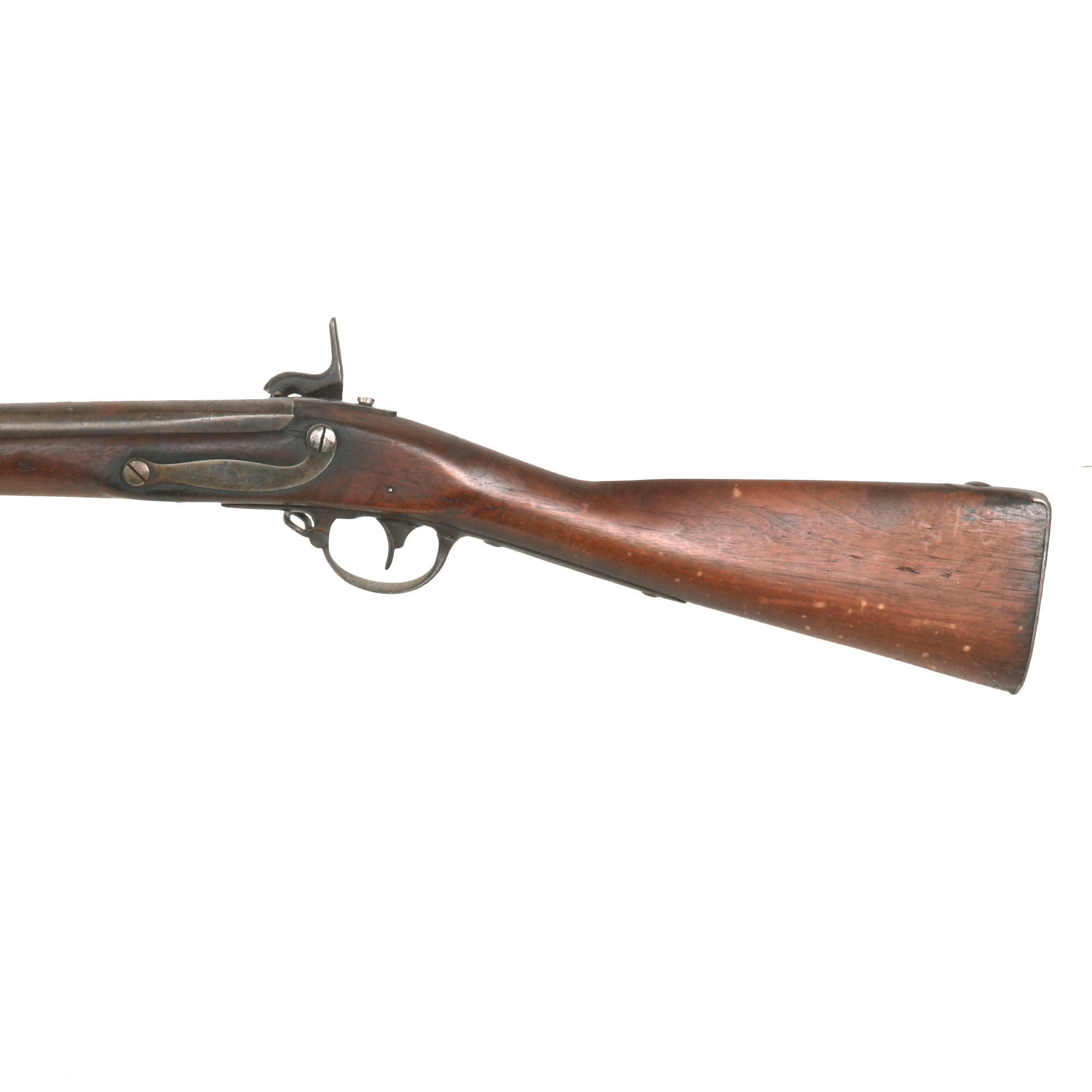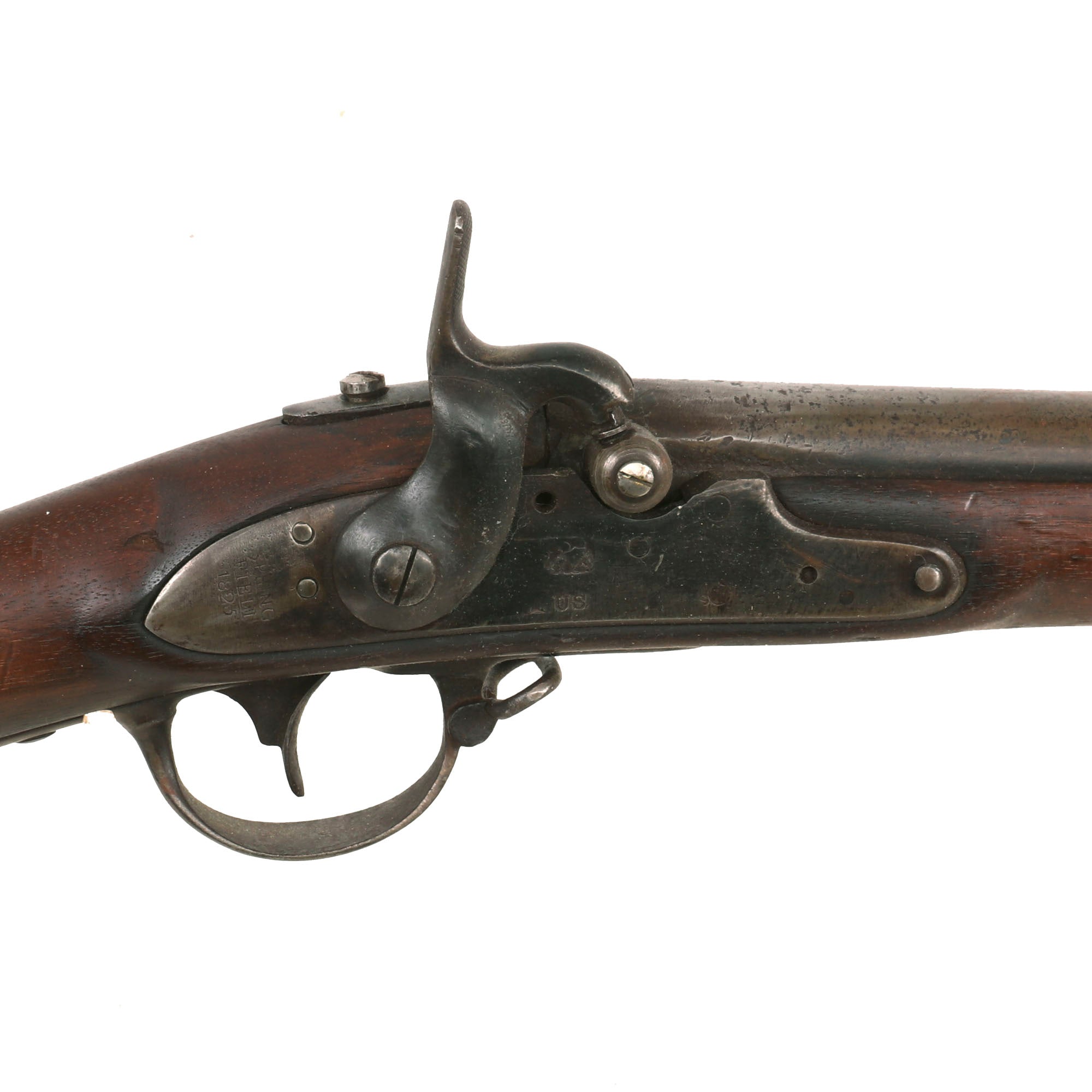 This example looks to originally have had a "Belgian" conversion, but then later had that hole plugged, and a "barrel" style bolster attached to the right side of the barrel, complete with a clean out. None of the brass components of the lock still remain. Looking at the bolster, we suspect it was added post civil war, probably to see further use as a fouling piece. The musket was originally manufactured at the United States Armory and Arsenal at Springfield itself in 1825, as indicated by markings on the tail of the lock plate: