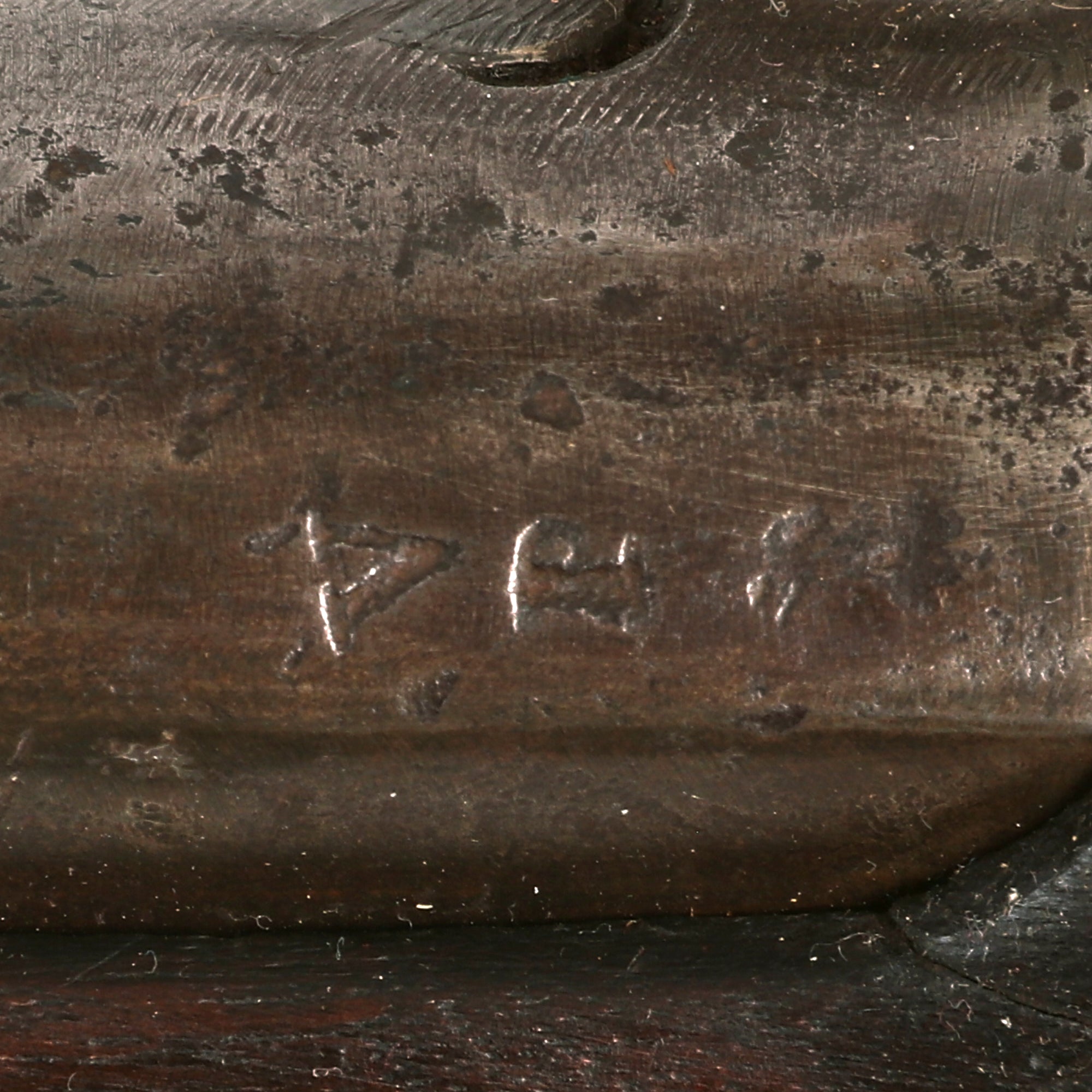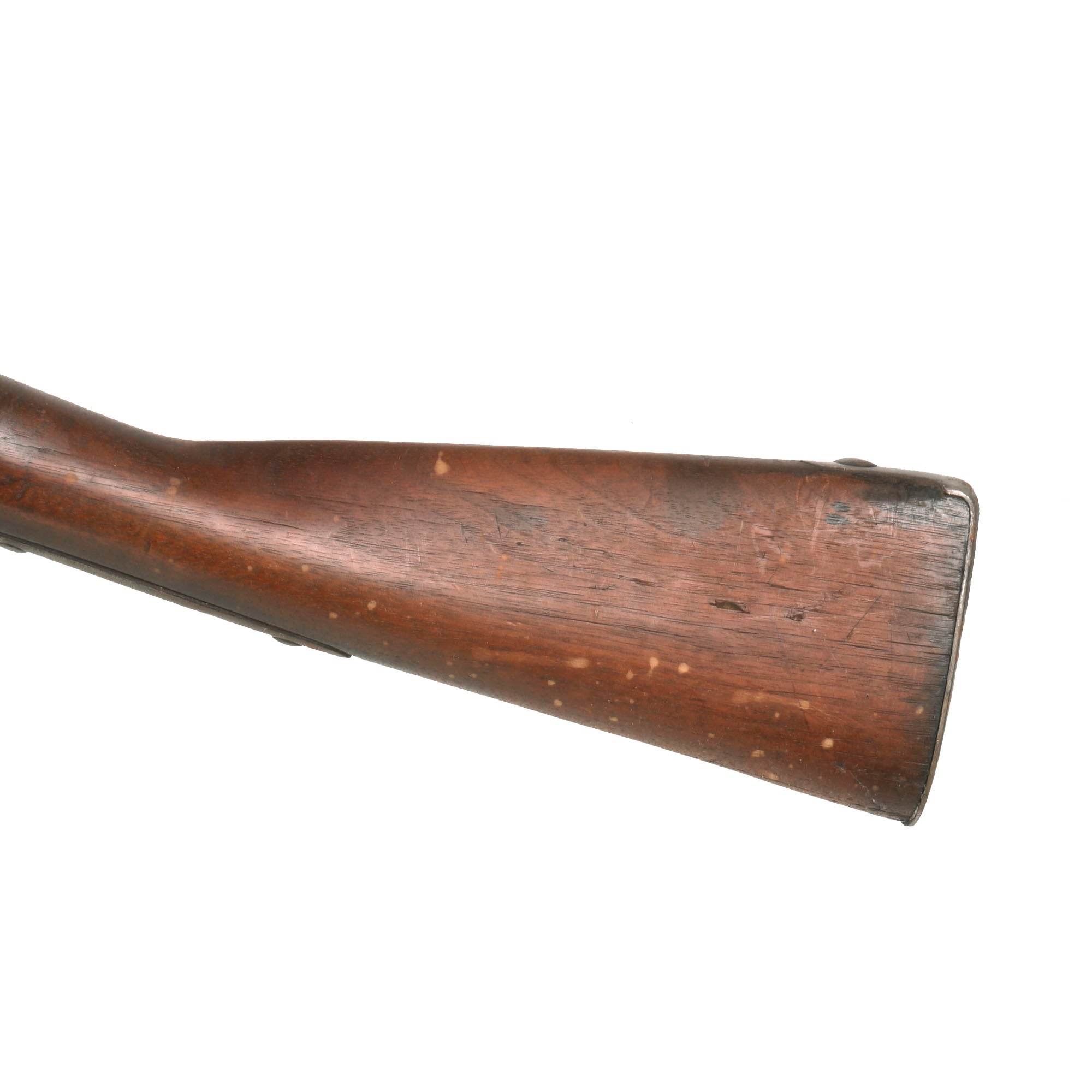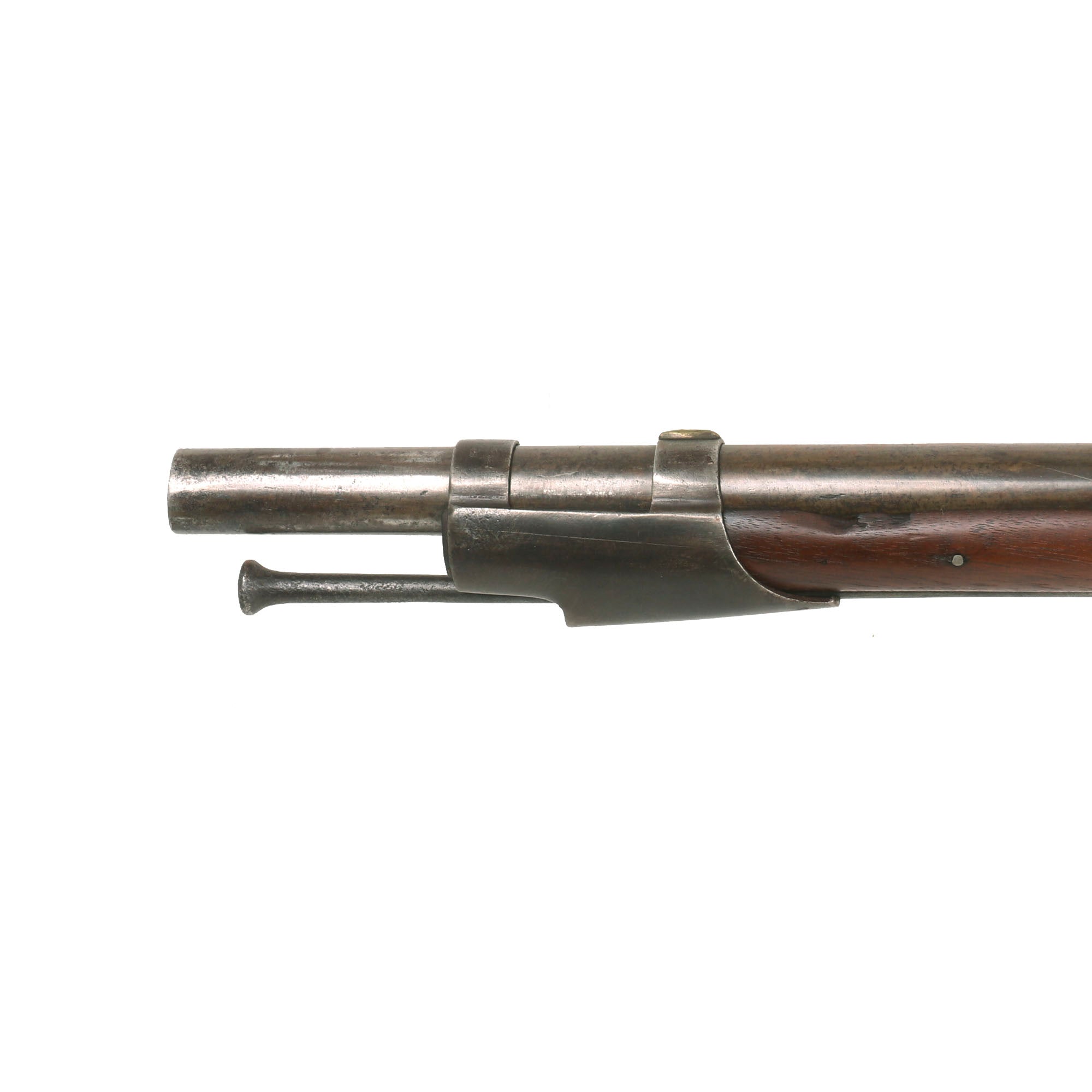 This example is in very nice display condition, with a lovely patina showing decades of careful cleaning after a long service life. The lock is functional, however the tumbler is quite worn, so it will fire at half cock, and does not hold at full cock. The barrel and metalwork display a peppery patina, from many years of slow oxidation and subsequent cleaning. The cap nipple cone and bolster are in very good condition, showing a lot less powder burn than the surrounding areas, which is what leads us to believe it was replaced after the war.
