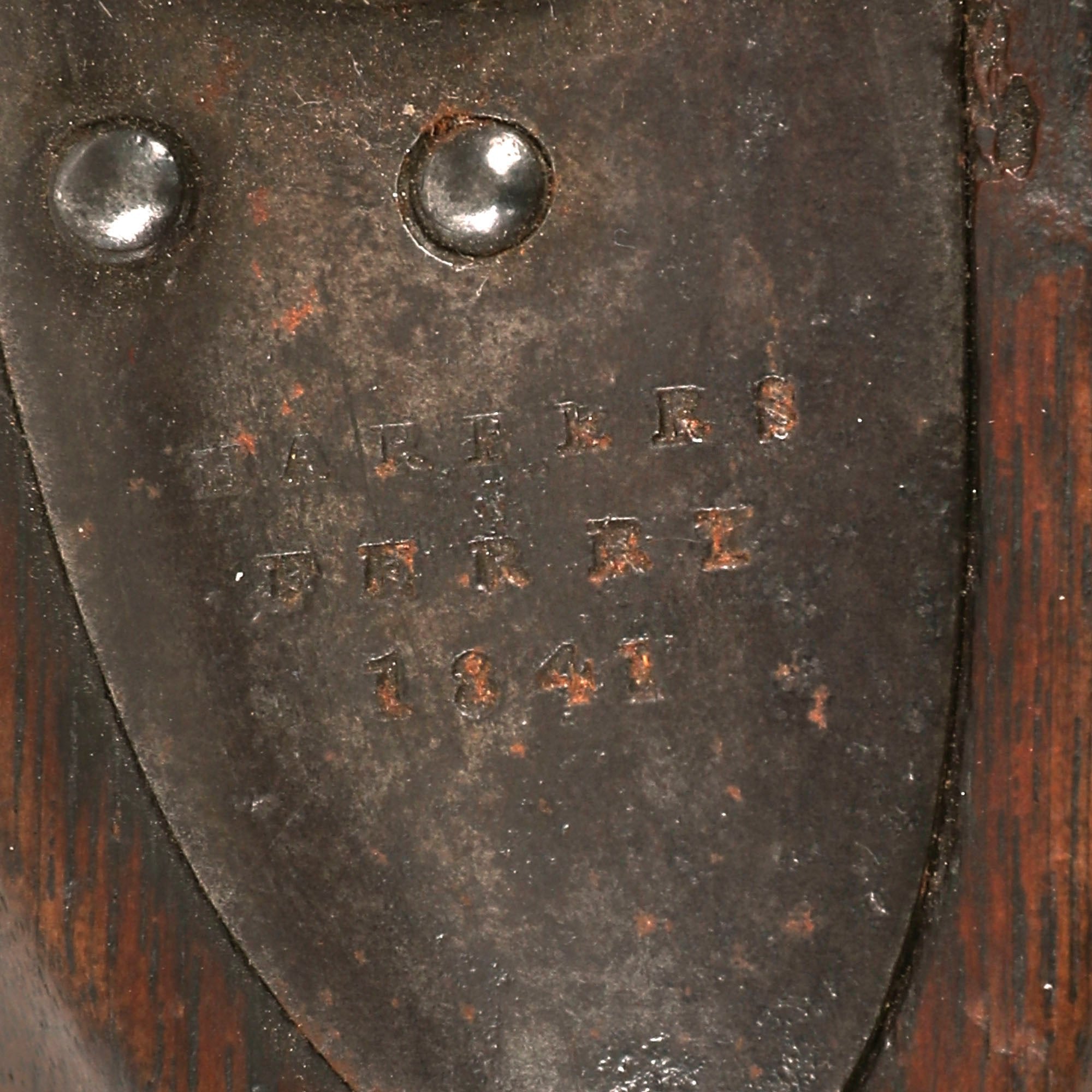 The Model 1840 was mainly an incremental improvement over the earlier model 1835. The main differences were a buttstock with a comb top, and also a thicker walled barrel. It was foreseen that eventually many of these muskets would be converted to Rifled Muskets, so the models 1840 and 1842 featured these barrels. The Model 1842 was the first U.S. musket to be produced with a percussion lock, though most of the Model 1840 flintlocks ended up being converted to percussion locks before reaching the field. This example looks to have escaped conversion just after production, and was used as a flintlock for some time. This makes it a very late production example, made after the changes were officially in progress.