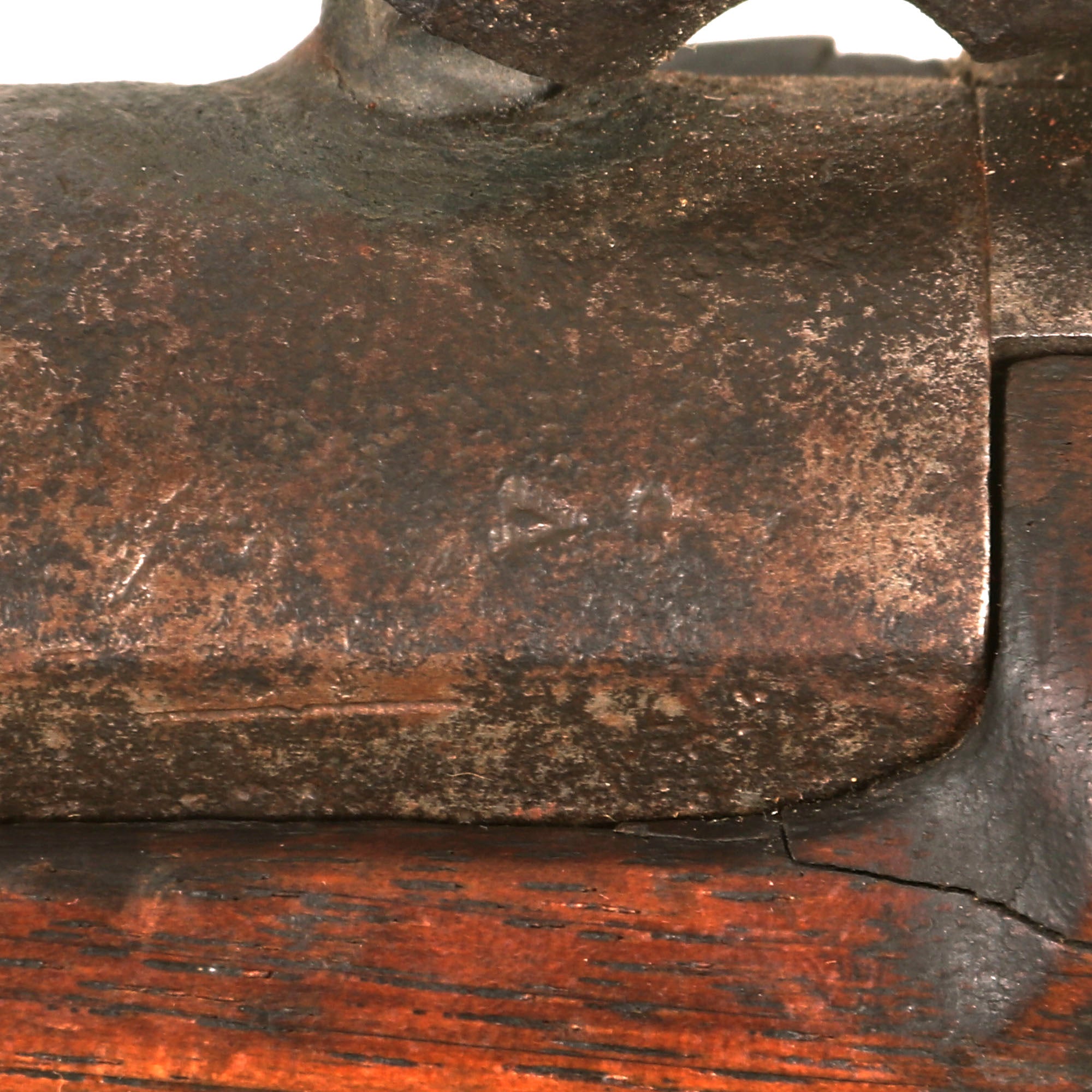 The lock is fully functional, holding at half cock and firing at full, and the main spring is still quite strong.. The stock is in very good condition as well, with the lovely brown color of oiled aged walnut. There are the expected dents and dings from service and storage, but no major issues or repairs we can see. There is some staining near the butt plate due to possible water and rust exposure.