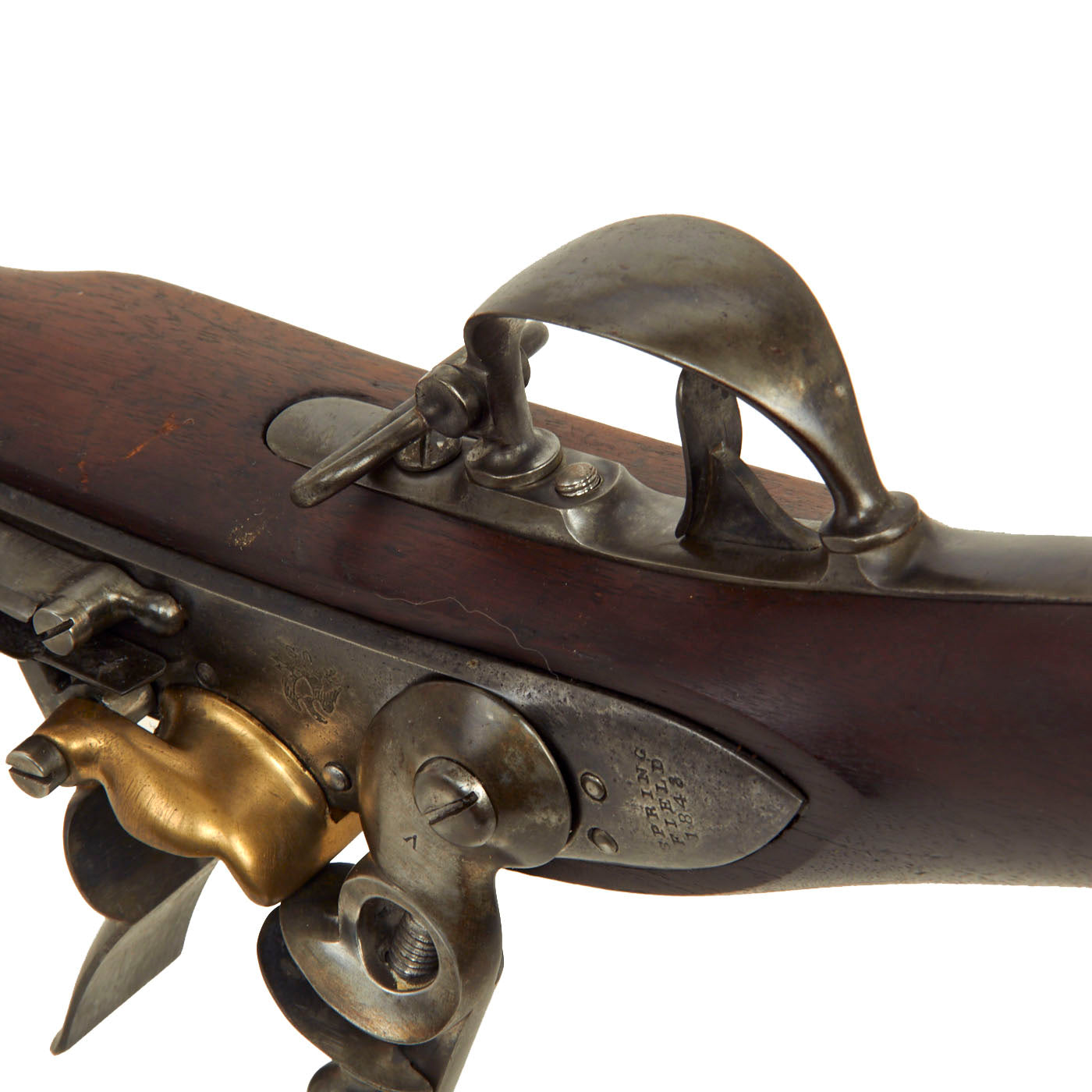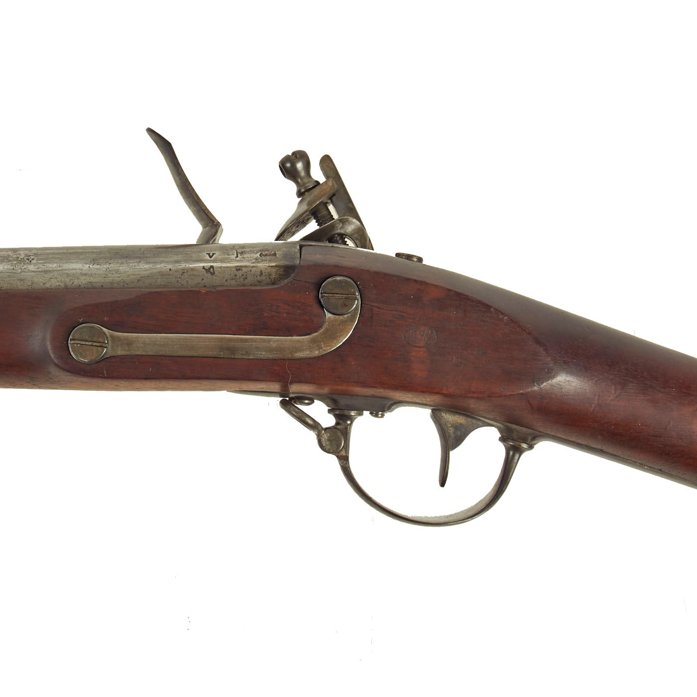 The Model 1840 was mainly an incremental improvement over the earlier model 1835. The main differences were a buttstock with a comb top, and also a thicker walled barrel. It was foreseen that eventually many of these muskets would be converted to Rifled Muskets, so the models 1840 and 1842 featured these barrels. The Model 1842 was the first U.S. musket to be produced with a percussion lock, though most of the Model 1840 flintlocks ended up being converted to percussion locks before reaching the field. This example however escaped conversion, and is a very late production example, made after the changes were officially in progress. Probably one of the last flintlock muskets ever produced at Springfield!