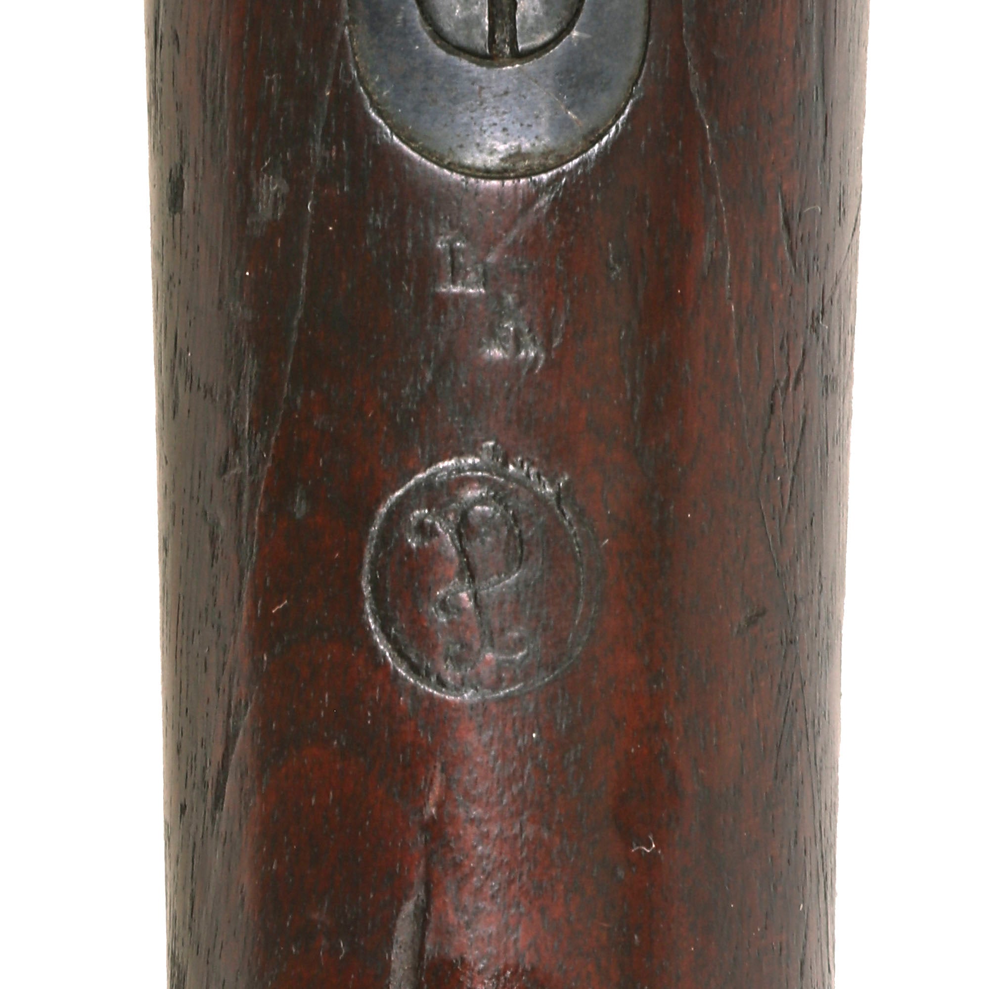 Research reveals that serial number 23975 dates to time of manufacture of late 1895, the second year of production. Due to the U.S. fiscal year starting in July, this was considered 1896 in Springfield Armory records. It has the correct second pattern front barrel band with double straps on top, the later bolt with the extractor with pin and the receiver has also been altered for the extractor pin. It has a nice circled "P" proof behind the trigger guard, indicating the barrel has passed the overpressure testing. It also has a faint "boxed" stock inspection cartouche that reads JSA / 1896, for inspector J. Sumner Adams, Master Armorer at Springfield.