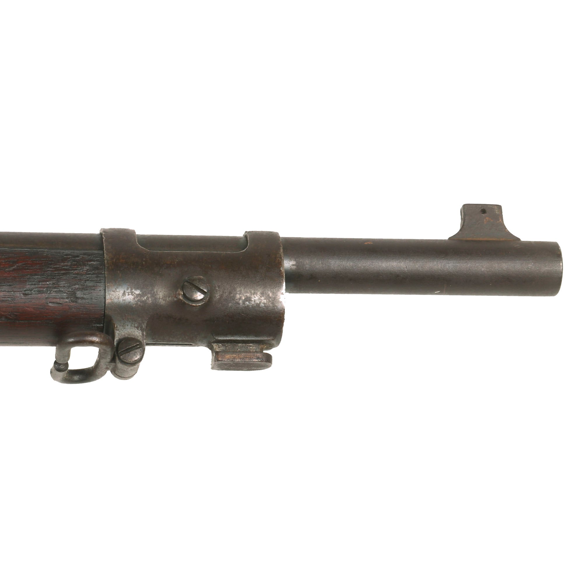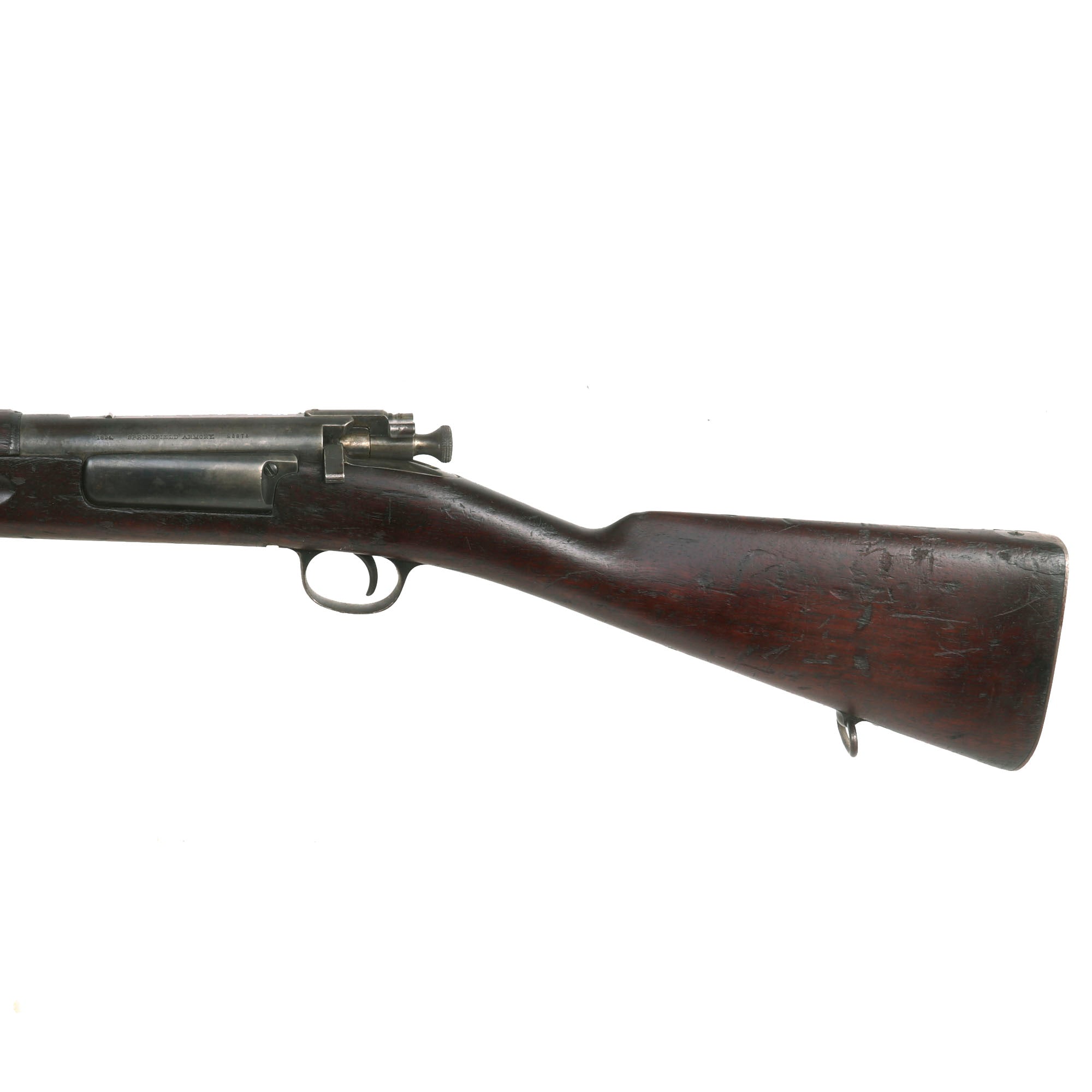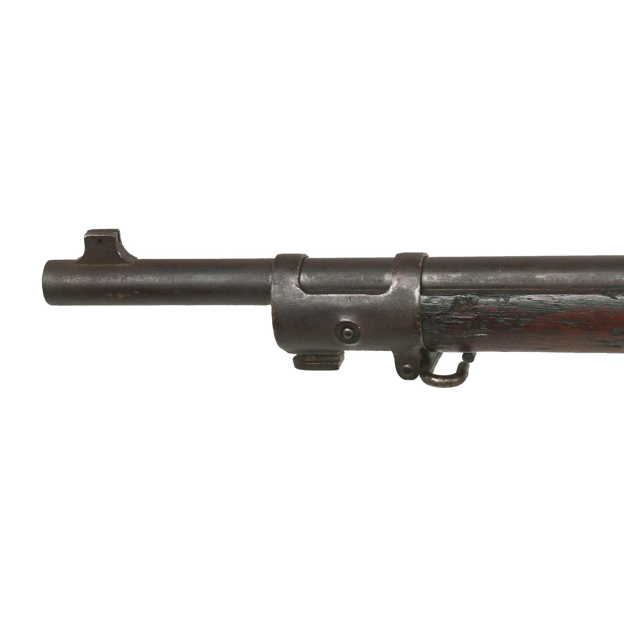 The stock is fitted with a M1896 solid smooth buttplate with a curved toe and butt-trap, which is empty. The barrel has been fitted with an updated Model 1896 rear sight, and the correct M1896 handguard, which meets the front edge of the receiver surrounding the sight. These are very desirable as a U.S. military service rifle as most of these rifles saw heavy use in the Spanish-American War and early 1900s until the development of the M1903 rifle.