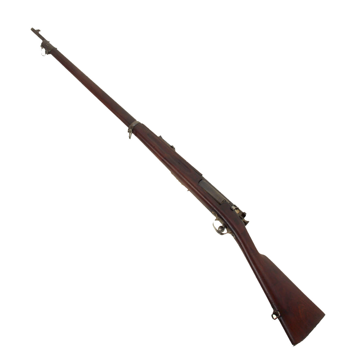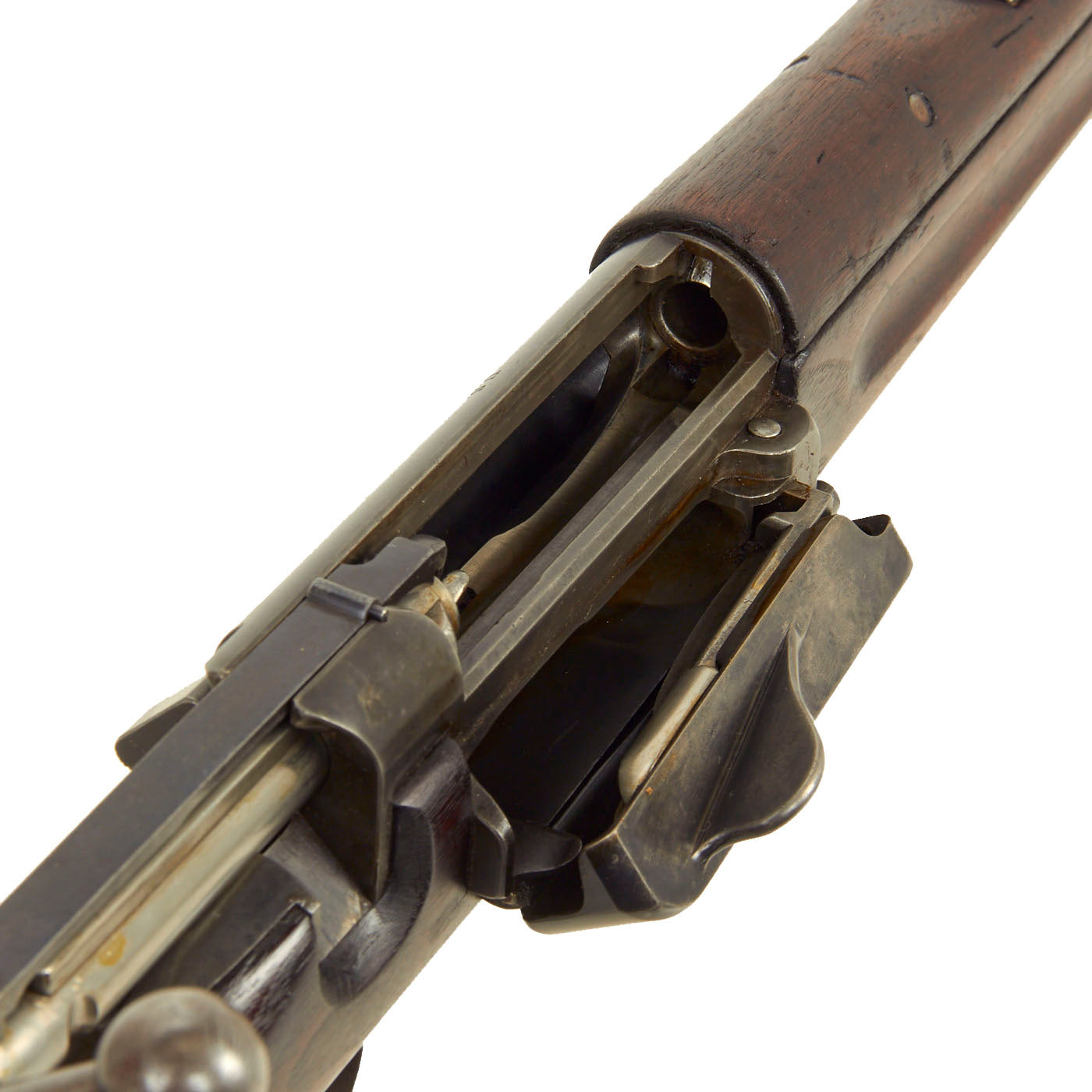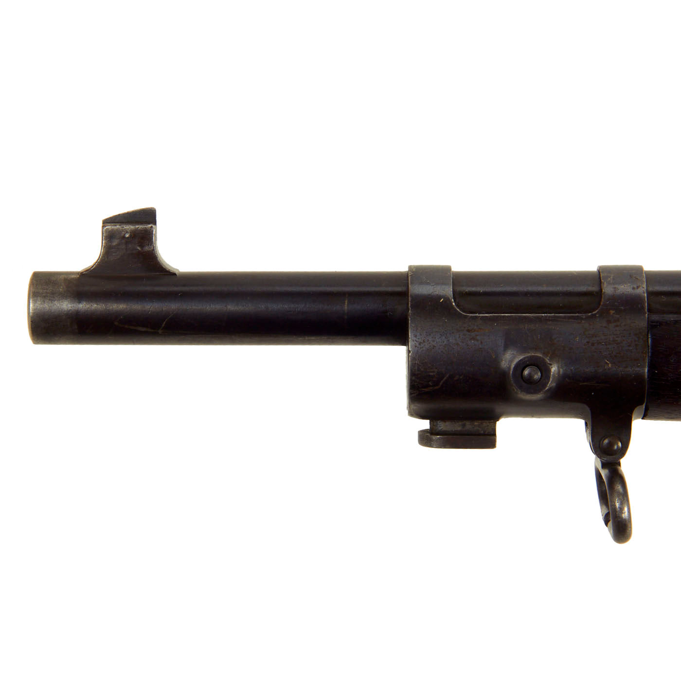 This example is one of those reconditioned to the M1896 configuration in arsenal. This involved changing the magazine cutoff to one that operates in down position, and adding three-piece cleaning rod is stored in a butt trap. The front cleaning rod was removed, and the groove in the stock filled with a wood plug, which can still be seen. We removed the front barrel band to check, and it is definitely a filled channel. The sight was then changed out for a M1896 sight, along with the correct upper forestock which meets the receiver.