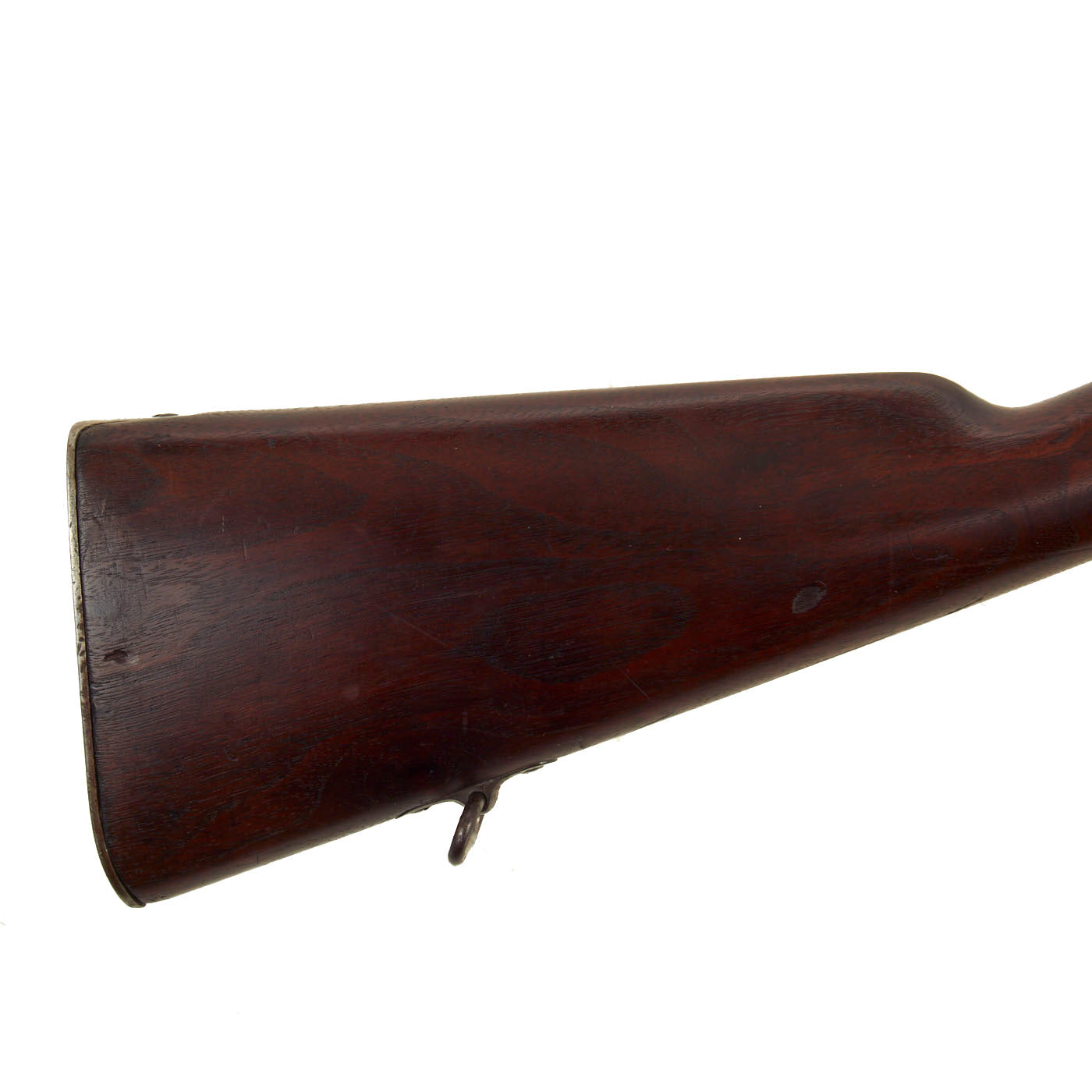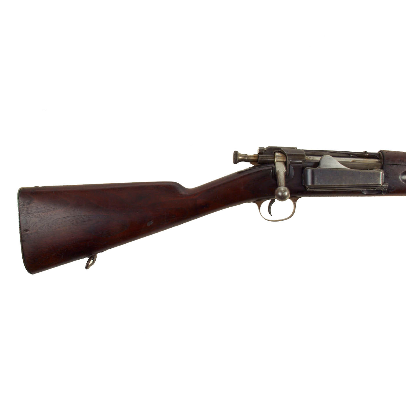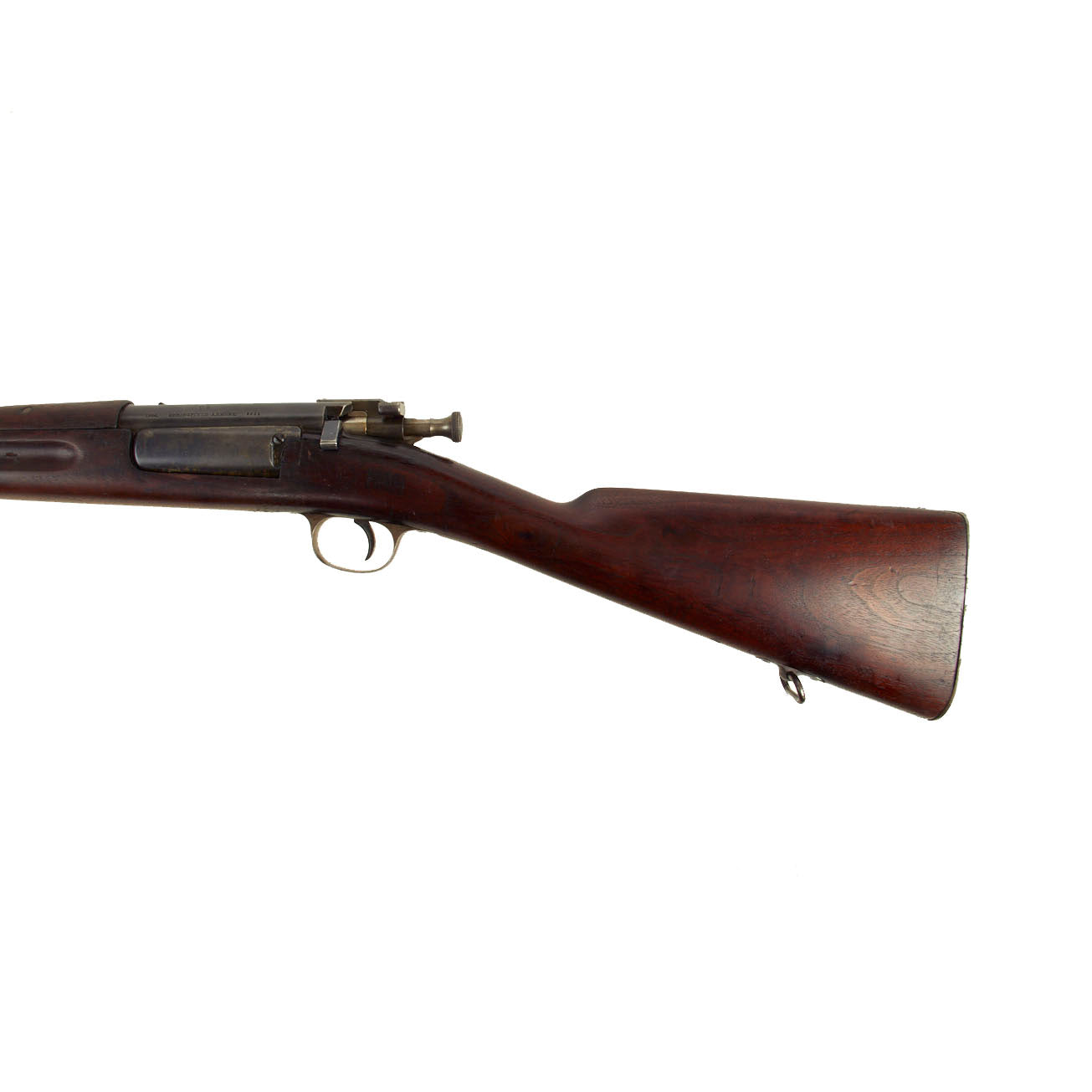 The stock is fitted with a M1896 solid smooth buttplate with a curved toe and butt-trap. The Butt trap is unfortunately empty on this example. The handguard meets the front edge of the receiver fitted with an upgraded model 1896 rear sight. These are very desirable as a U.S. military service rifle as most of these rifles saw heavy use in the Spanish-American War and early 1900s until the development of the M1903 rifle.