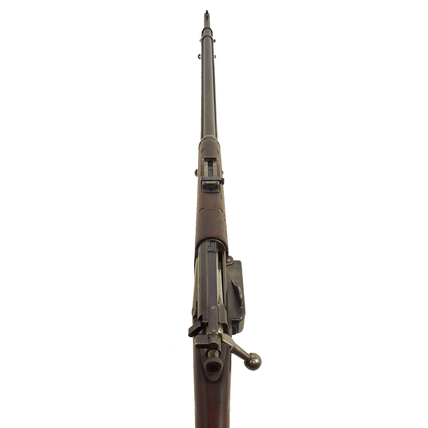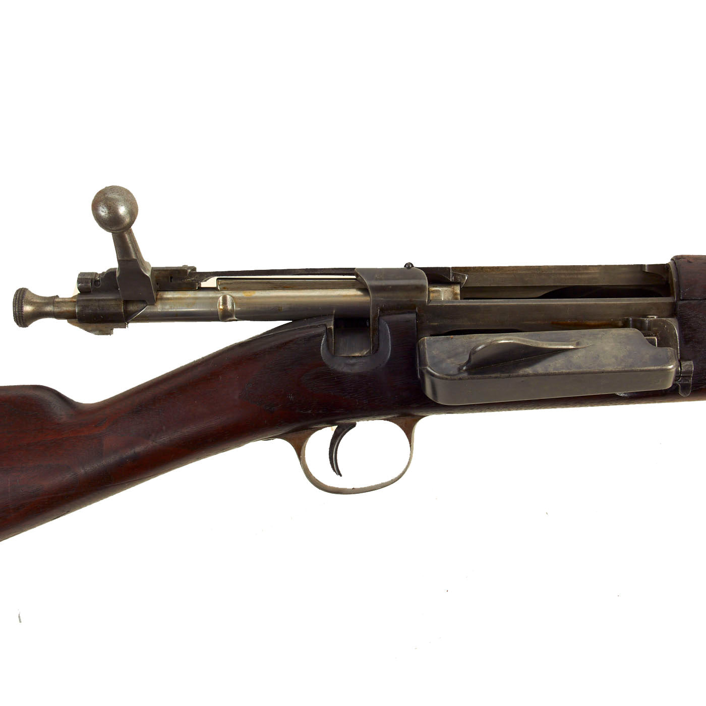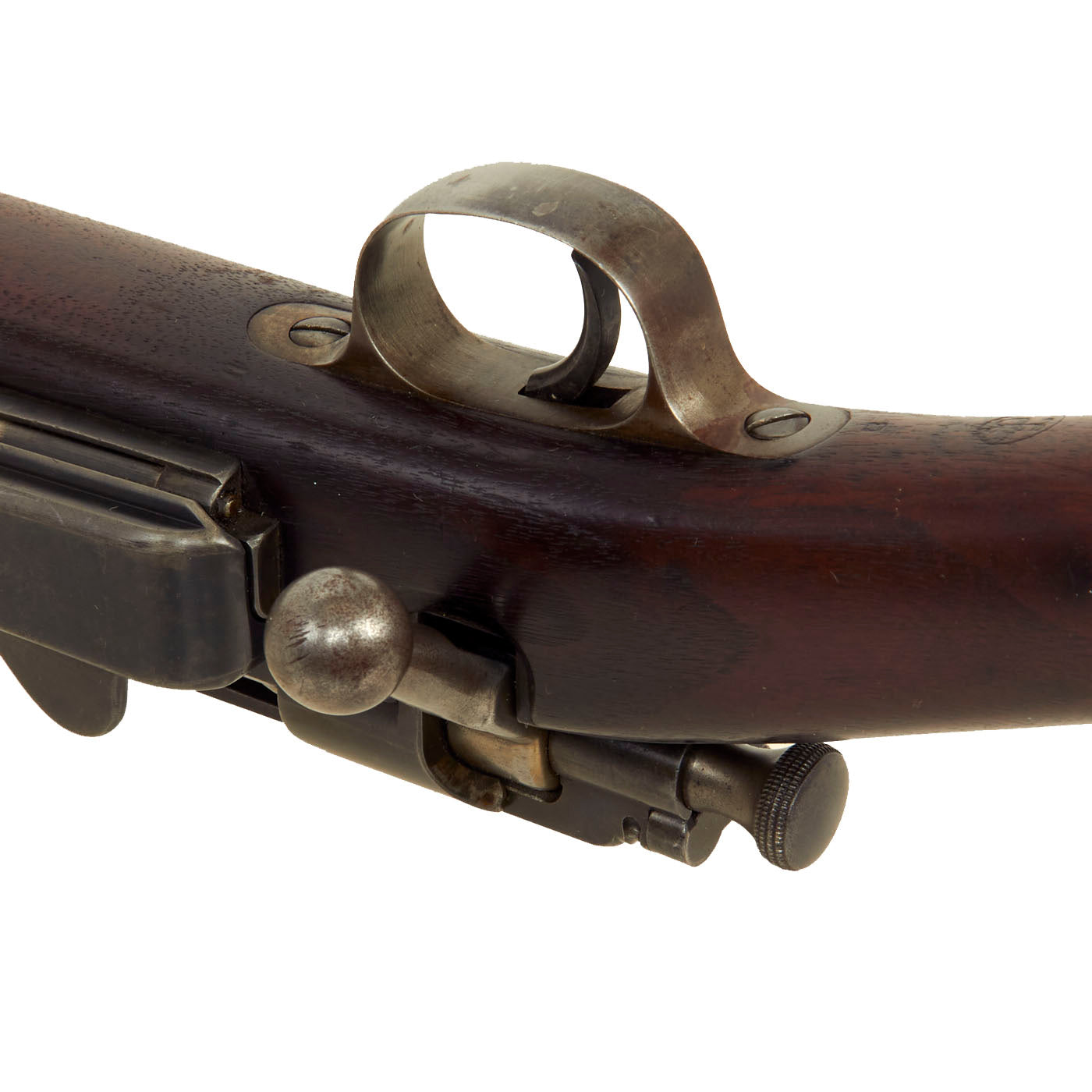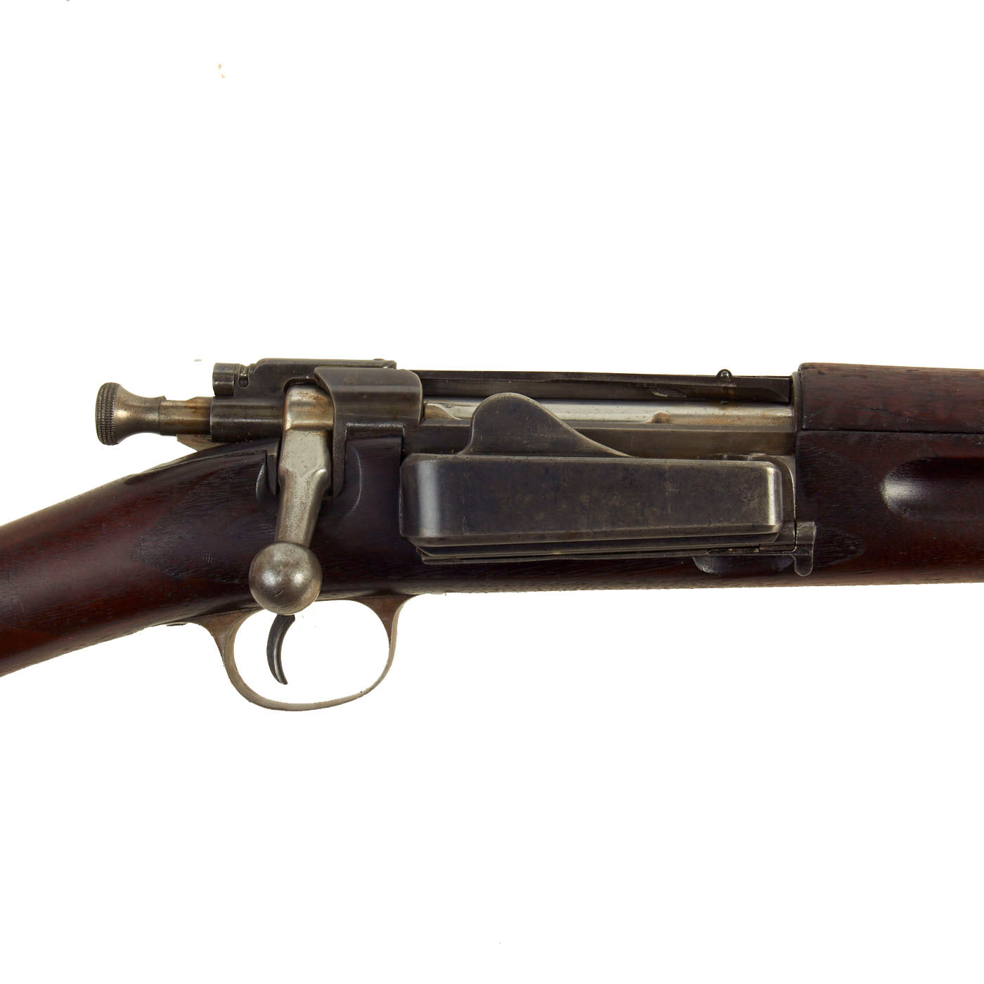 The stock is fitted with a M1896 solid smooth buttplate with a curved toe and butt-trap. The Butt trap is unfortunately empty on this example. The handguard meets the front edge of the receiver fitted with an upgraded model 1896 rear sight. These are very desirable as a U.S. military service rifle as most of these rifles saw heavy use in the Spanish-American War and early 1900s until the development of the M1903 rifle.
