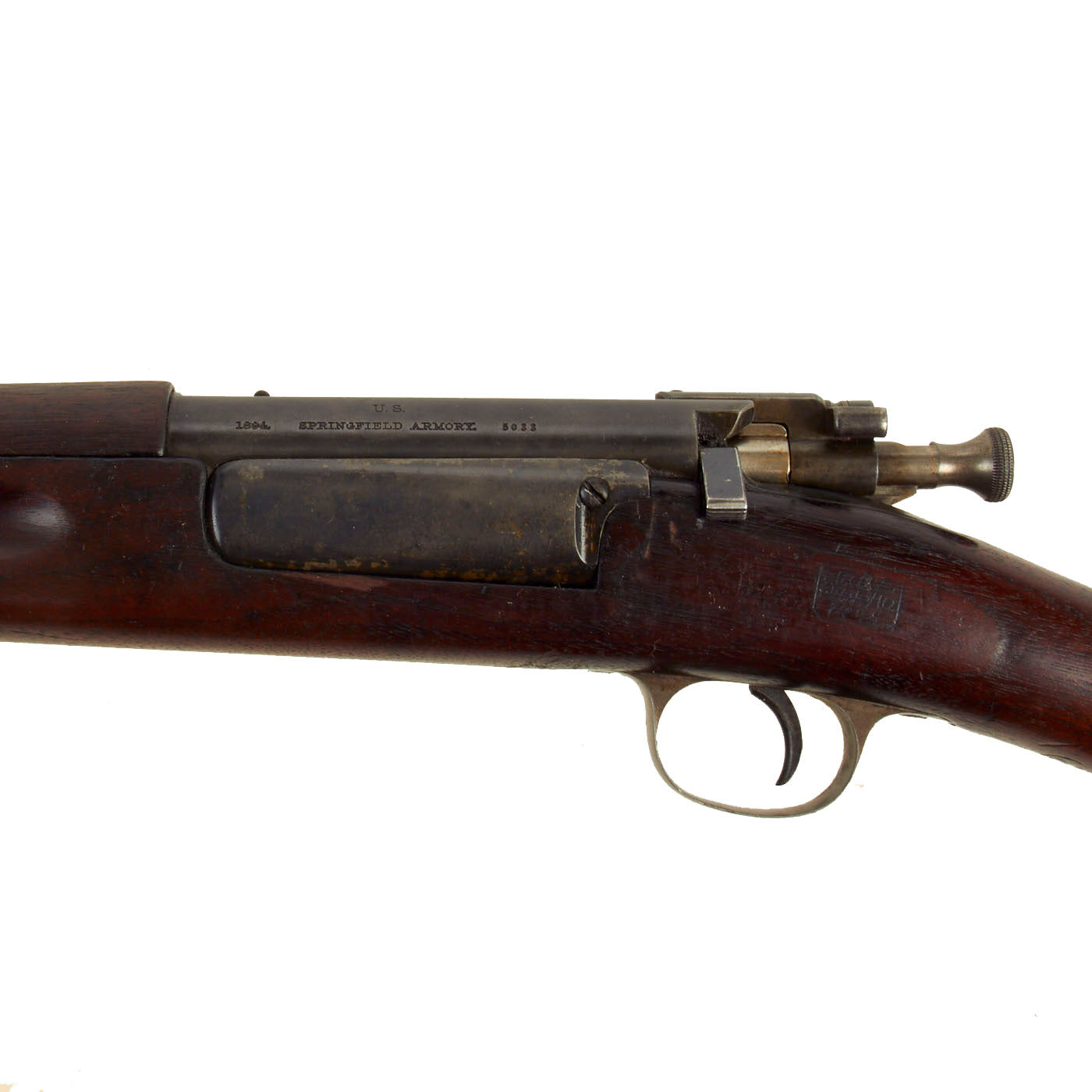 Research reveals that serial number 5033 dates manufacture to the second half of 1894, the FIRST year of production. Due to how the government kept records at the time, this was considered part of Fiscal Year 1895. This is definitely one of the earliest Krag rifles that we have had! It has the original style stock with the plugged cleaning rod slot, the second pattern front barrel band with double straps on top, the later bolt with the extractor with pin and the receiver has also been altered for the extractor pin. It still has a clear circled "P" proof behind the trigger guard, along with a more faint one underneath, indicating the barrel has passed the overpressure testing twice, once when it was made and once when it was converted. It also has a somewhat faint "boxed" stock inspection cartouche that reads JSA / 1895, for inspector J. S. Adams.