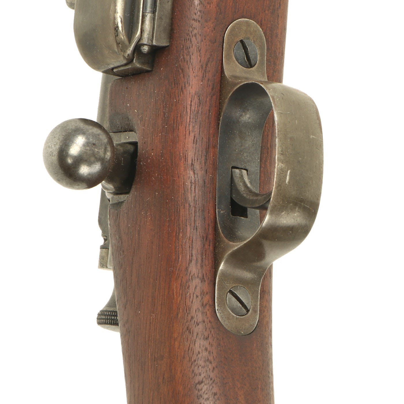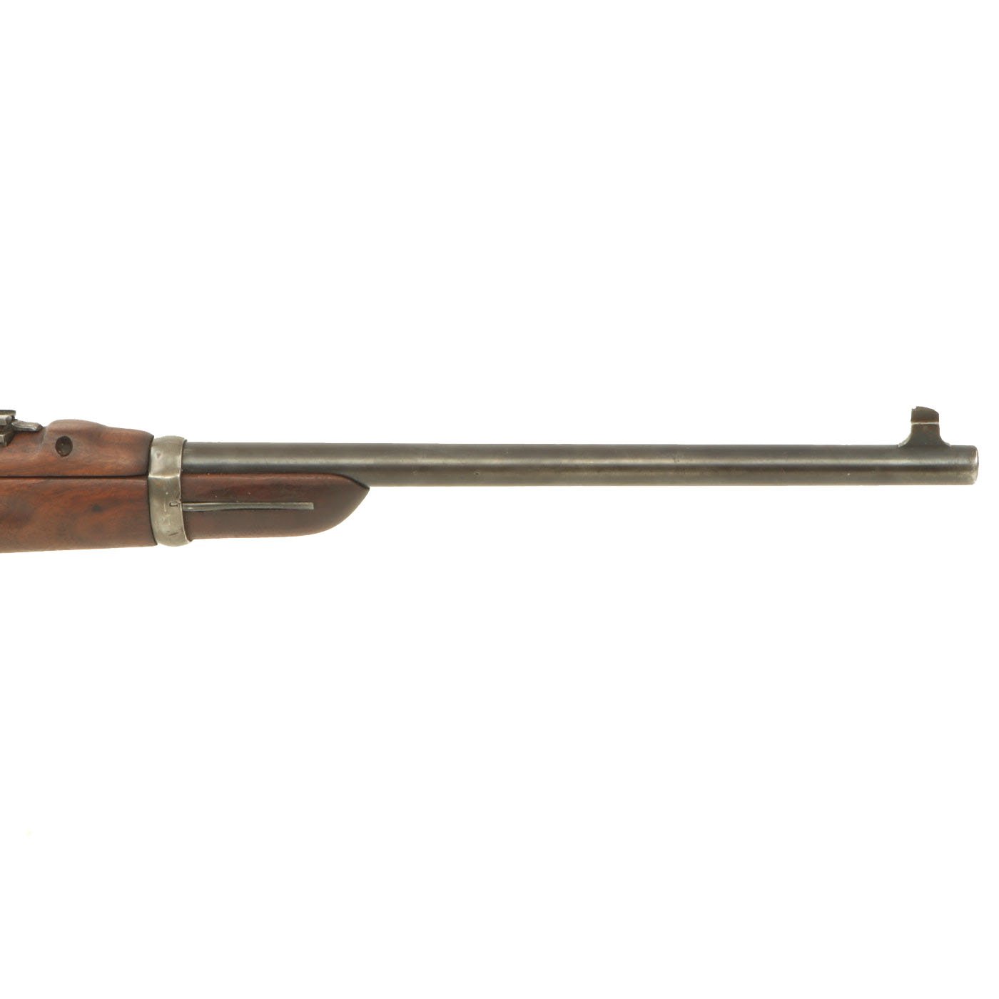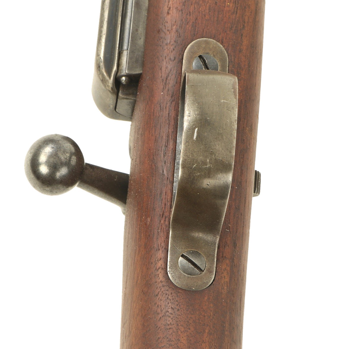 The Carbine Model 1896 features features the later bolt with the extractor with pin and the receiver is machined to work with the pin. The handguard meets the front edge of the receiver fitted with an upgraded M1901 rear sight. This is surrounded by the correct hand guard, with the barrel band sight guard directly in front to protect it. The stock is fitted with a M1896 solid smooth buttplate with a curved toe and butt-trap, which is empty. It still features the original 22 inch barrel, and has not been modified from the original issue configuration.