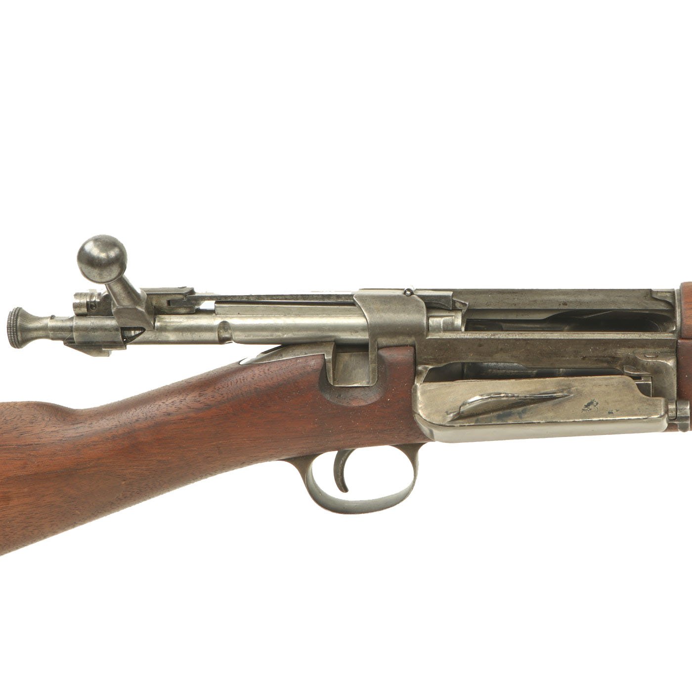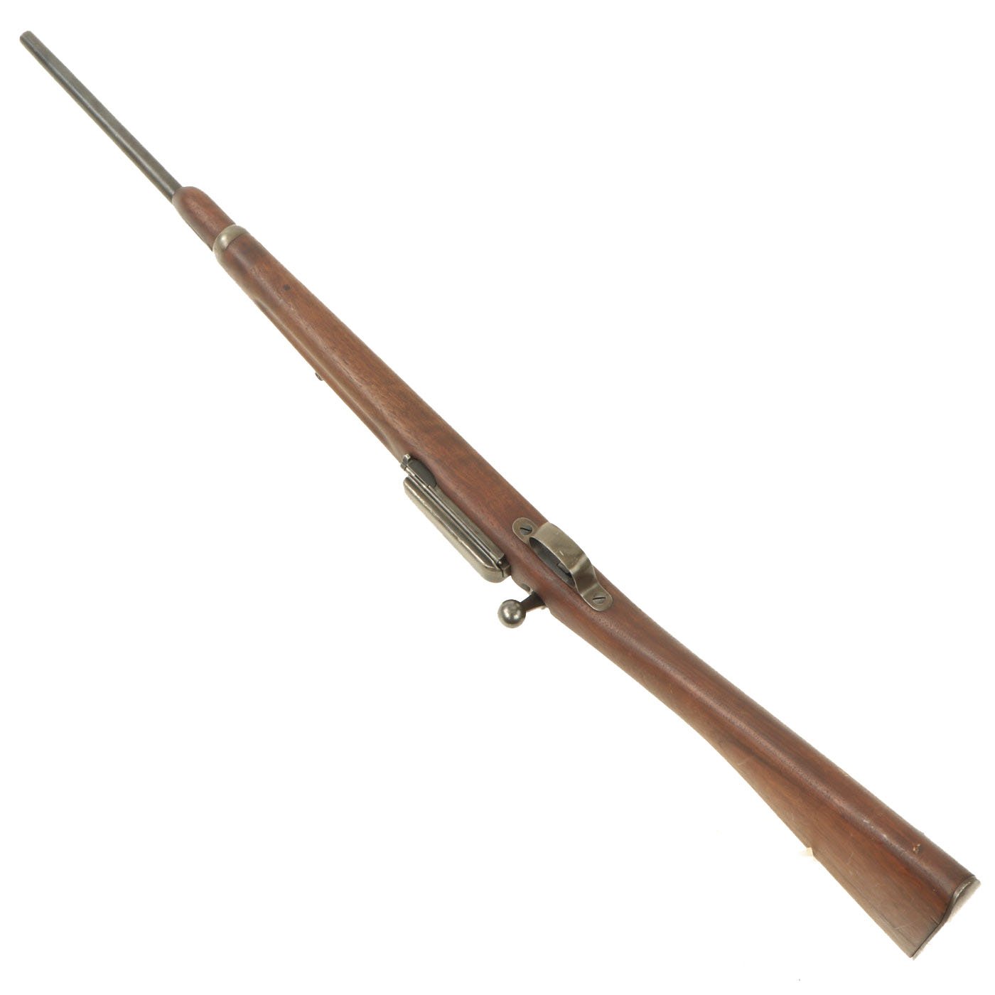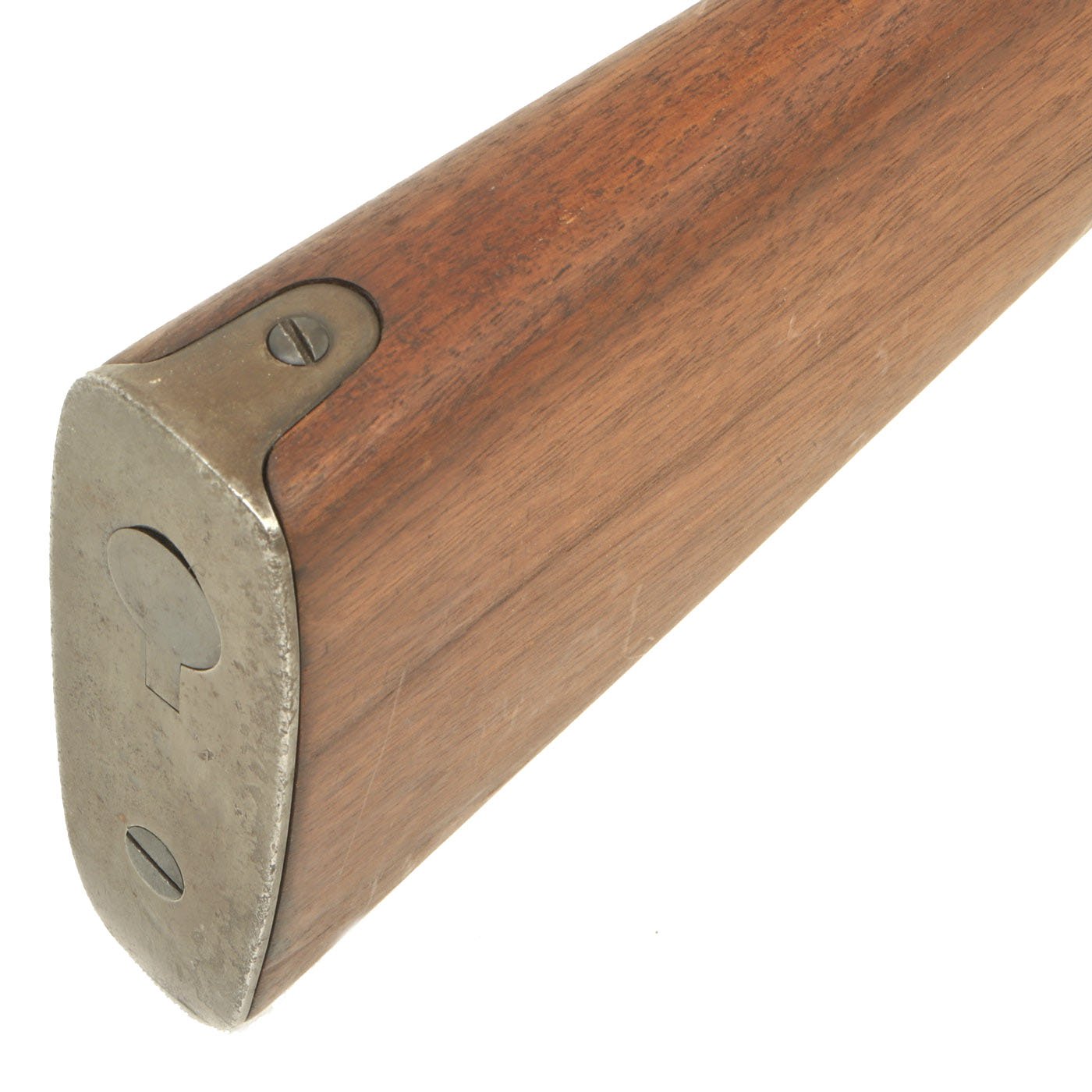 The Carbine Model 1896 features features the later bolt with the extractor with pin and the receiver is machined to work with the pin. The handguard meets the front edge of the receiver fitted with an upgraded M1901 rear sight. This is surrounded by the correct hand guard, with the barrel band sight guard directly in front to protect it. The stock is fitted with a M1896 solid smooth buttplate with a curved toe and butt-trap, which is empty. It still features the original 22 inch barrel, and has not been modified from the original issue configuration.